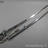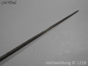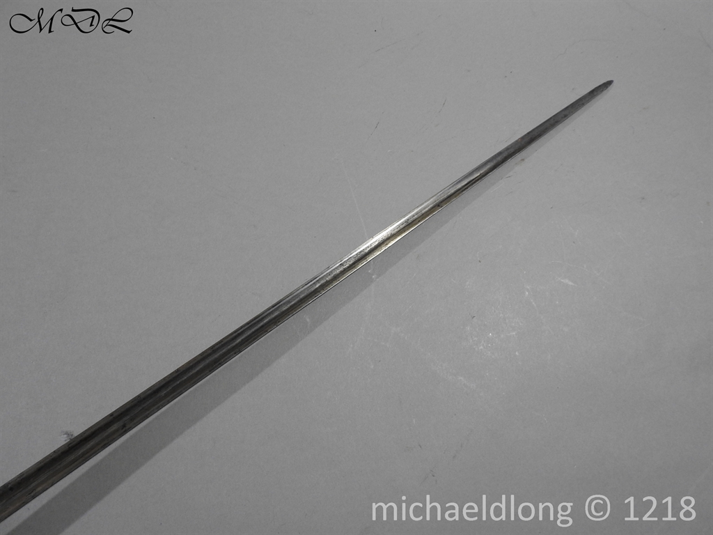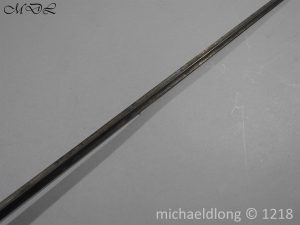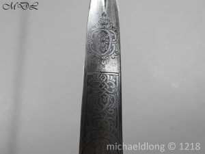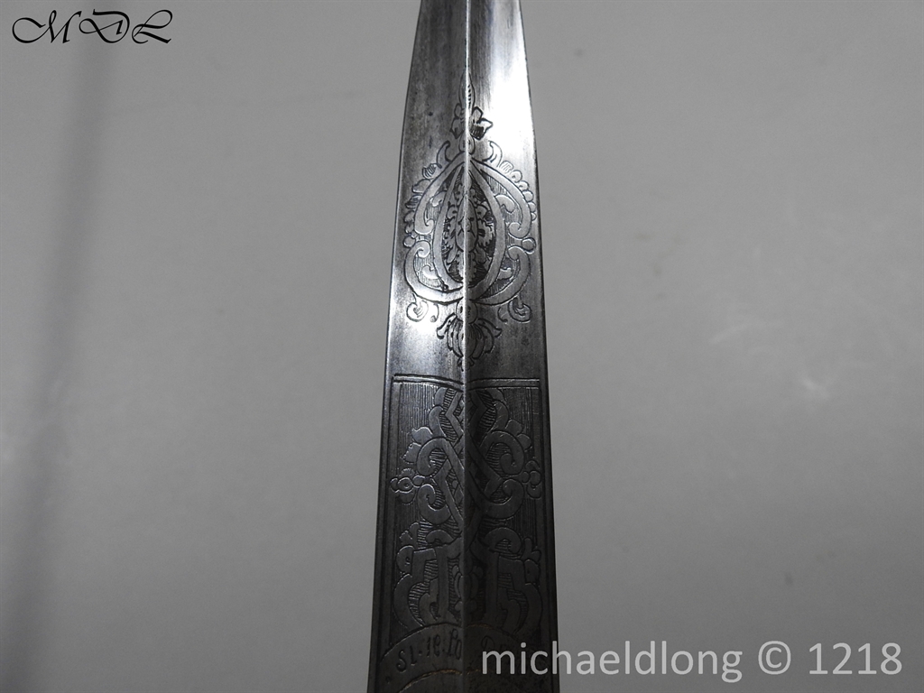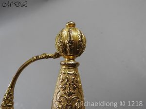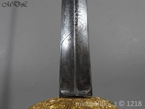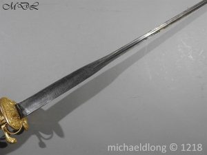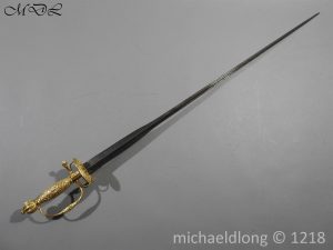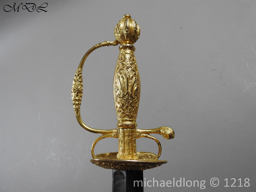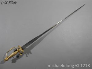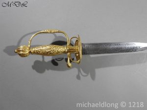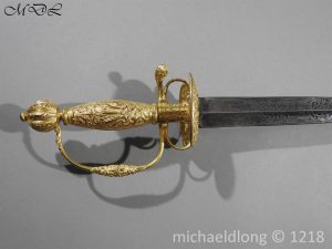 A French Gilt sword sword c 1780 with ornate gilt small sword hilt embossed with floral decoration and matching shell guard. The colichemarde blade is 85cm in length with age colouring. Engraved with floral decoration and sailing boat to center on each side which is surrounded by French inscription, the hilt retains 95% plus of the gilt finish with only a few raised area’s with wear overall a stunning sword.