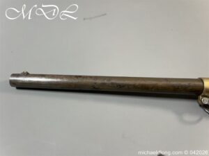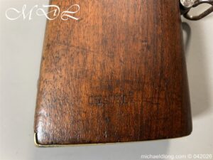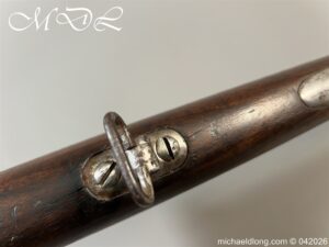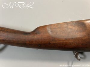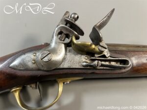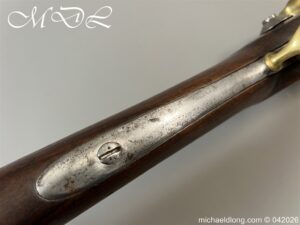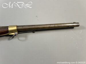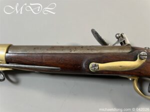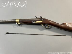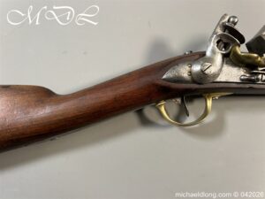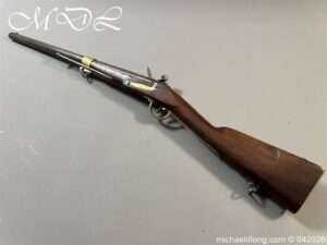 French Hussar – Light Cavalry Flintlock Carbine c 1830 – unsure of the exact model as no visible markings to barrel. The lock plate engraved Mre Rle de Chatellerault and the stock with cheek piece stamped CHATELL . Brass furniture with inspection stamps and the butt cap marked H8 possibly 8th Hussars. The side of the stock has been professionally infilled where the saddle bar would have been fitted and there is no fitting on the front brass mount to secure the bar in place. The stock has also been altered to accommodate the fitting and securing of a steel ramrod. Barrel length 50cm overall 87cm. UK shipping Free, internationally at cost