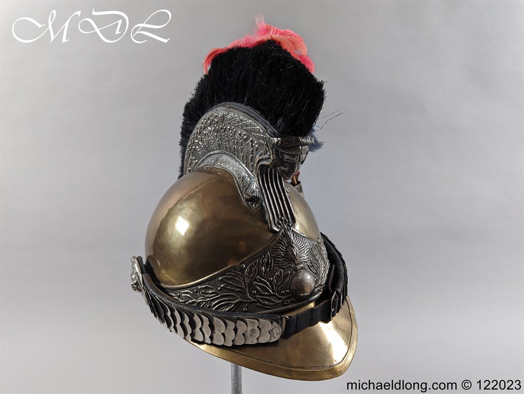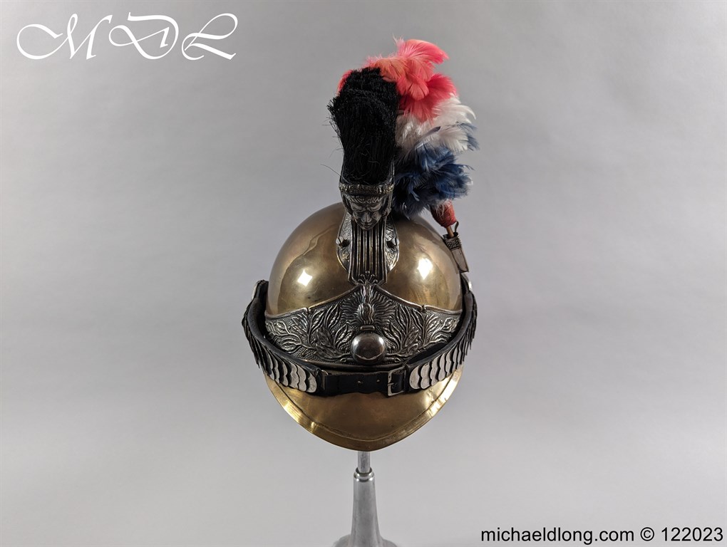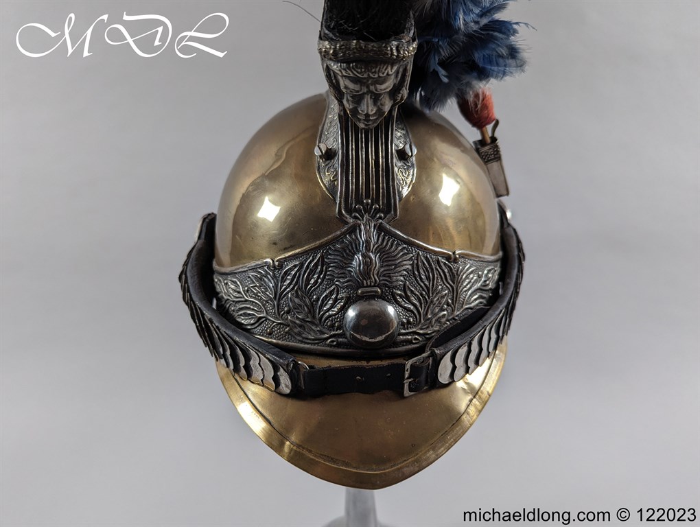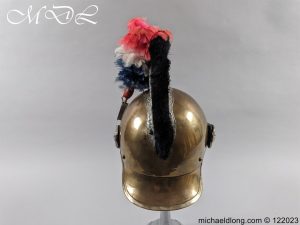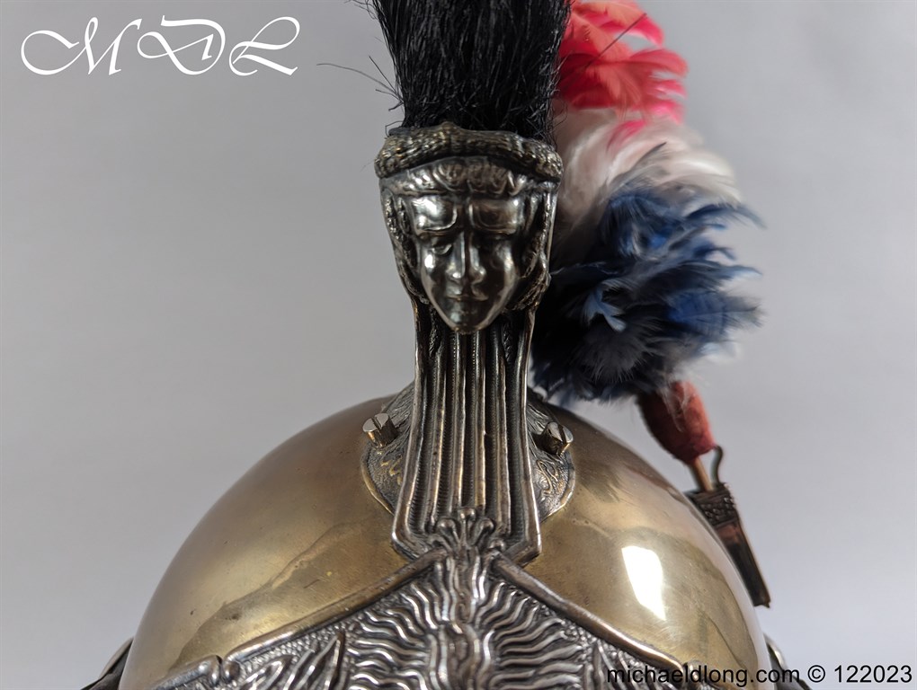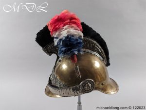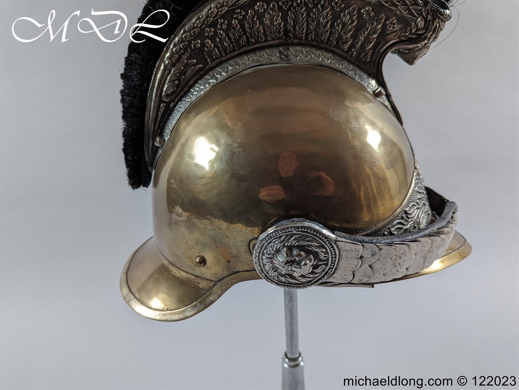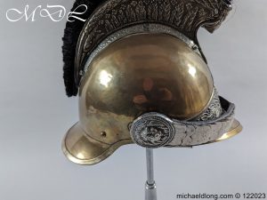 French Mounted Officers Gendarmerie helmet in good condition, brass shell with silver metal badge and comb. Medusa head to front. Brush plume. Silvered scale chin straps with lion head bosses. Complete with original leather lining, compete with side plume holder and plume