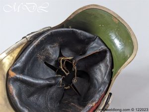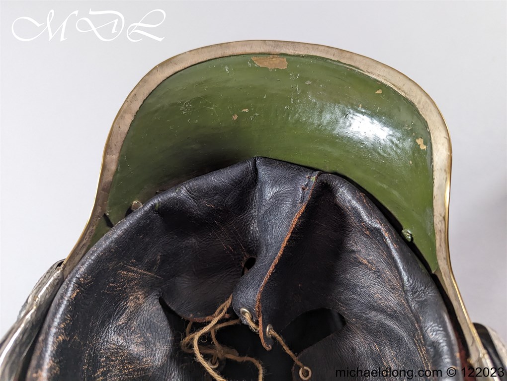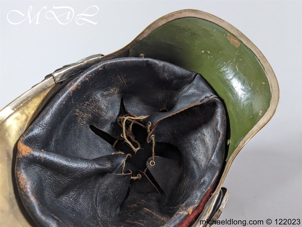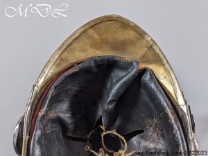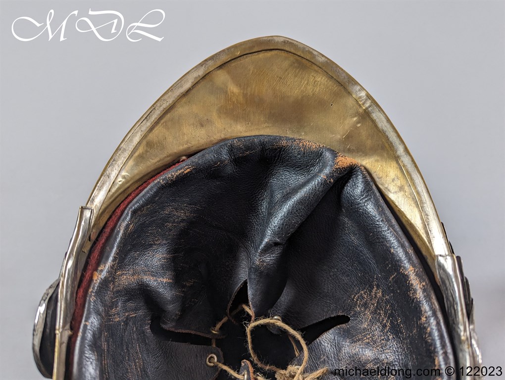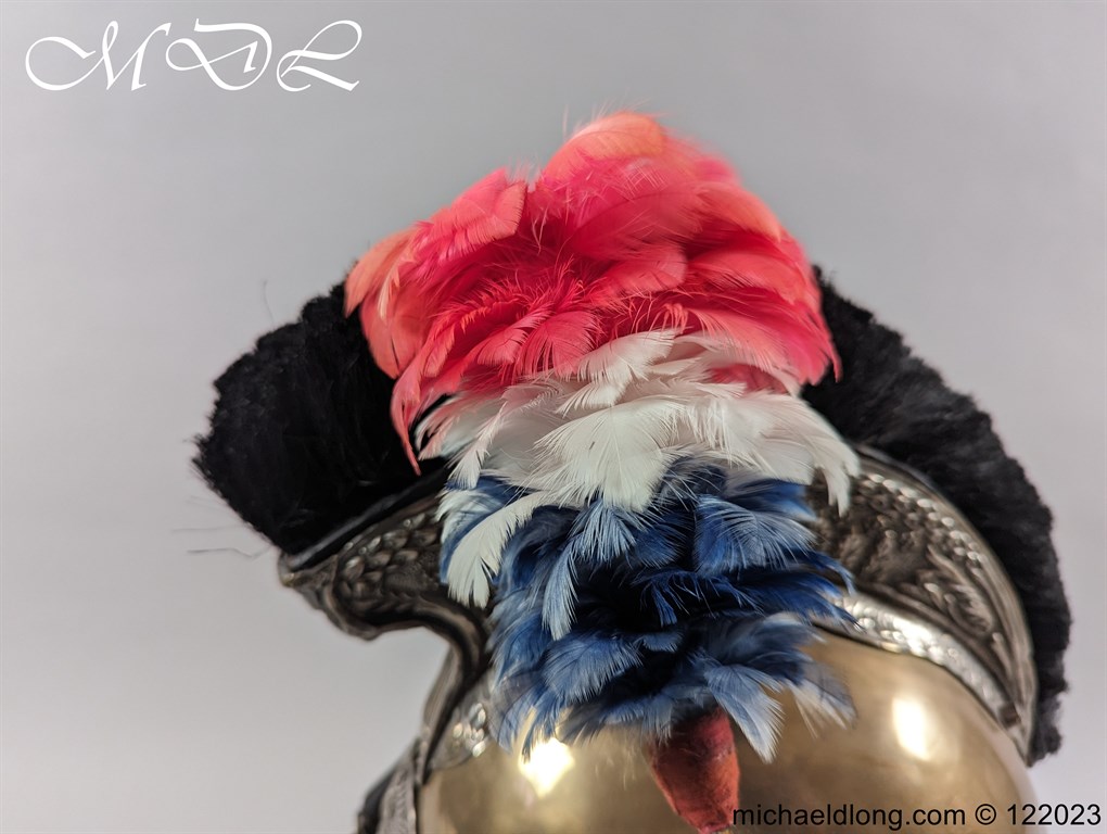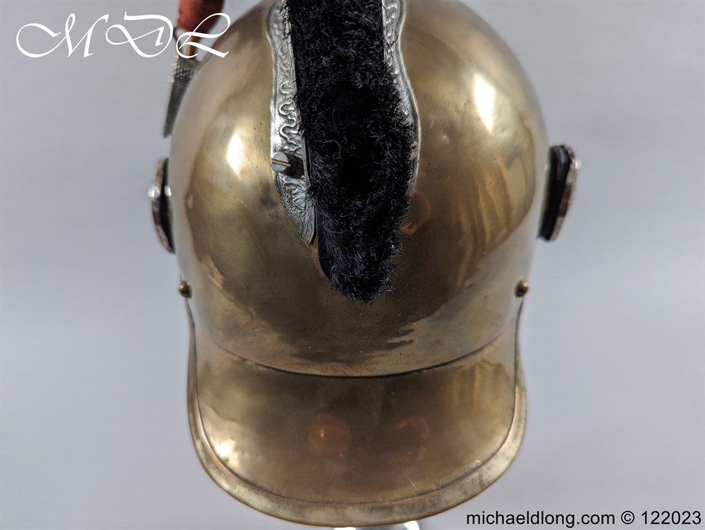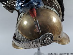 French Mounted Officers Gendarmerie helmet in good condition, brass shell with silver metal badge and comb. Medusa head to front. Brush plume. Silvered scale chin straps with lion head bosses. Complete with original leather lining, compete with side plume holder and plume