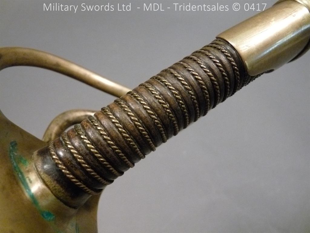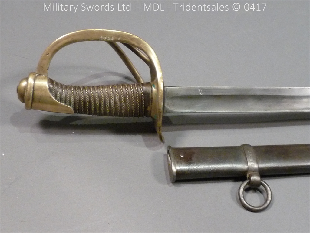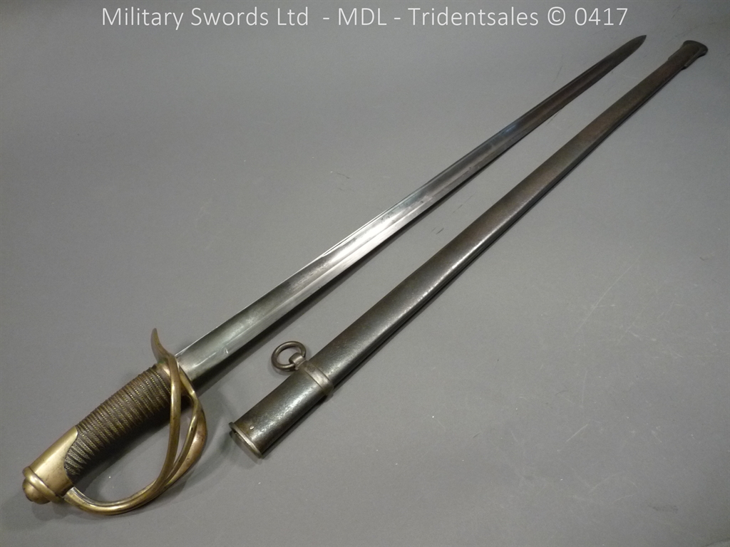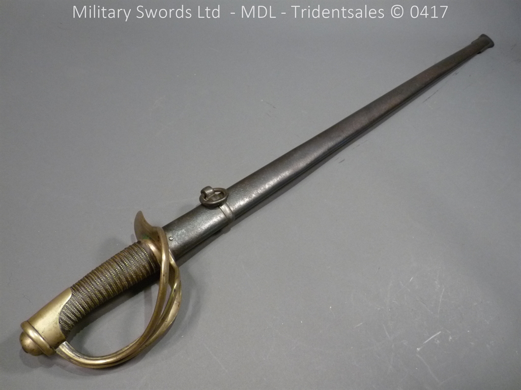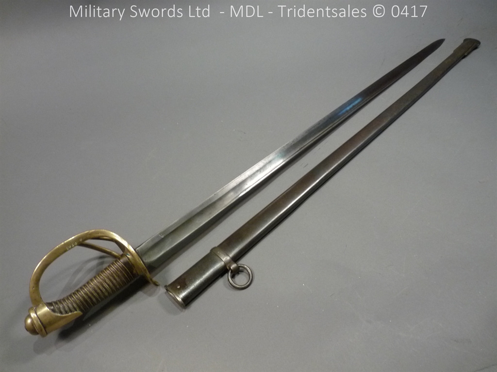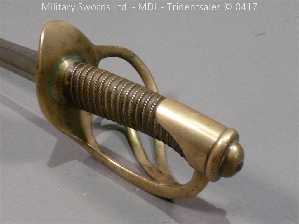 Original example, it has a brass hilt with a two bar guard with correct inspection marks, the wood handle is leather bound with brass wire, it has a straight blade which is in good condition again with inspection stamps, the spine is engraved with the manufacturer and dated 1883, complete with steel scabbard with single loose rings. Size: Overall Length 104cm / Blade 87cm