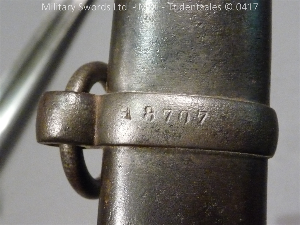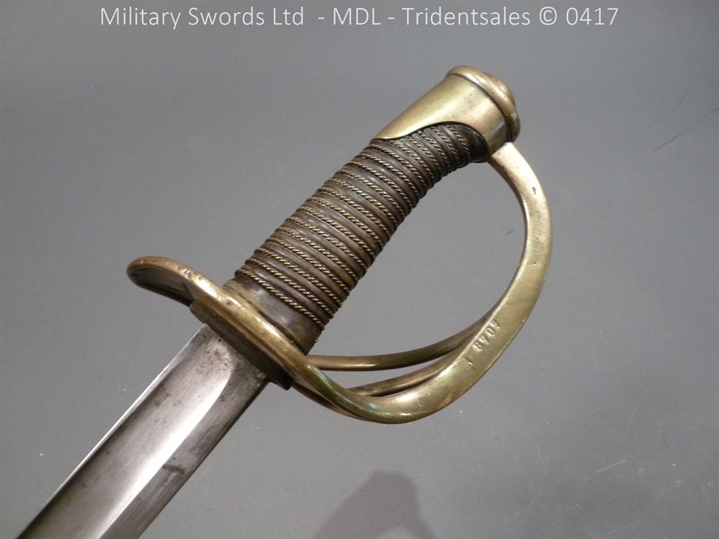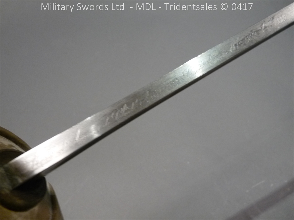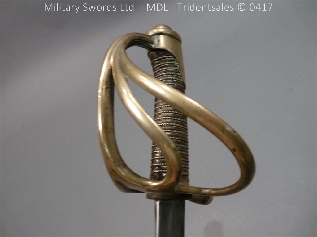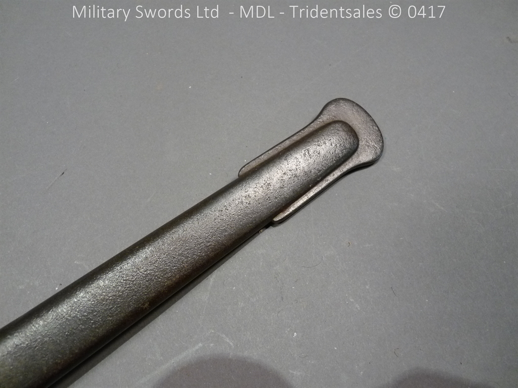 Original example, it has a brass hilt with a two bar guard with correct inspection marks, the wood handle is leather bound with brass wire, it has a straight blade which is in good condition again with inspection stamps, the spine is engraved with the manufacturer and dated 1883, complete with steel scabbard with single loose rings. Size: Overall Length 104cm / Blade 87cm