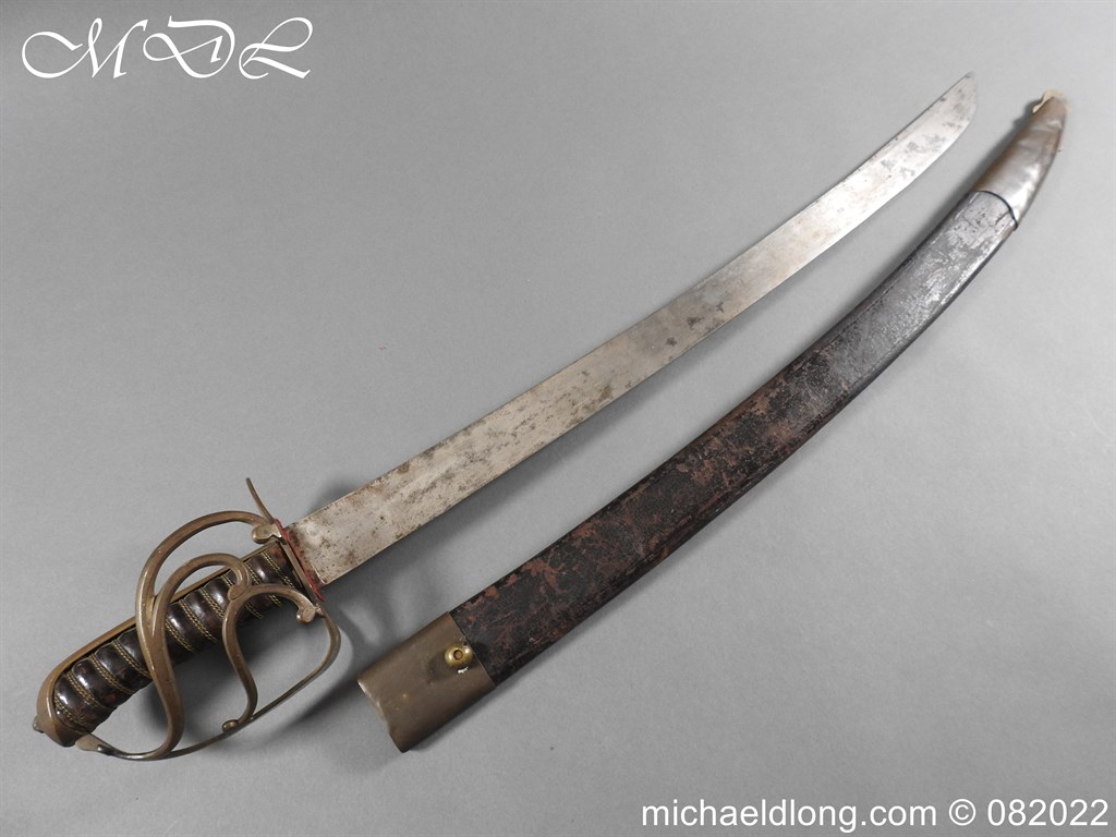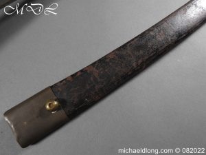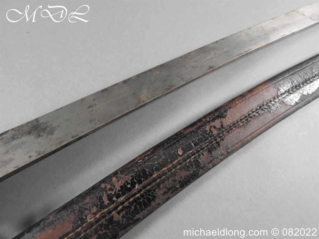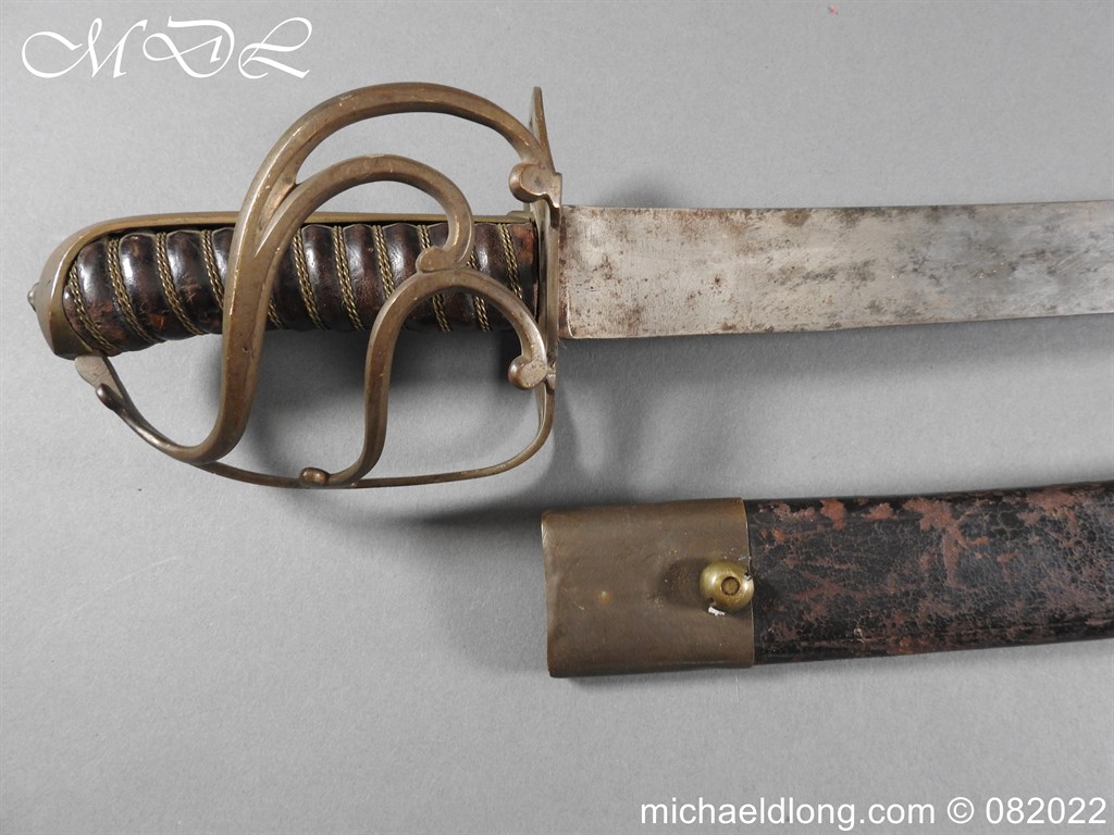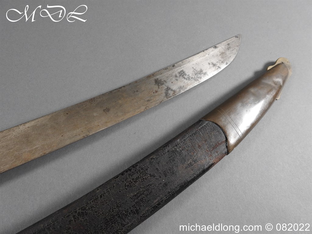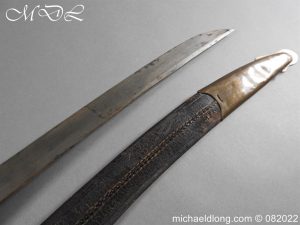 French Sabre de Mineur or Infantry sabre de Montmorency, decorative brass guard and back strap with leather bound grip secured with twisted wire. The blade wide and slab sided single edged becoming double to wards the tip. It is complete with matching brass mounted leather scabbard overall length 78cm the blade 63cm