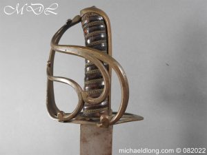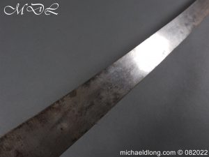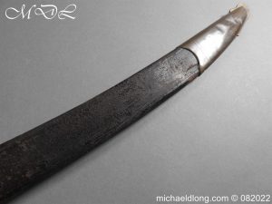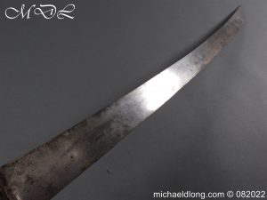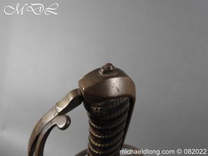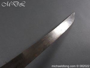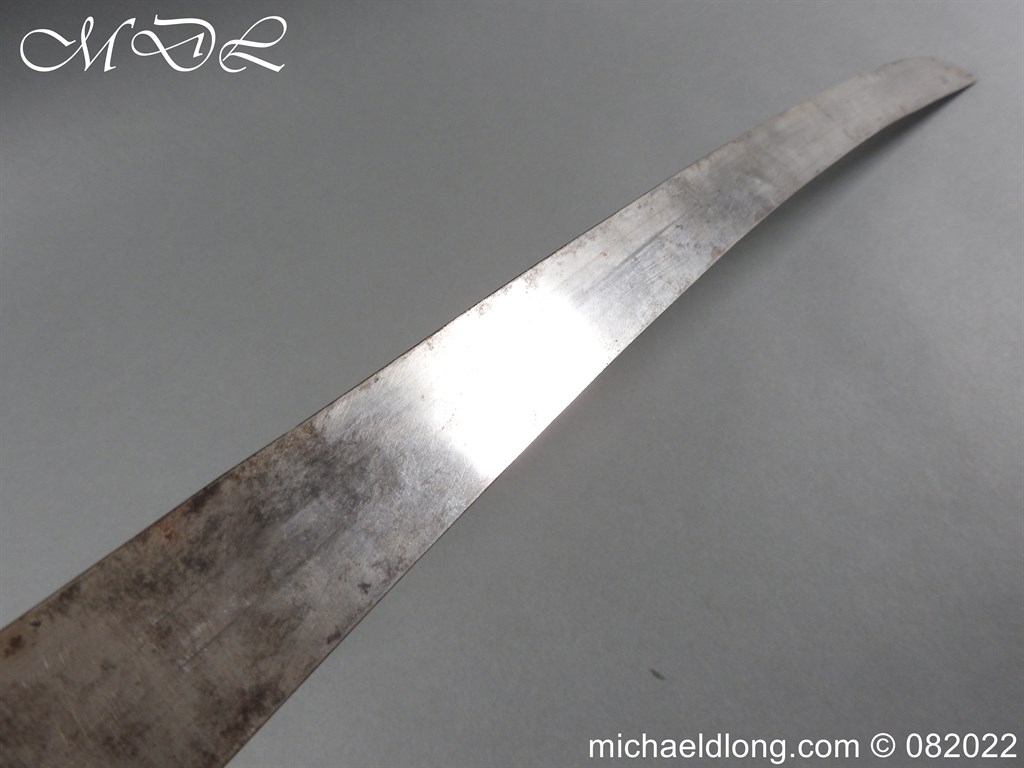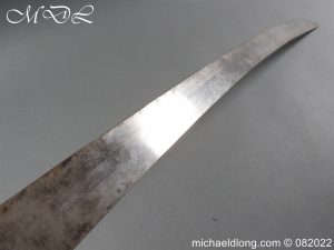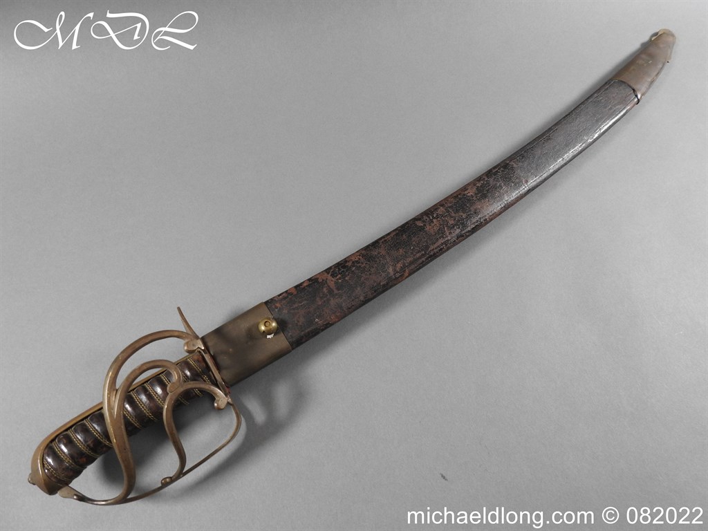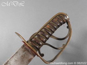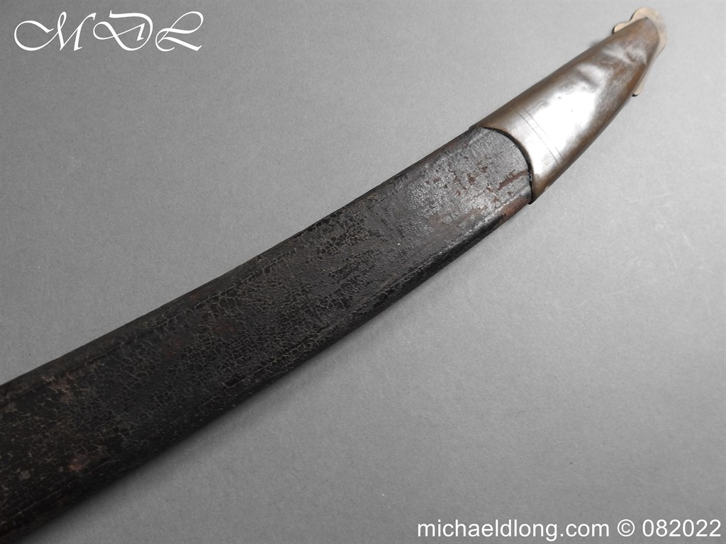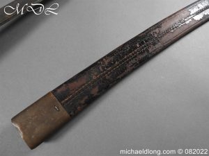 French Sabre de Mineur or Infantry sabre de Montmorency, decorative brass guard and back strap with leather bound grip secured with twisted wire. The blade wide and slab sided single edged becoming double to wards the tip. It is complete with matching brass mounted leather scabbard overall length 78cm the blade 63cm