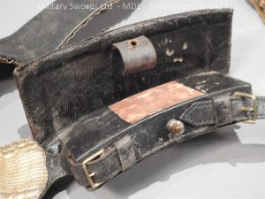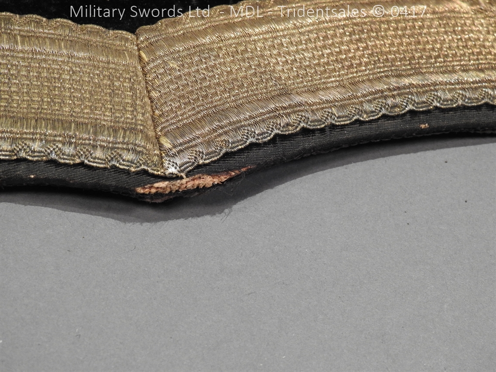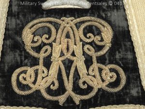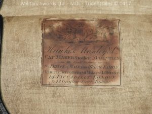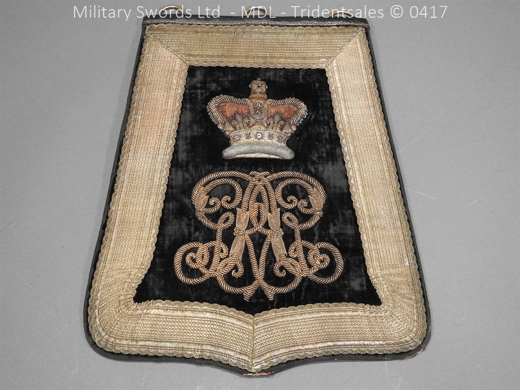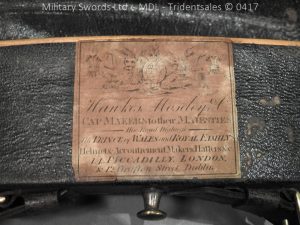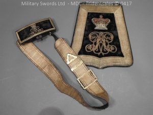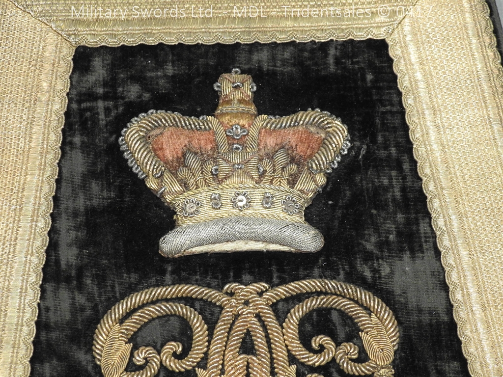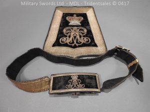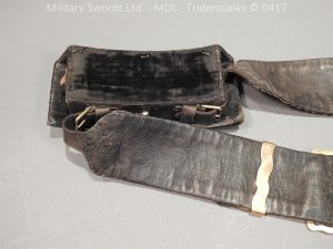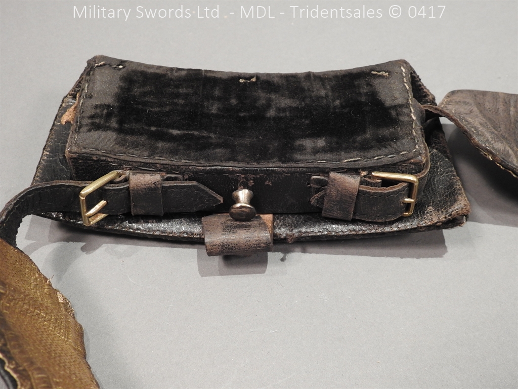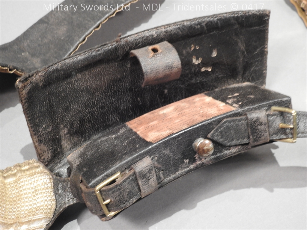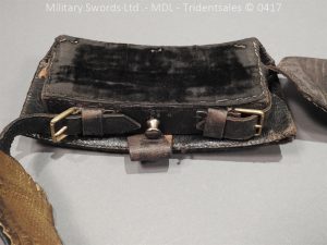 Regiment unknown Georgian sabretache Cross Belt and Pouch both with matching makers labels Hawkes Mosley and Co London, trimmed in matching black velvet with gold lace Royal cypher to centre with crown above. Sabretache with black leather pocket and cross belt with gilt brass fittings