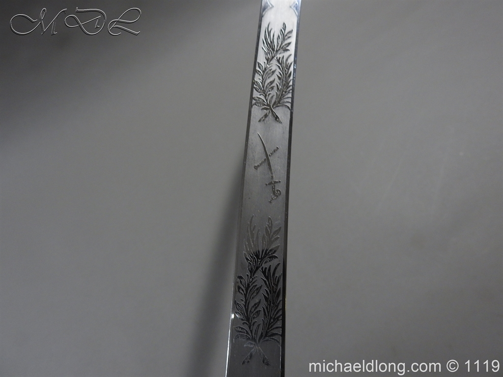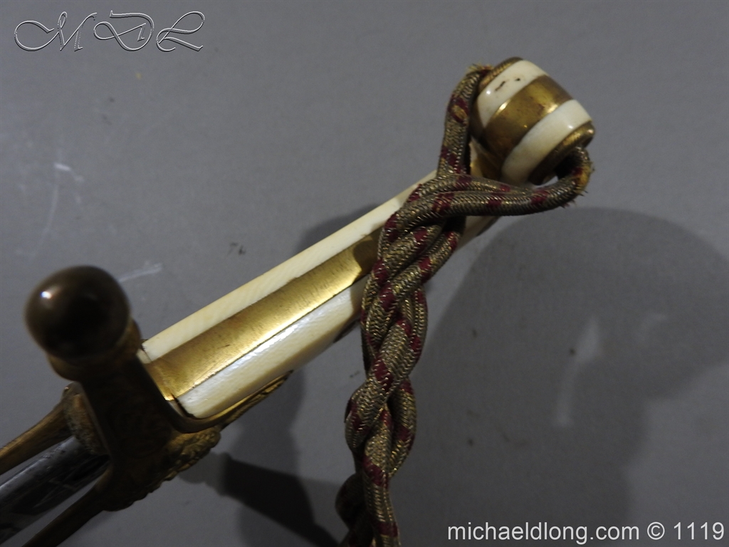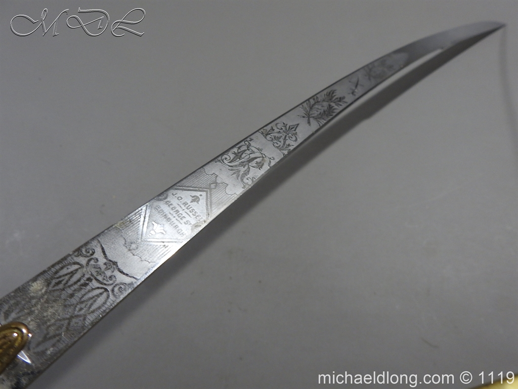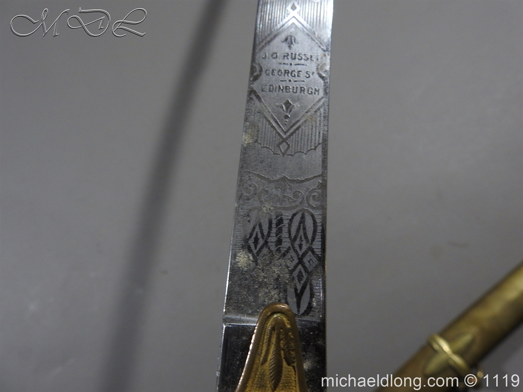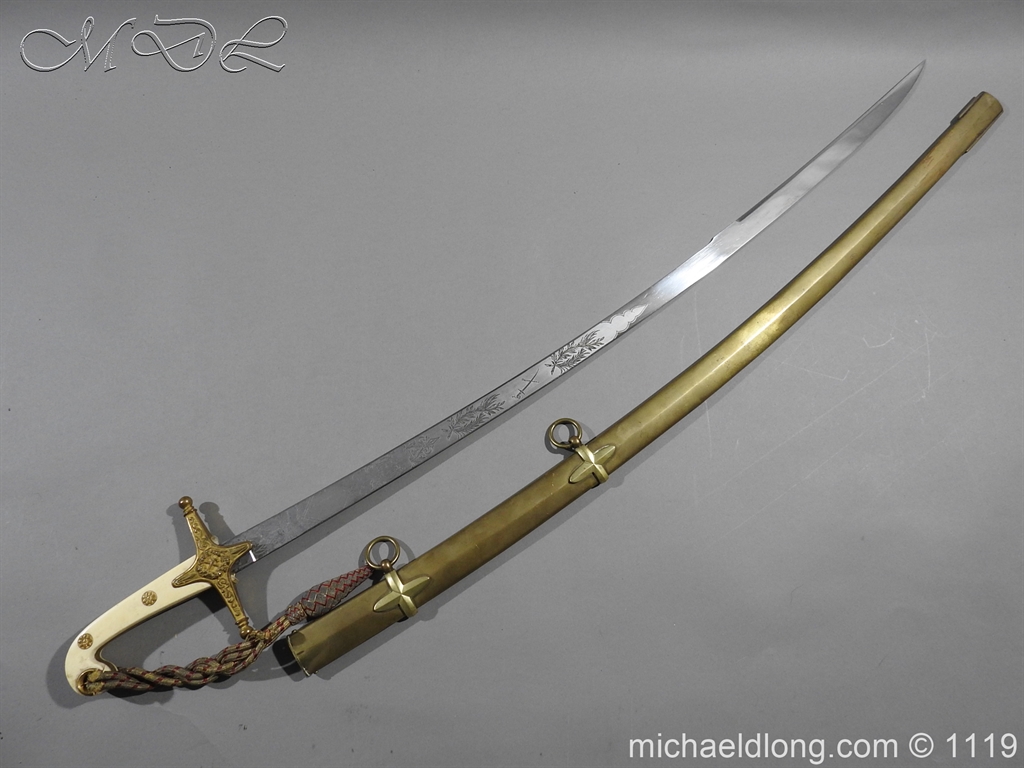 Excellent General Officer’s Victorian Mameluke Sword. A good example, retailed by J Russell Edinburgh. Superb polished curved blade, etched with floral decoration, VR cipher and crossed sword and baton. Gilt crosspiece bearing crossed sword and baton in wreath on the escutcheon. bone grip with gold/crimson cord sword-knot with acorn finial complete with gilt brass scabbard.