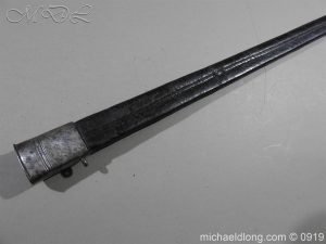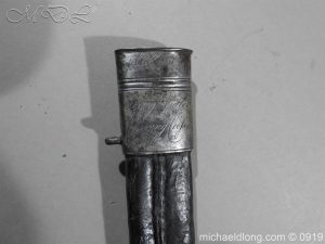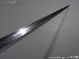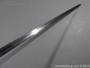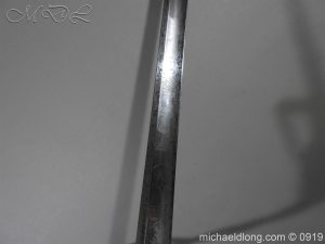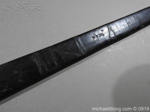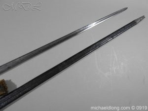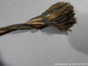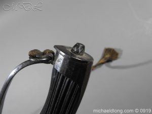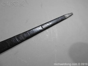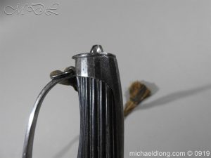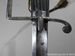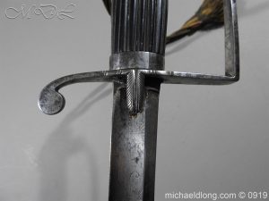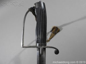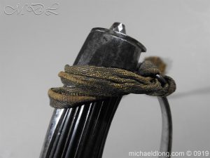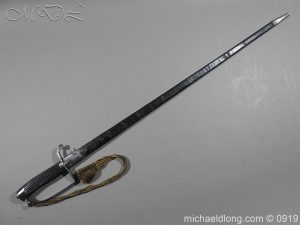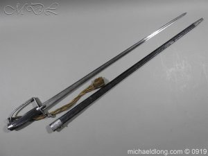 Excellent officer’s sword by Cullum London with characteristic hilt fluted ebony grip and matching polished steel mounts and engraved langets. The straight blade is in excellent condition engraved both sides with GR III, crown plus trophies of arms and floral decoration. Complete with tooled leather scabbard with matching steel mounts, the top mount with frog stud and hanging ring plus engraved with makers details. It is complete with very rare original knot, overall length 96cm the blade 82cm