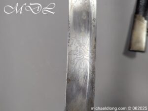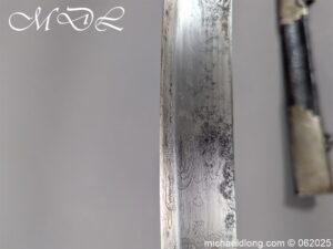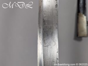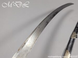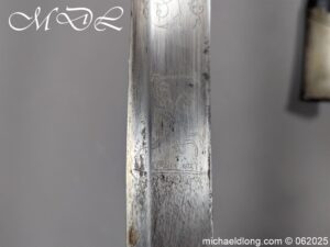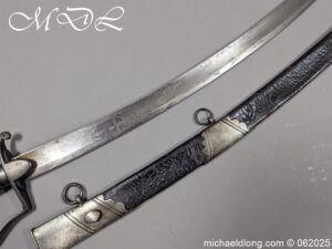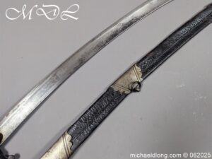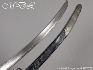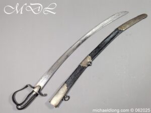 Georgian 1796 Light Cavalry Officer Sword early example with regulation hilt, the leather and wire all in good order. The blade with gilt inlay decoration including G R and Crown, Royal Coat of Arms, mounted officers and floral decoration. It is complete with black leather scabbard with steel mounts two rings and frog stud. Overall length 35 inch the blade 30.5 inches