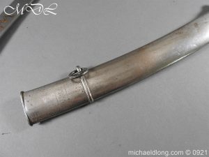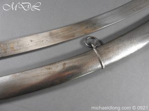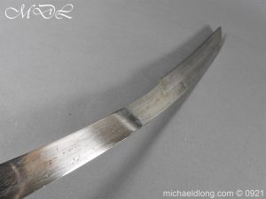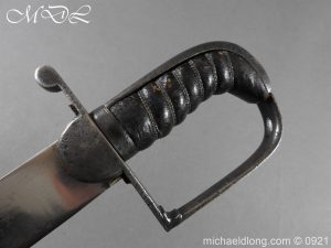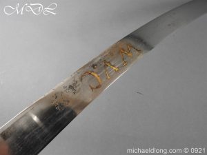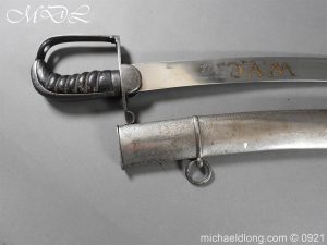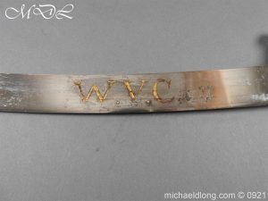 Georgian 1796 W V C Cavalry Officer’s Sword.belonging to Capt. Jonas Asplin founded the Wakering Volunteer Cavalry ( W.V.C) Essex, in 1803 Steel hilt with leather grip bound by three silver wires. Curved flat blade no fullers with hatchet point and engraved each side with W V C in gold and Caps Asplin on the spine complete with steel scabbard again engraved with W V C