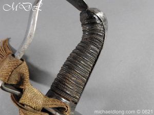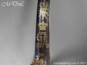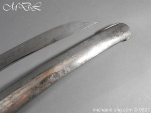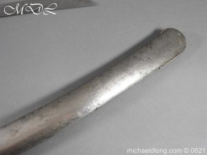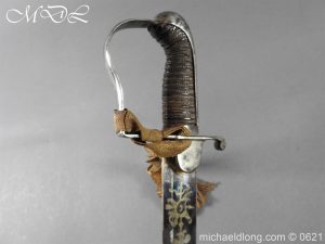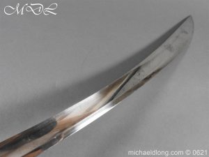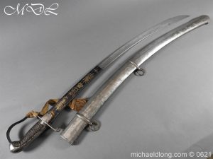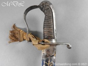1796 light cavalry officer’s blue and gilt sword but of heavier construction. Teel stirrup hilt with rare sword knot slit to one side. Domed pommel and leather grip bound with silver wire. The blade curved flat back single edged expect for the last 4 inches. Single broad fuller to within 6 inches of the hatchet point. The blue and gilt decoration in good condition with trophies of arms GR mounted Hussar and seated Britannia. Complete with steel scabbard of similar heavy construction and officer dress sword knot