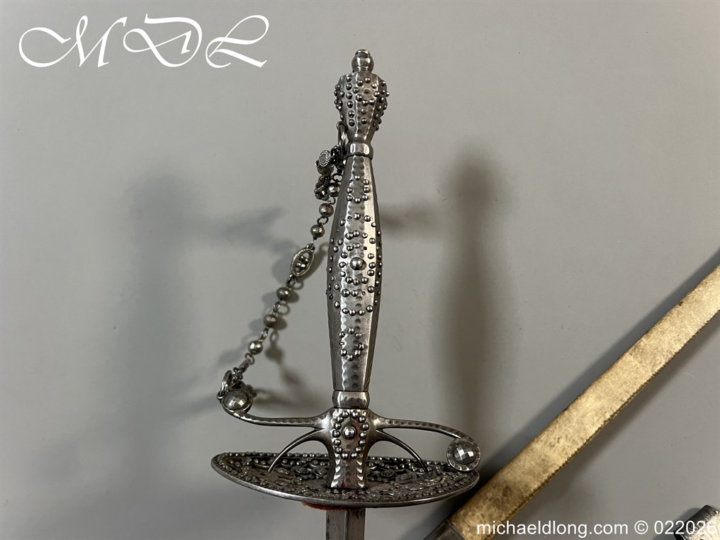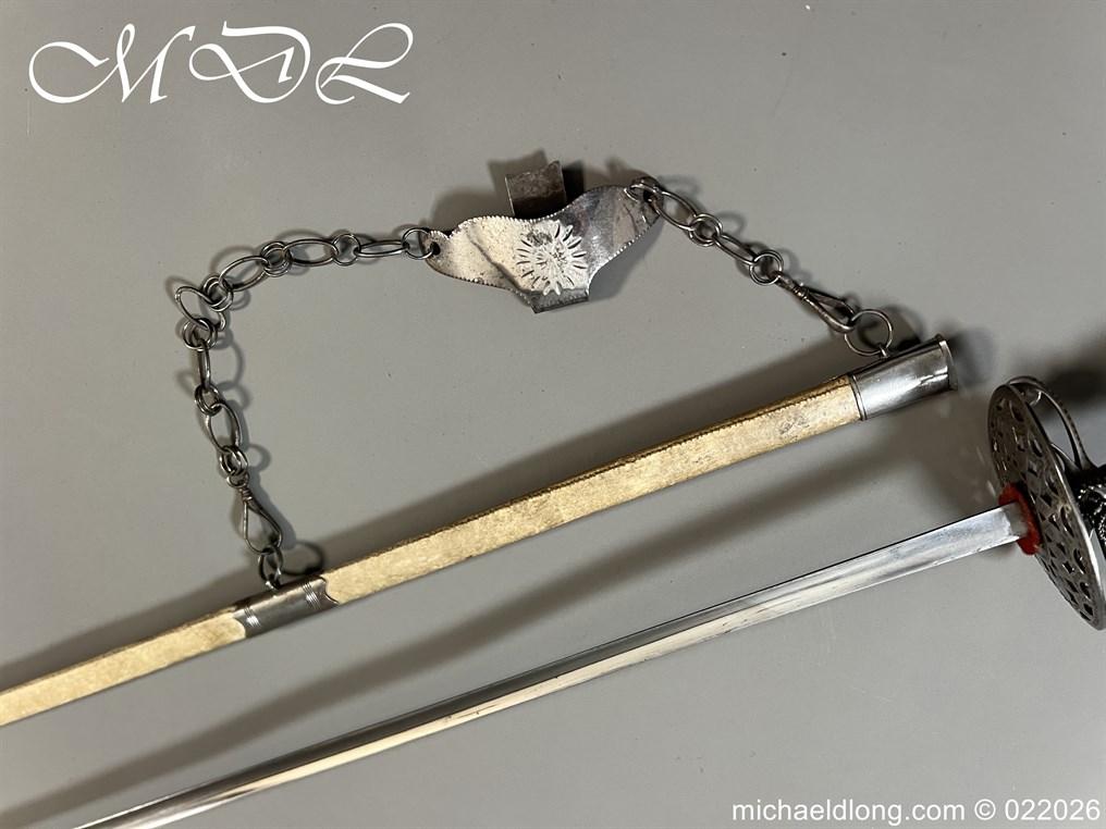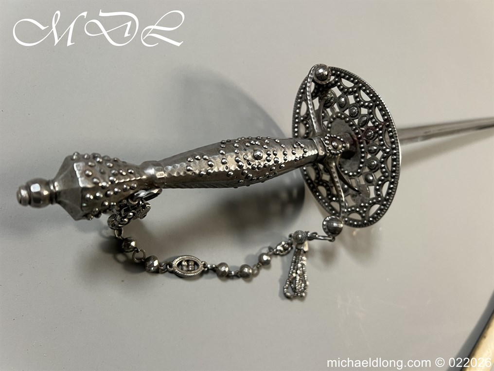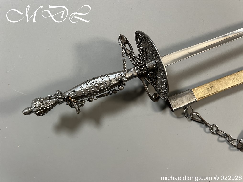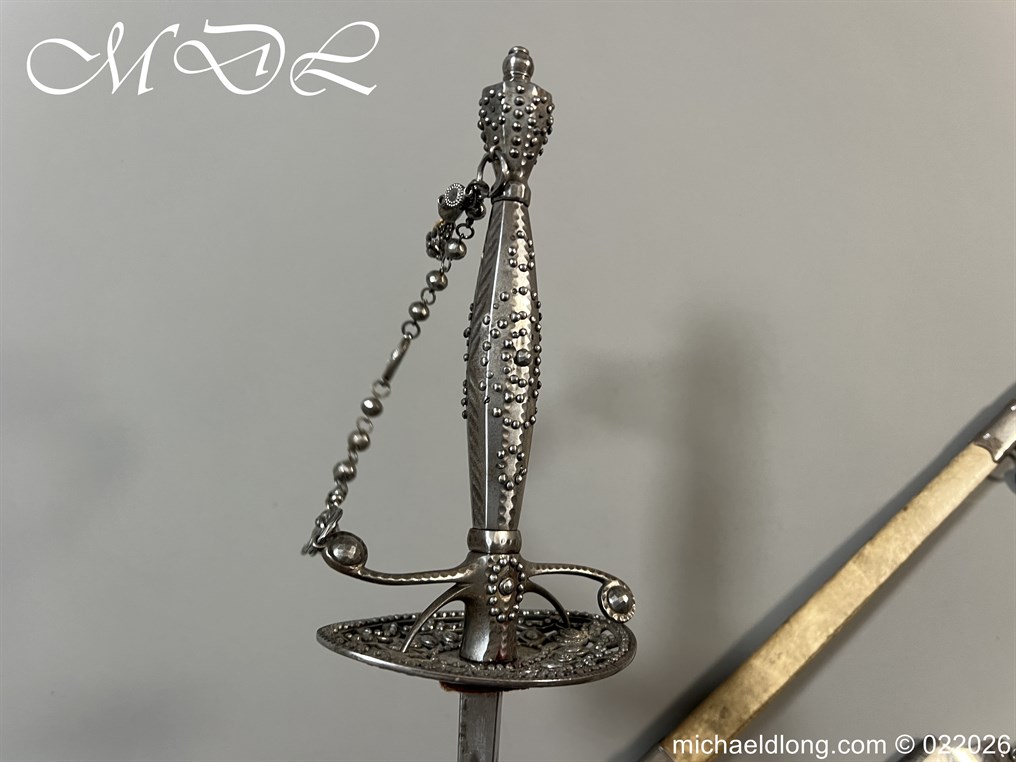 Georgian Cut Steel Court Sword in super condition with facet cut hilt with pierced boat guard and chain and tassel knuckle bow, trefoil blade, complete with original steel mounted leather scabbard with matching polished hanger and chains.