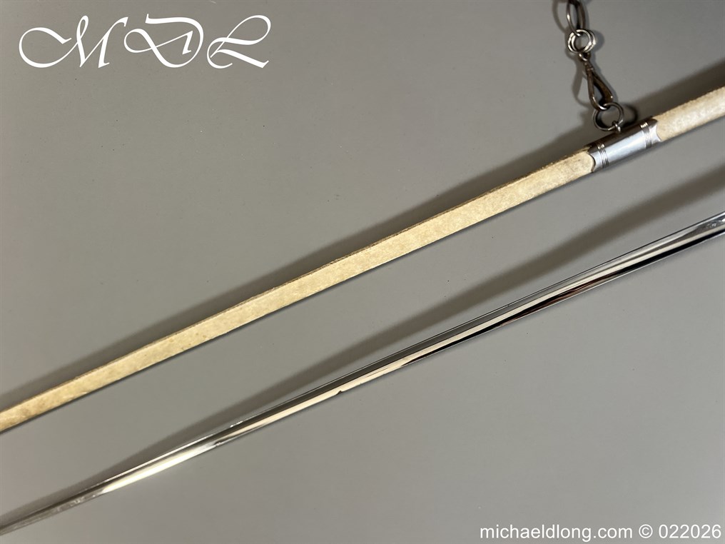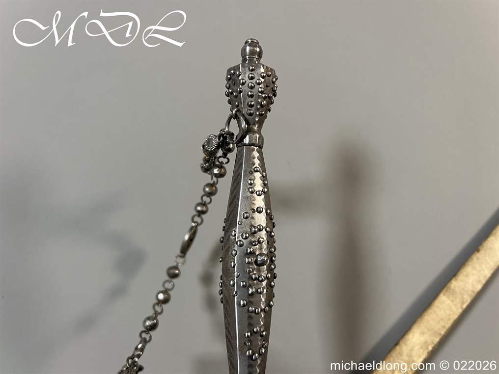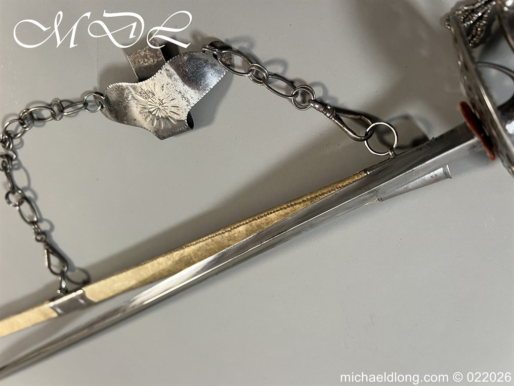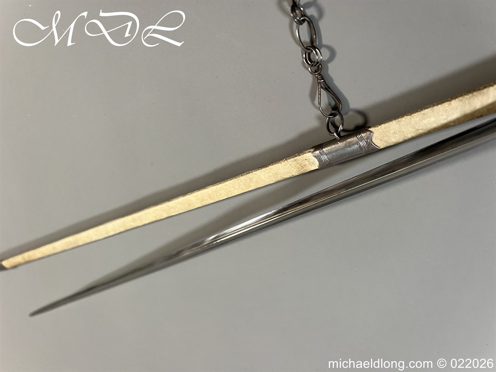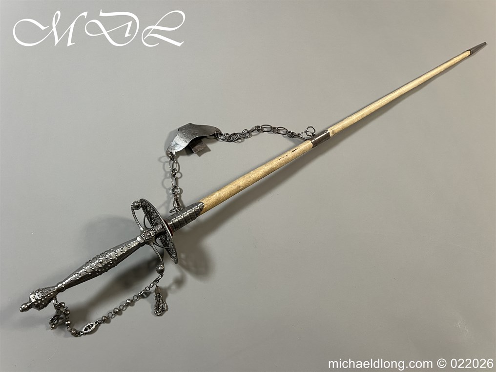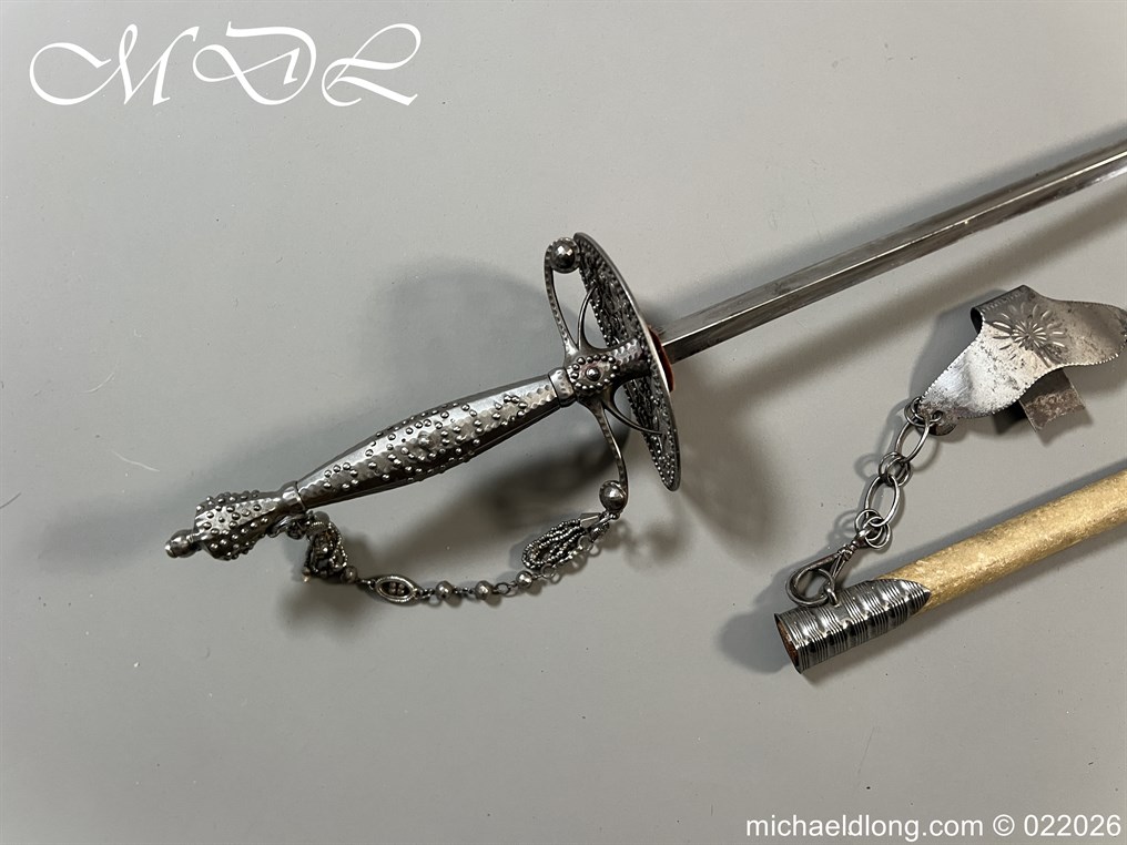 Georgian Cut Steel Court Sword in super condition with facet cut hilt with pierced boat guard and chain and tassel knuckle bow, trefoil blade, complete with original steel mounted leather scabbard with matching polished hanger and chains.