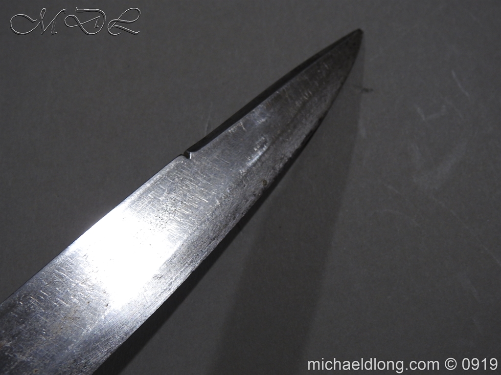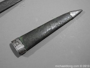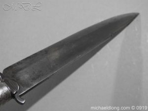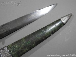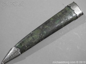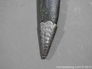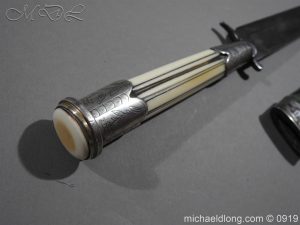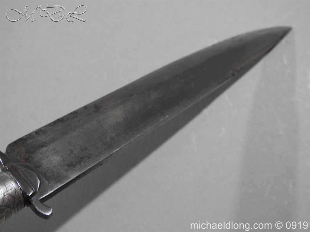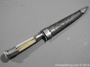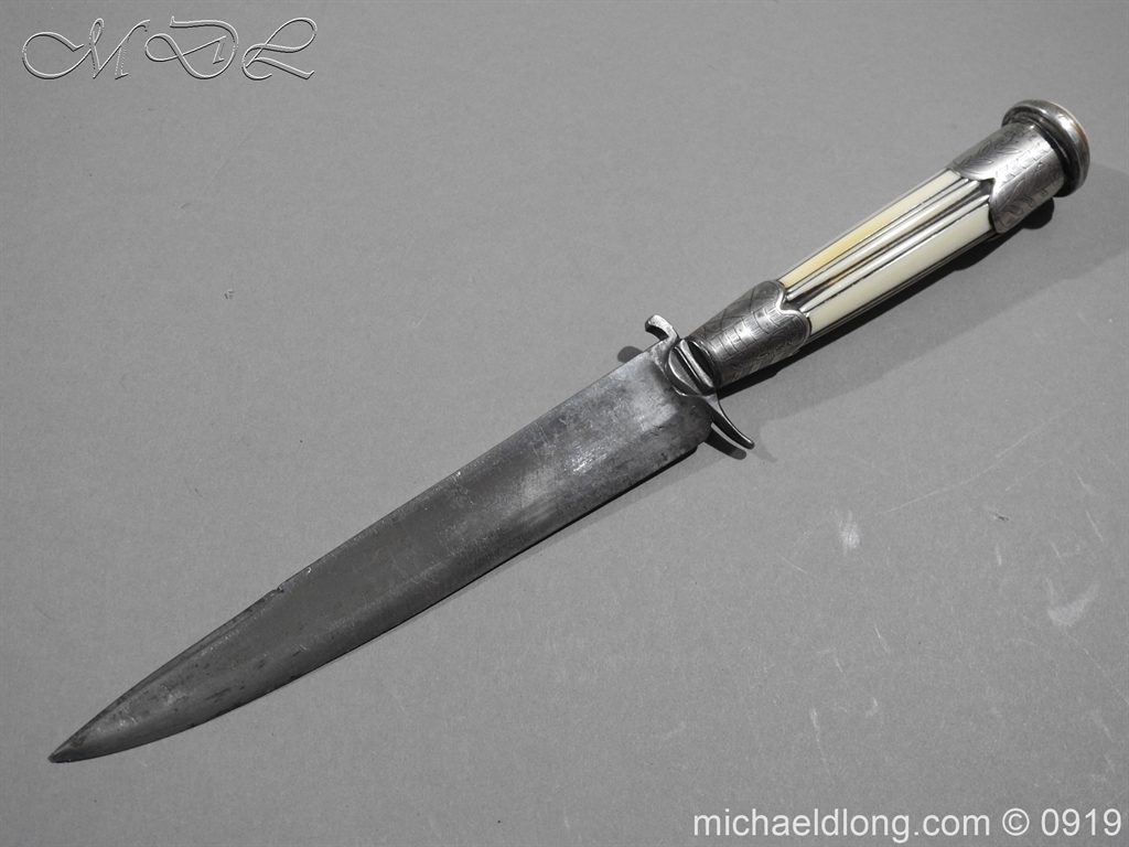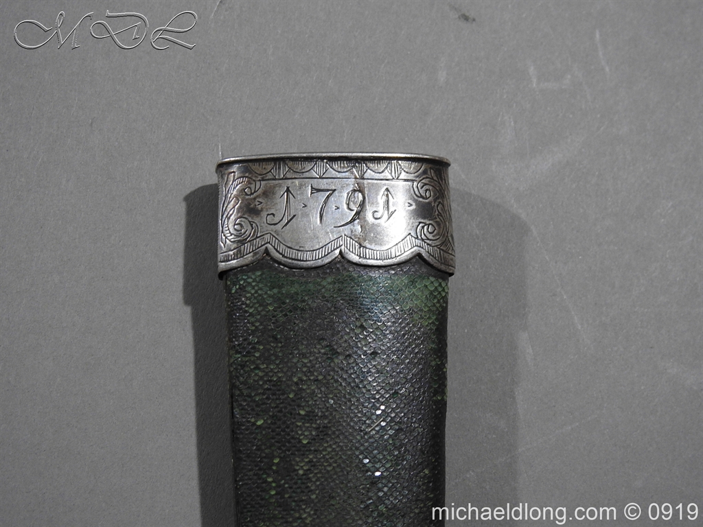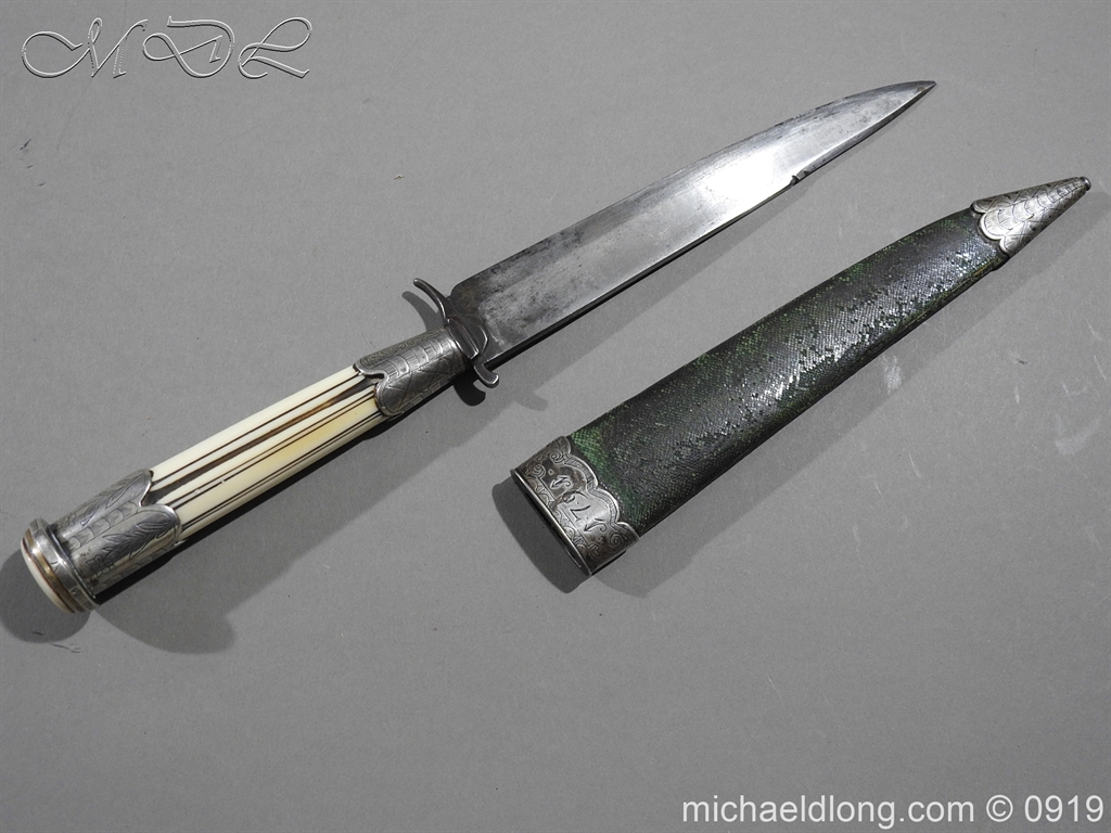 Super dagger in excellent condition with fluted bone grip secured by highly decorative silver mounts. Small curved cross guard with single edged blade becoming double edged towards tip. Complete with shagreen scabbard with matching silver mounts top mount dated 1791 overall length 29cm the blade 16cm