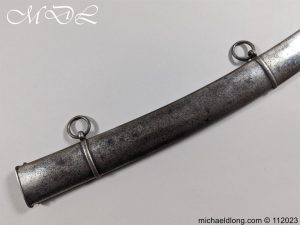 Georgian Officer’s 1796 Light Cavalry Sword, regulation hilt with leather grip bound with silver wire. The curved single edged blade is engraved with G R and crown, trophies of arms, mounted cavalry officer plus floral decoration all inlayed in gilt and shows very little wear please see images. It is complete with steel scabbard with two loose rings. For reference please see Swords of the British Army Revised Edition Page 81 overall length 96 cm the blade 83.5 cm