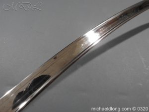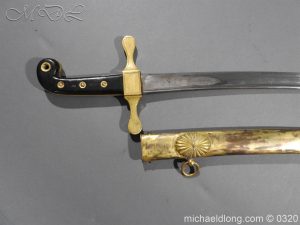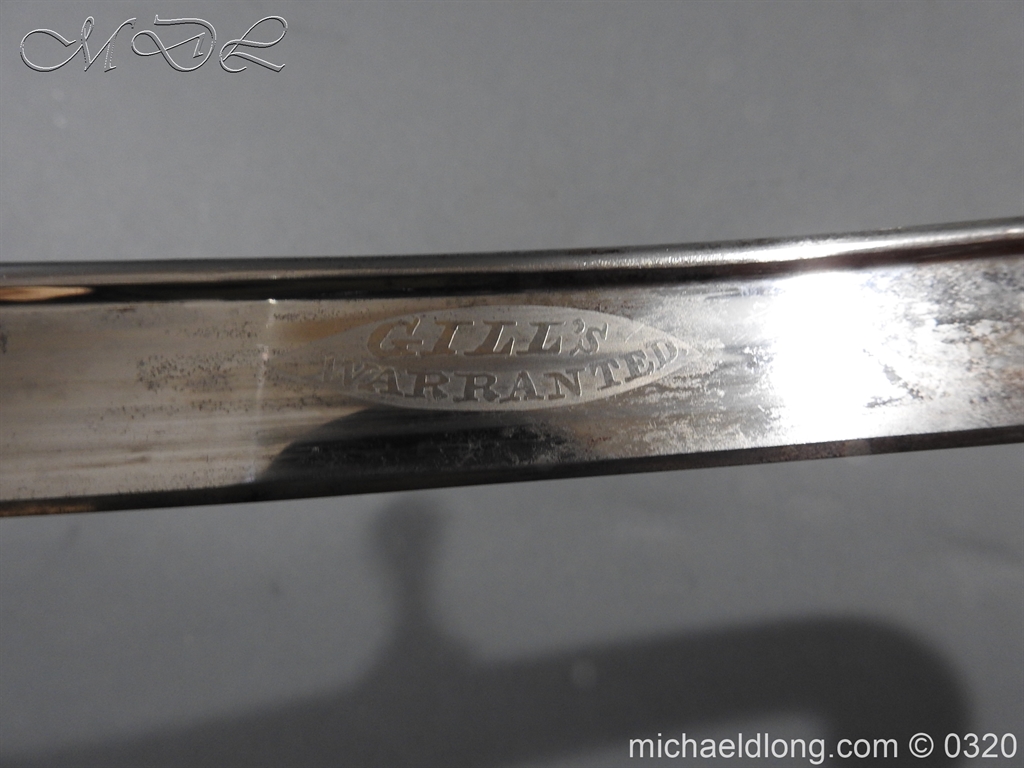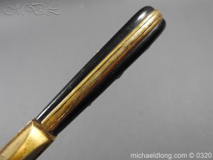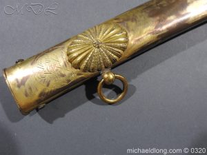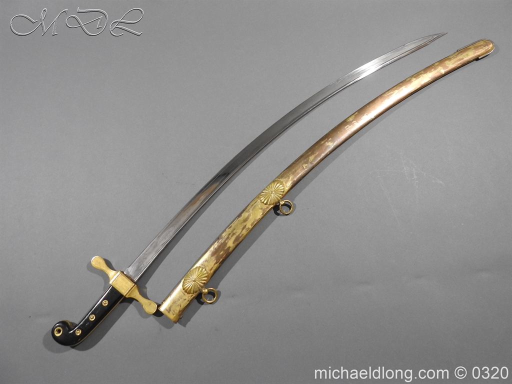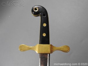 Georgian Officer’s Sword by Gill special pattern, with mameluke style hilt with ebony grip secured by gilt brass studs one missing on one side. Large flat cross guard with decoration, the curved blade pip backed and Gill’s warranted within a oval panel and complete with clip point. The gilt brass scabbard with large raised flamboyant mounts and steel shoe showing age wear with the brass showing though but again maker marked Gill’s Soho London. Overall length 40 inches 101 cm the blade 34 inches 86 cm
