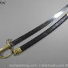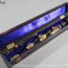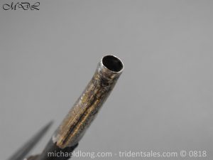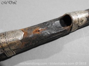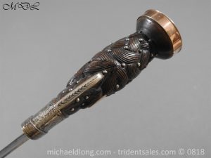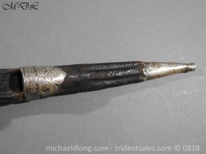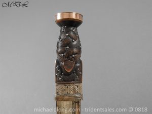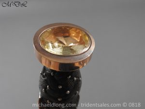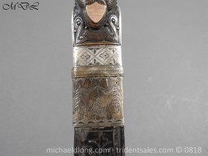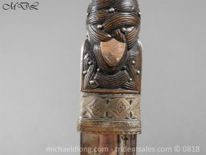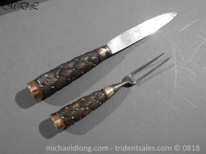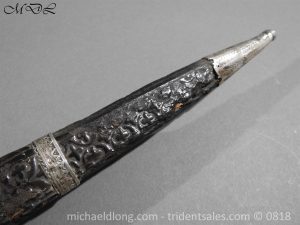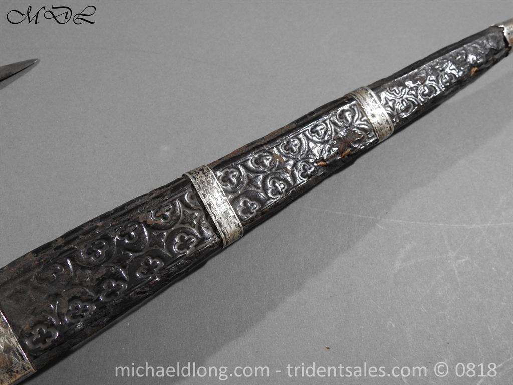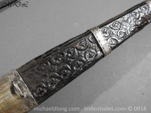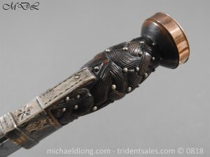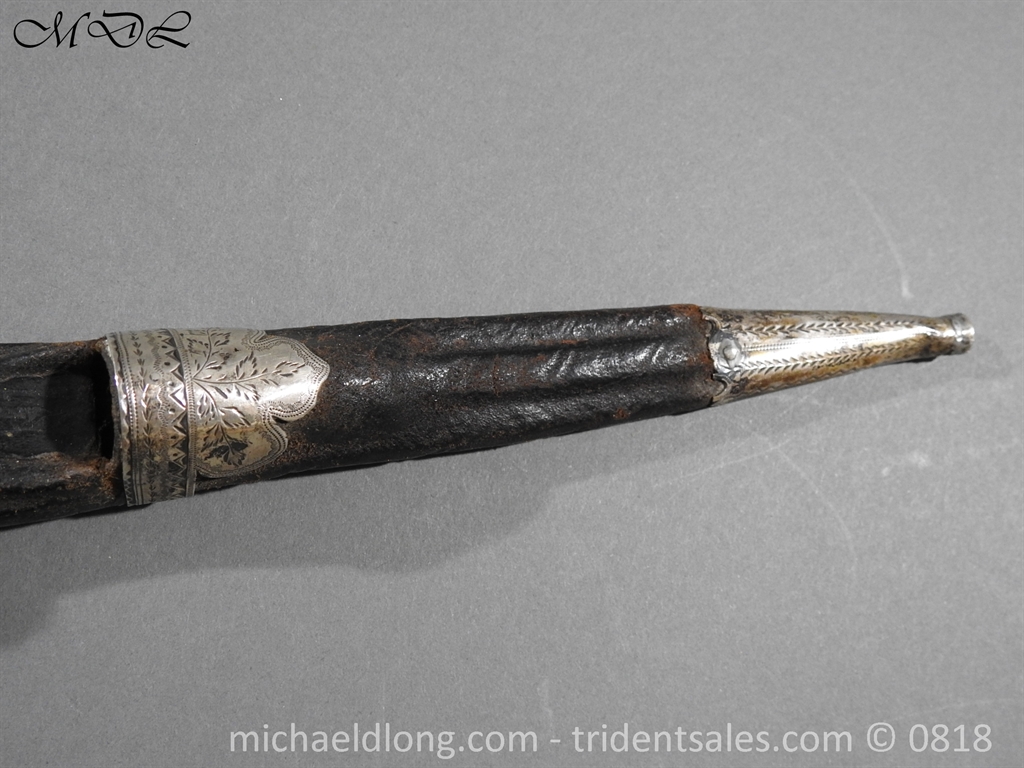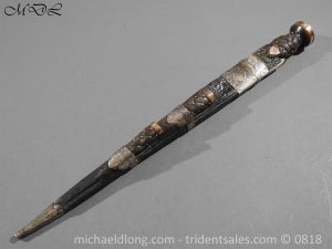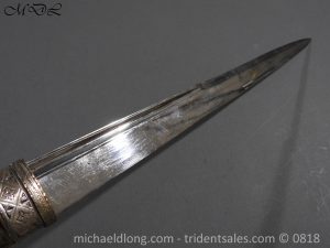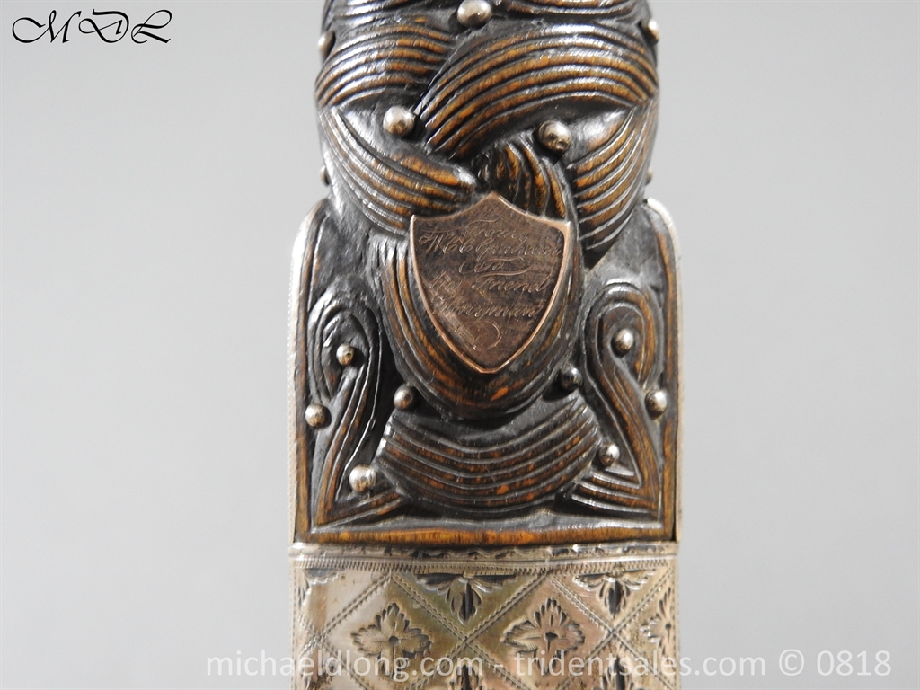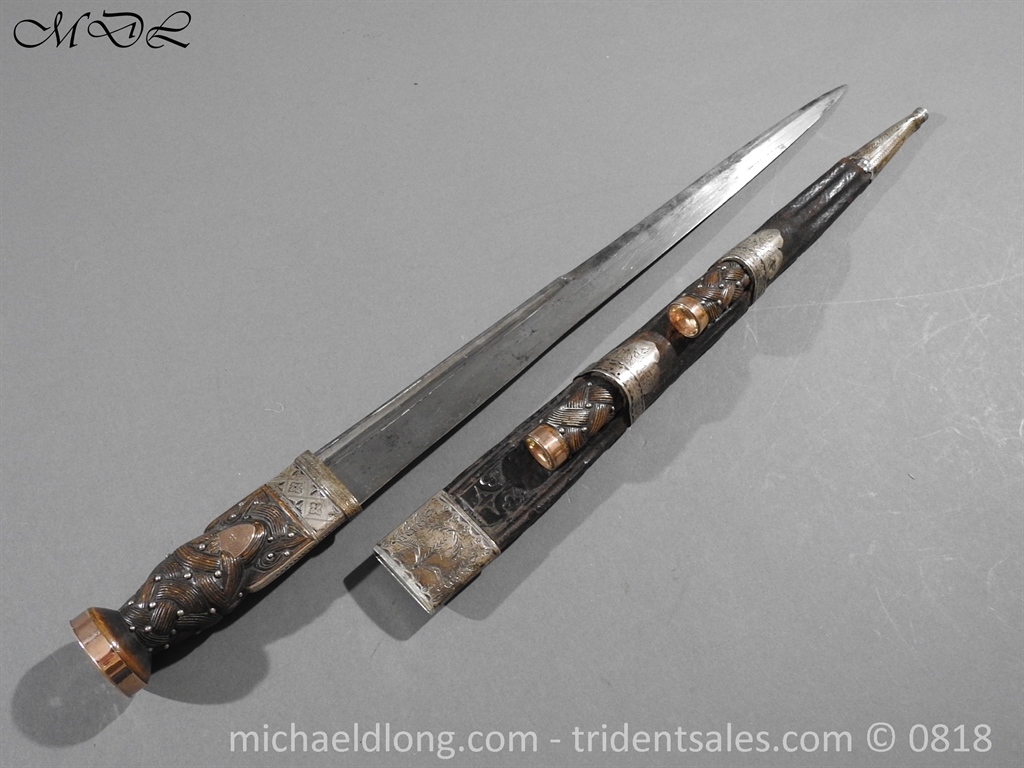 Early form of dirk with tooled leather scabbard, silver decorative mounts no hallmarks. Studded curved hilt with insert round stones matching knife and fork. single edged blade with single top fuller becoming double edged still in polish. The hilt with shield shaped plaque detailing From WCC Graham to his friend Honeyman. Dimensions, Blade Length: 34 cm – 13.5 Inches Overall Length: 46 cm – 18 Inches