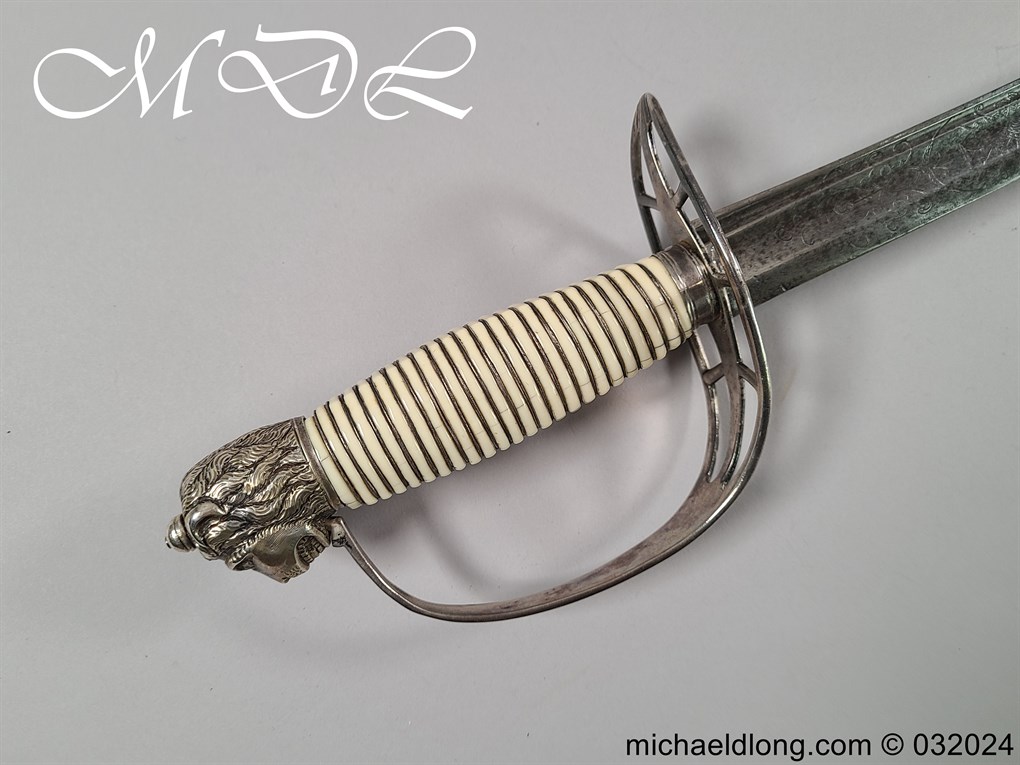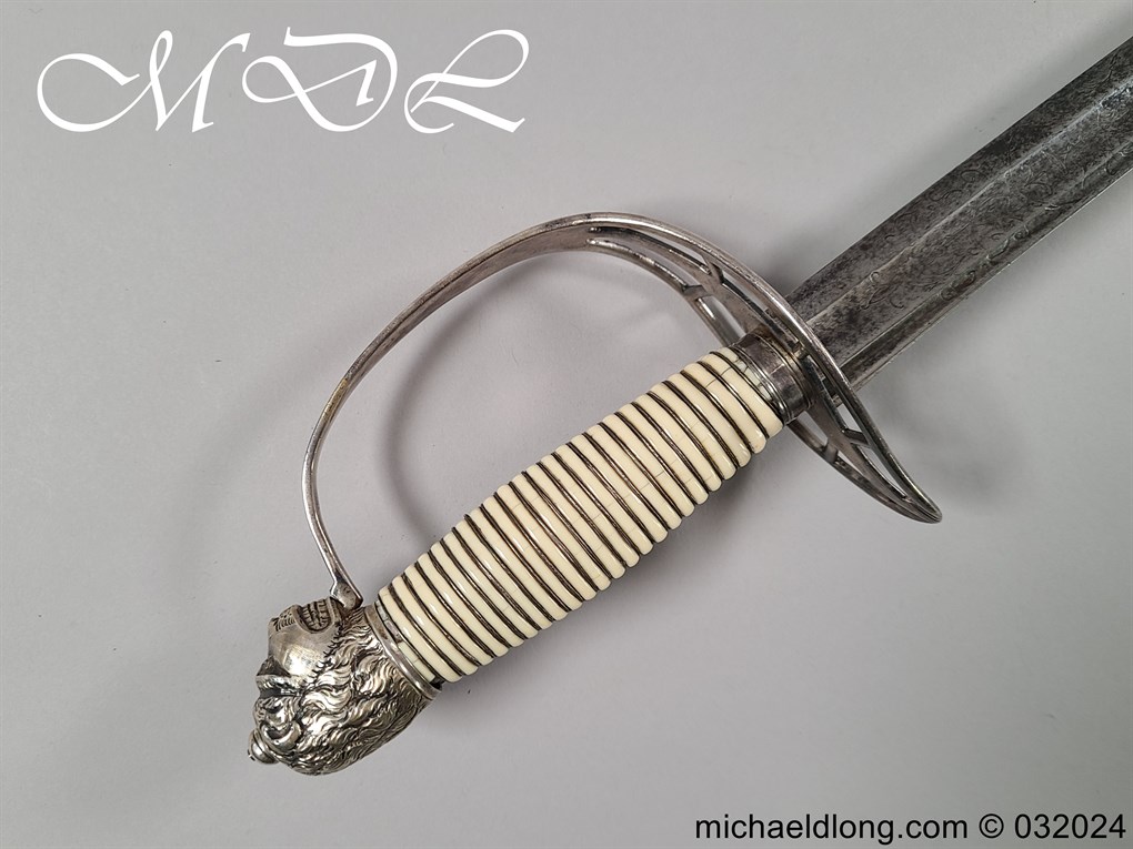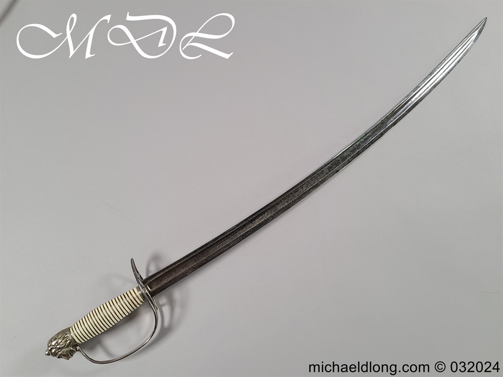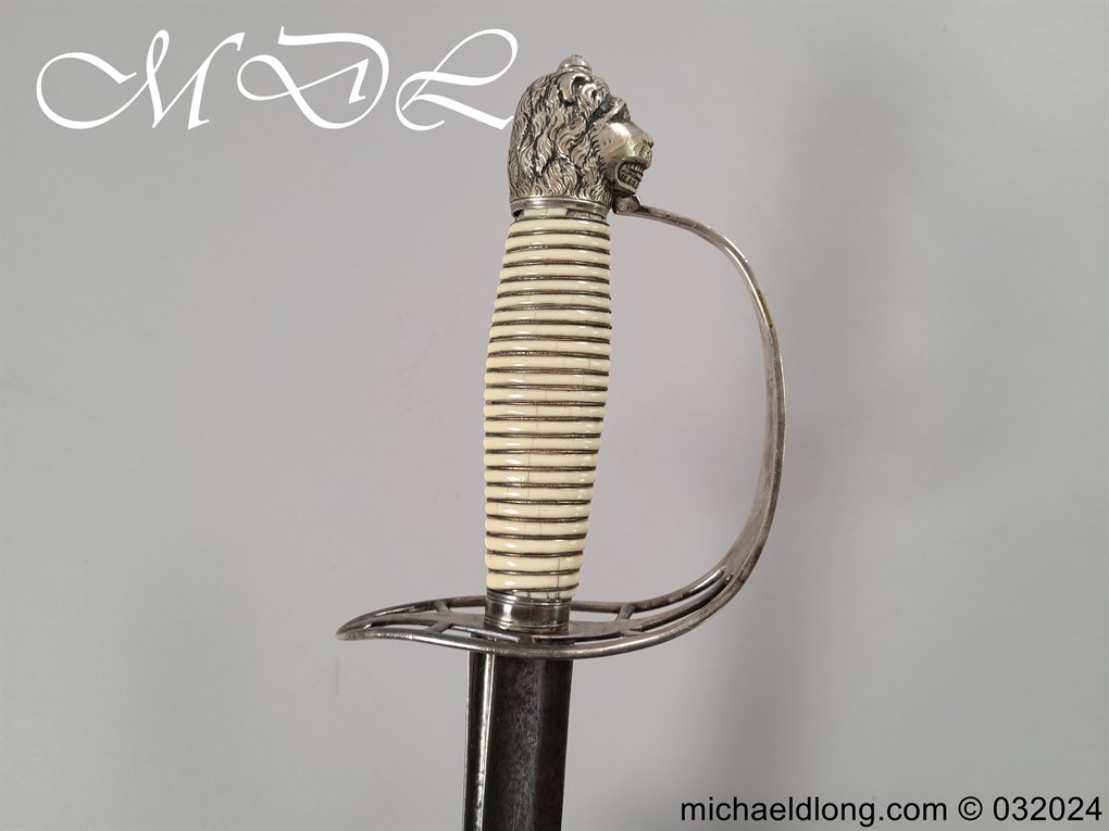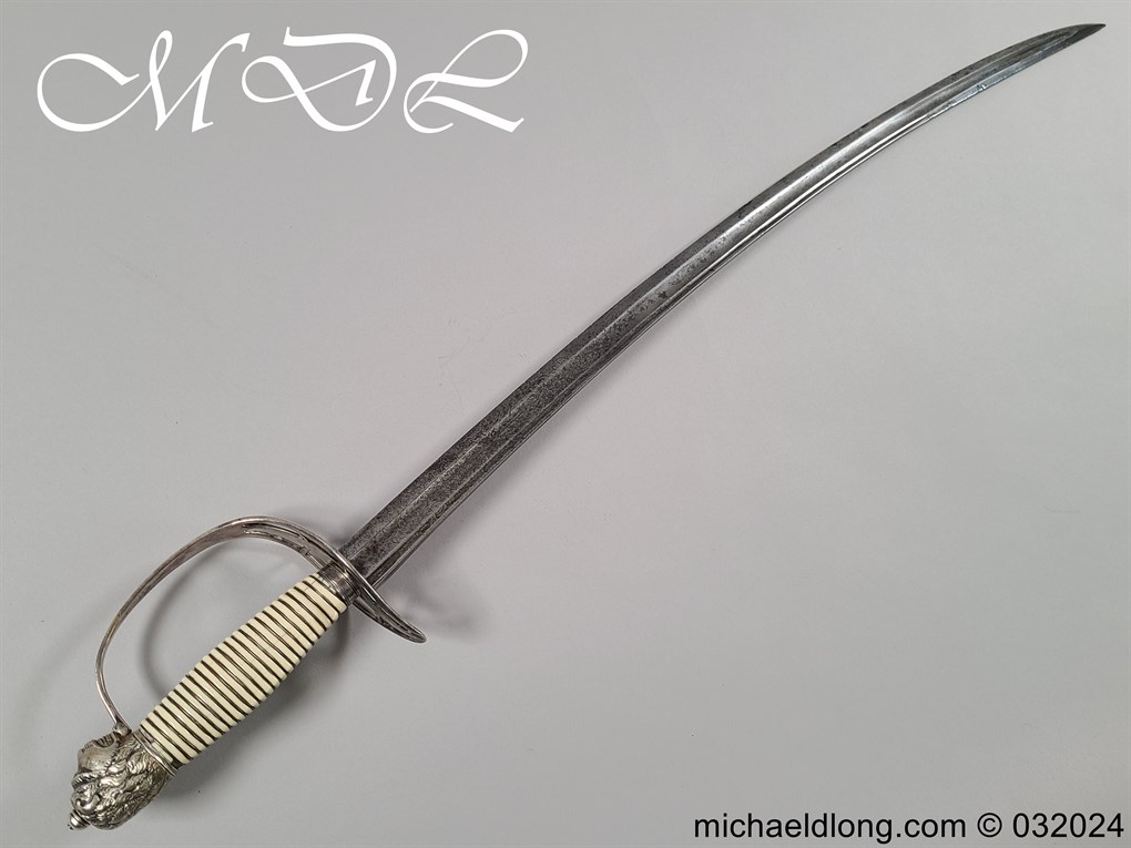 Georgian Silver Hilt Naval Hanger Hallmarked 1781 and with makers mark WK for William Kidney. The slotted hilt as stated hallmarked and with a super lion head pommel and bone grip wrapped with silver wire. The blade single edged becoming double edged for the last 20cm, engraved with trophies of arms and floral decoration to both sides. This form of sword or hanger were typical carried by Royal Naval officers in the period 1770 to 1790 overall length 87cm the blade 71cm submission ref VPU8YDYD