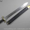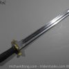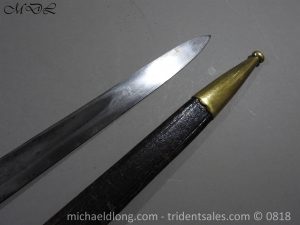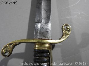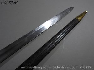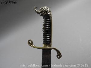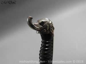 Black horn grip with brass ferrule at base. ‘S’ shaped crossguard with pierced and decorated quillons. Back-strap and pommel in silver metal. The pommel in the shape of an Elephants head with upturned trunk. Steel single edged, single fullered blade numbered 794. In its brass mounted black leather scabbard Locket frog shaped and with a Tigers head motif. Length 621mm Blade 492mm.
