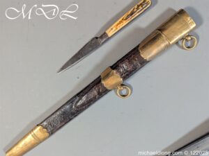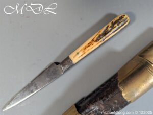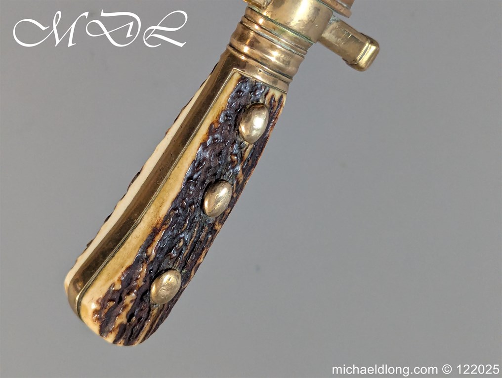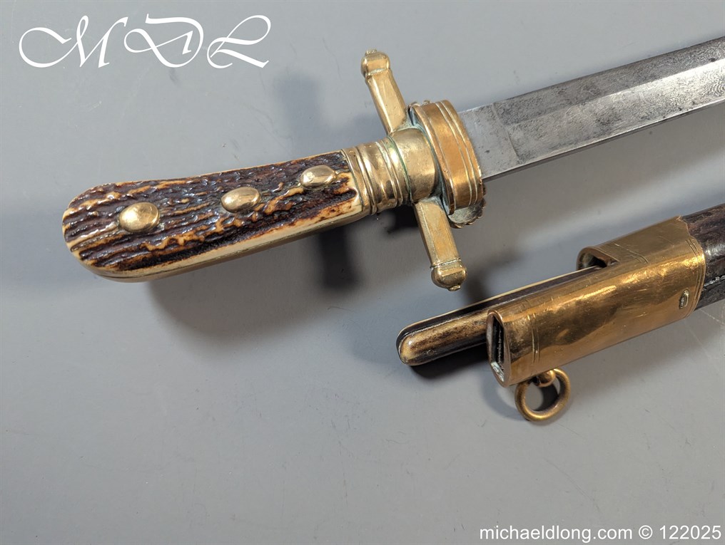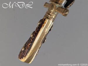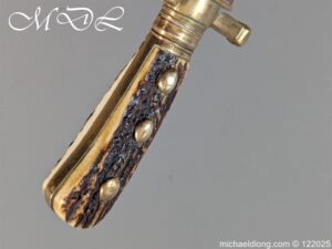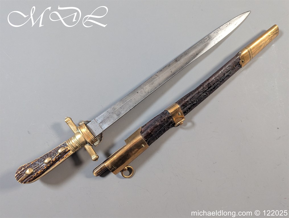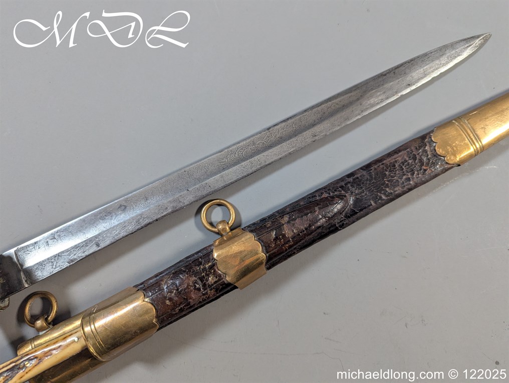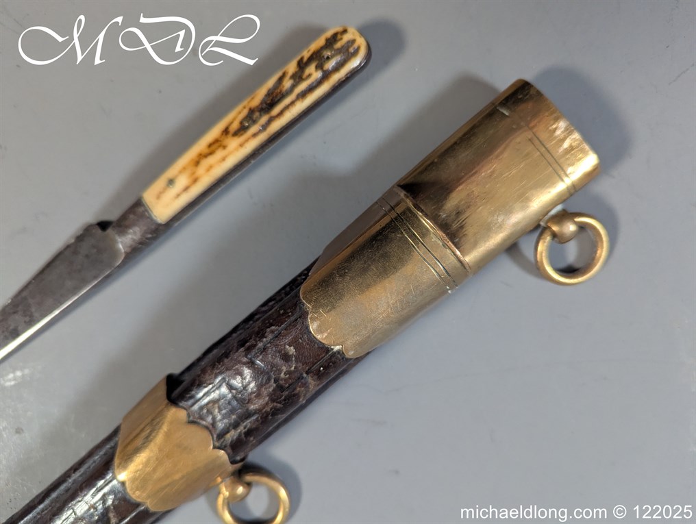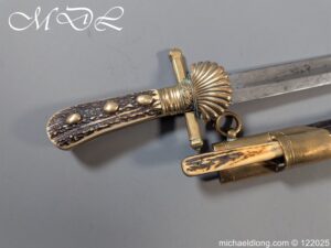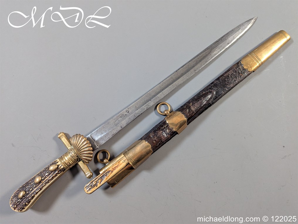 German 19th Century Hunting Hanger by Weyersberg Kirschbaum & Cie. Super quality, gilt brass hilt with riveted stag horn grips and small shell guard and straight quillions. The blade engraved with hunting scene’s and wildlife and stamped with markers mark under the shell guard W K & C – Weyersberg Kirschbaum & Cie was the amalgamation of two very old Solingen family companies in 1883 Complete with leather scabbard with matching mounts and ensuite knife. Overall length 20.5 inch the blade 15.5 inch
