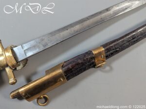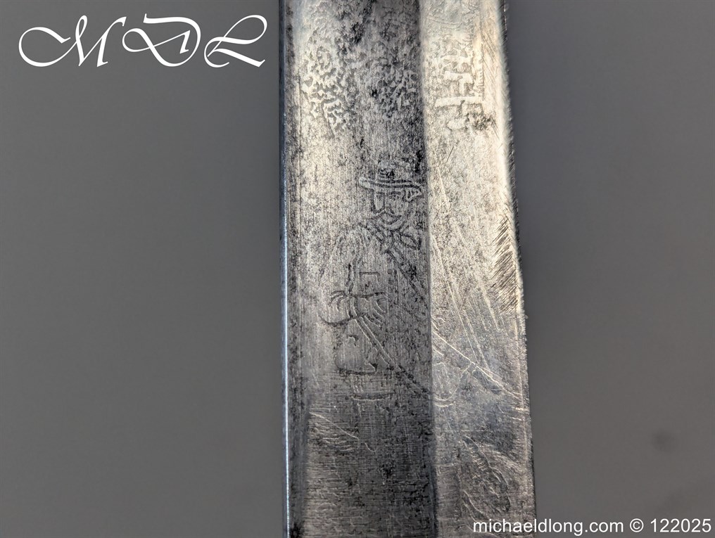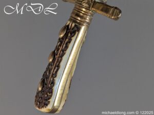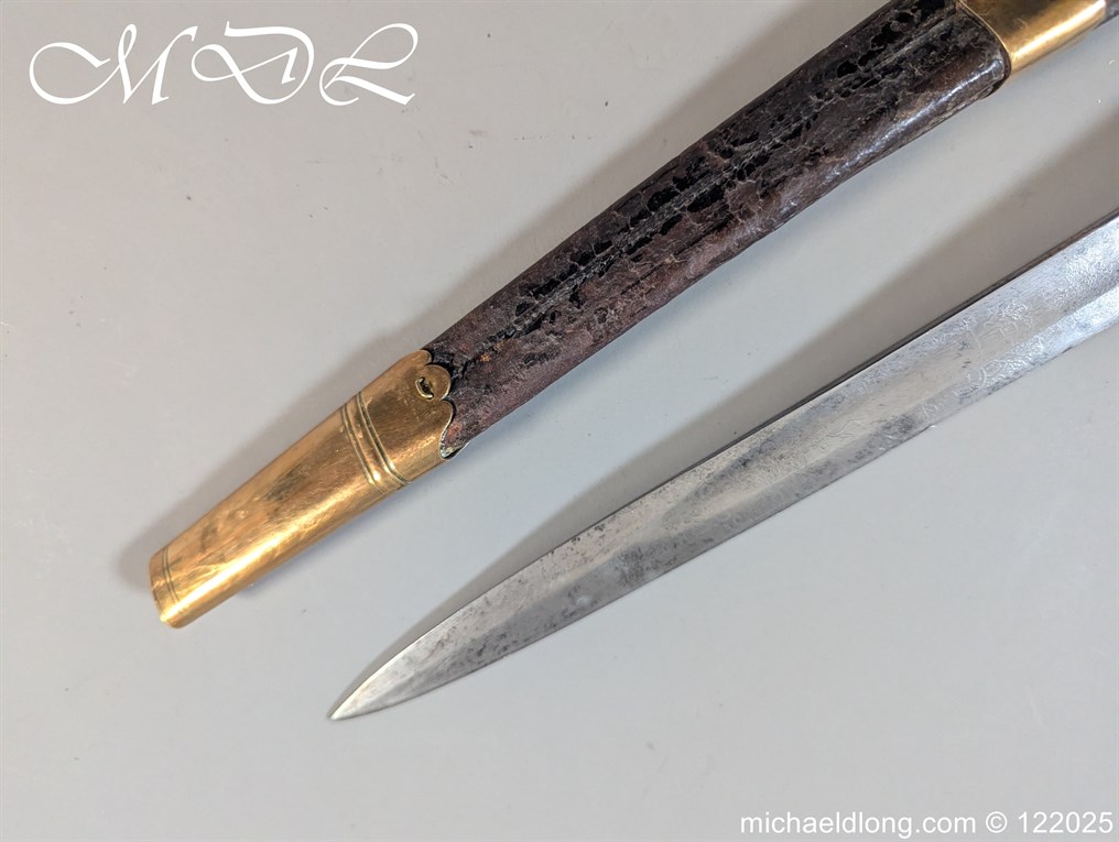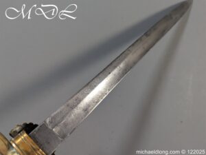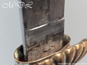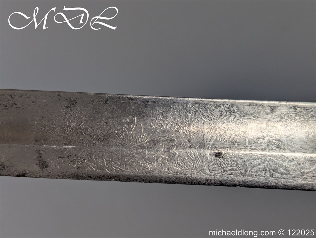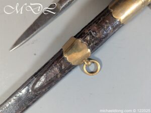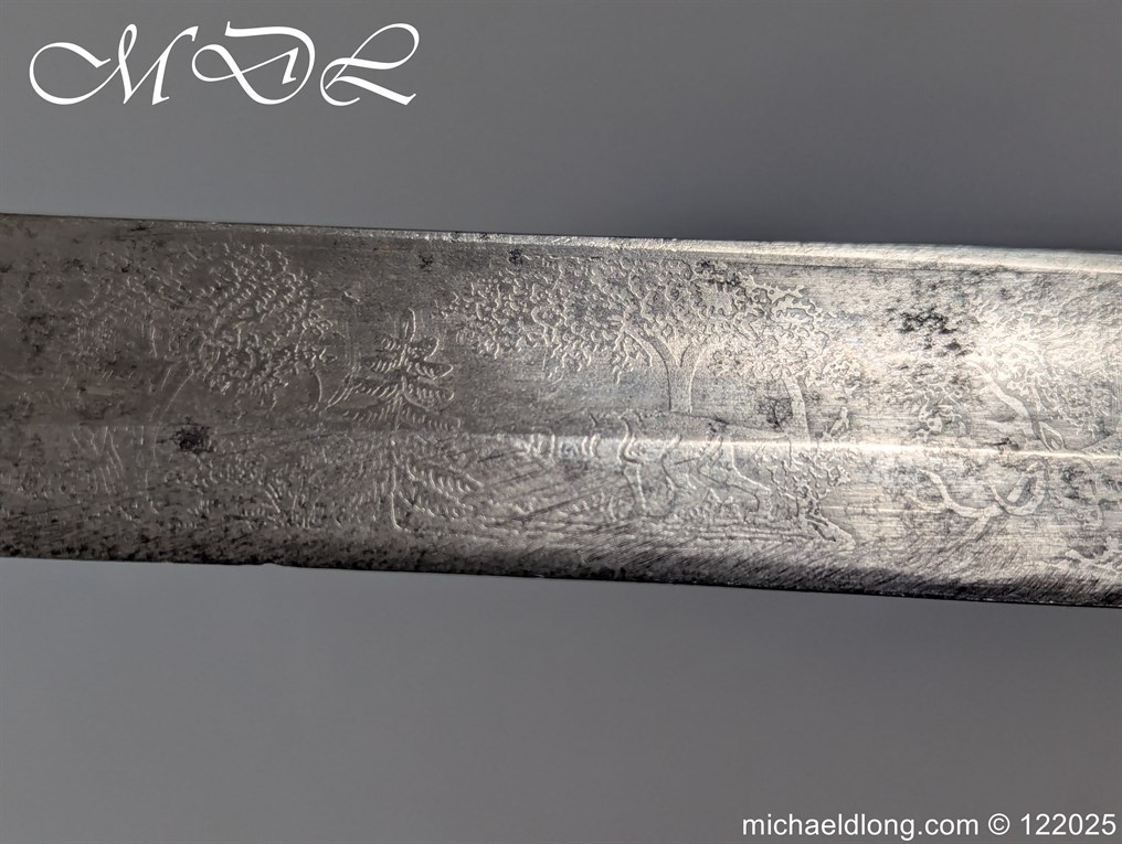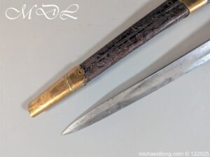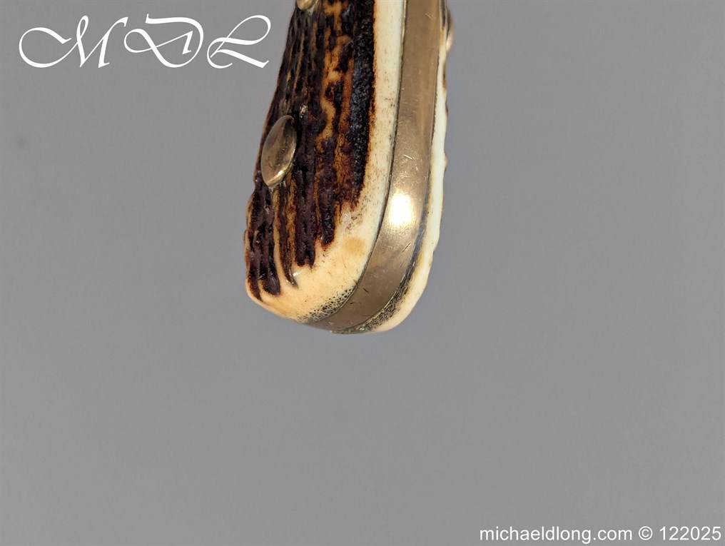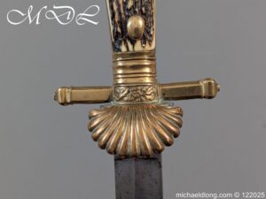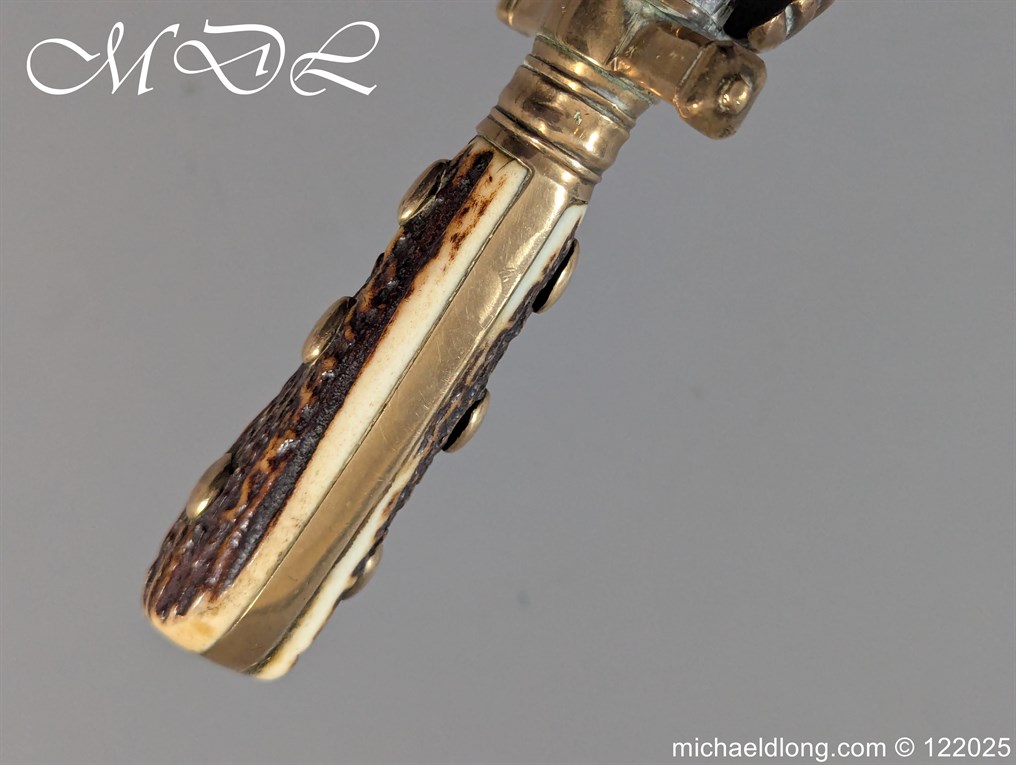 German 19th Century Hunting Hanger by Weyersberg Kirschbaum & Cie. Super quality, gilt brass hilt with riveted stag horn grips and small shell guard and straight quillions. The blade engraved with hunting scene’s and wildlife and stamped with markers mark under the shell guard W K & C – Weyersberg Kirschbaum & Cie was the amalgamation of two very old Solingen family companies in 1883 Complete with leather scabbard with matching mounts and ensuite knife. Overall length 20.5 inch the blade 15.5 inch