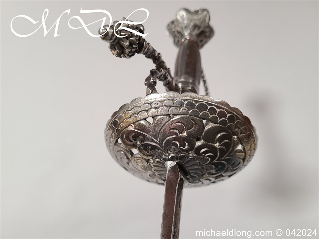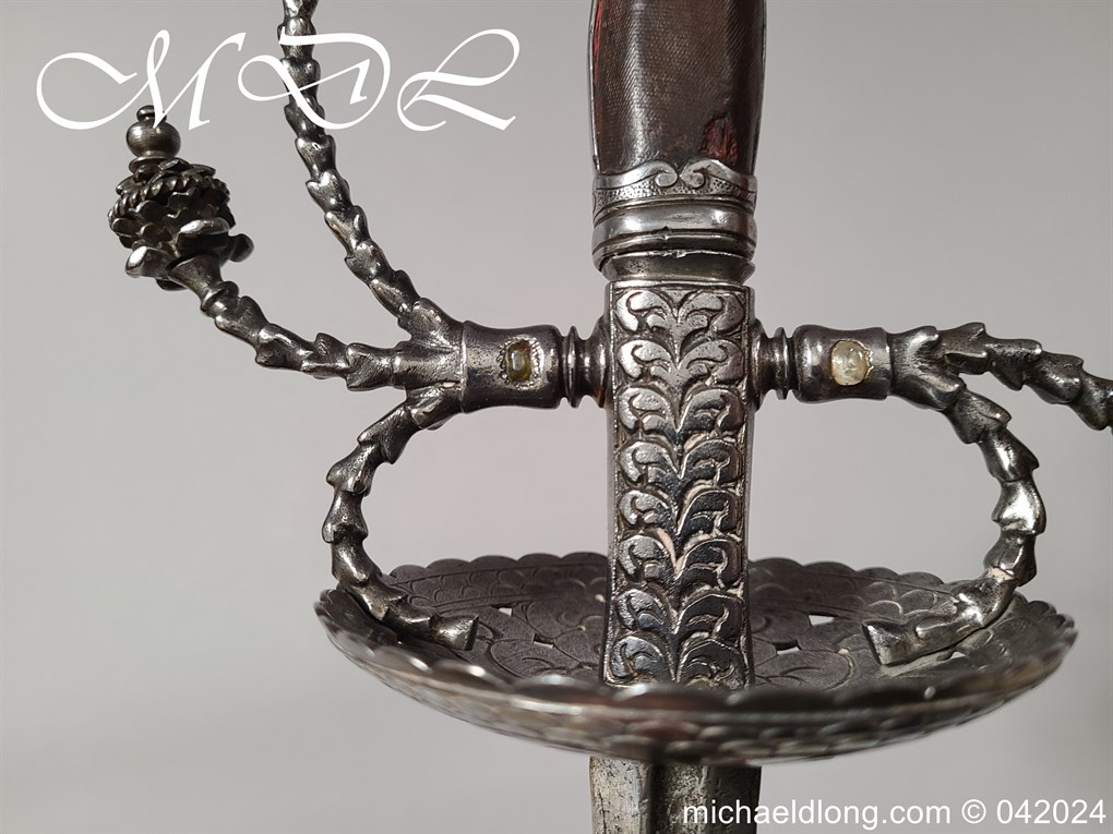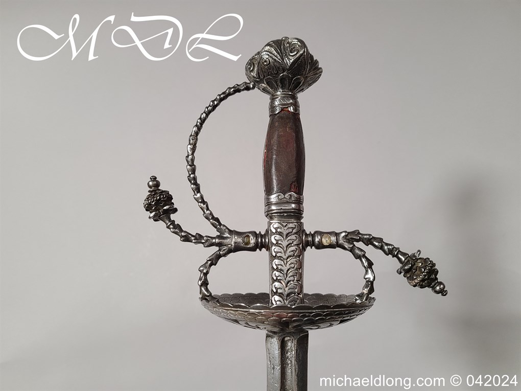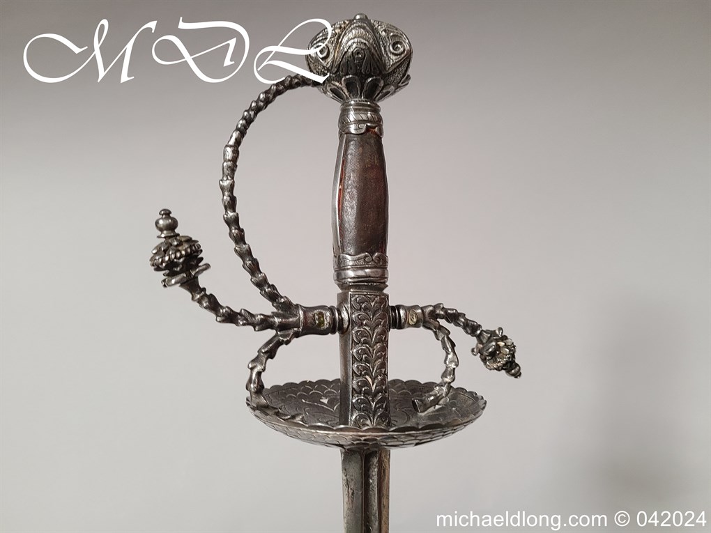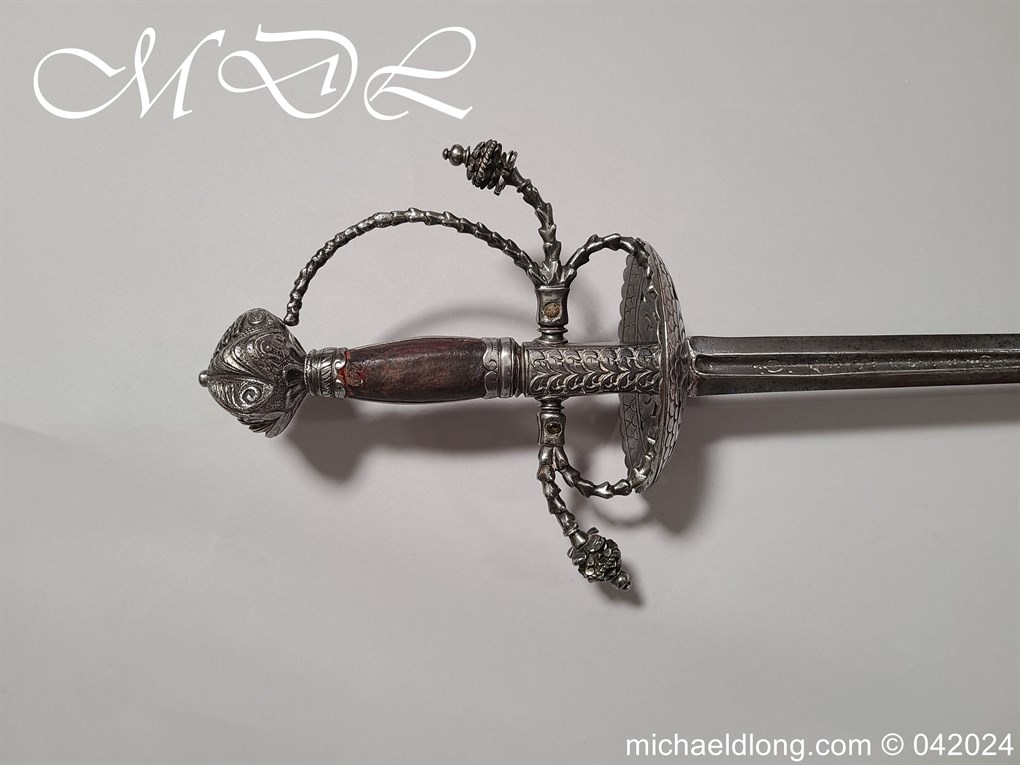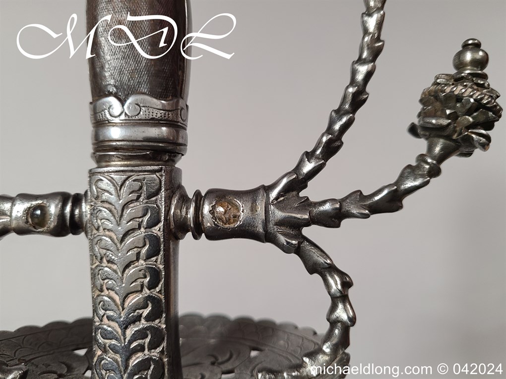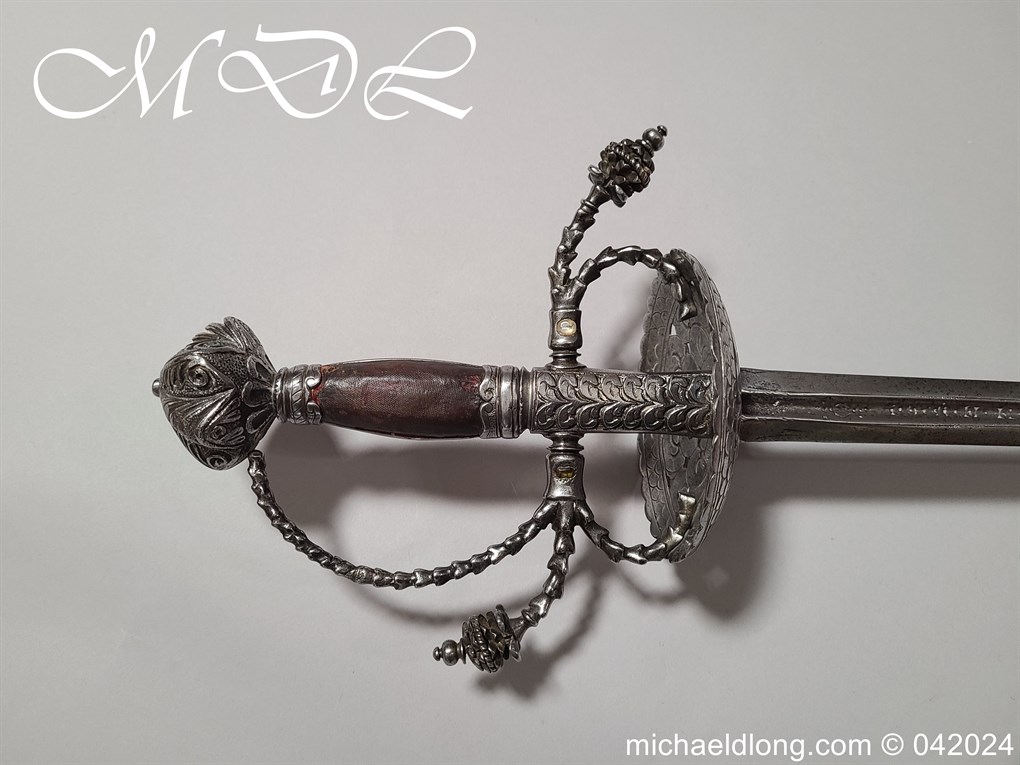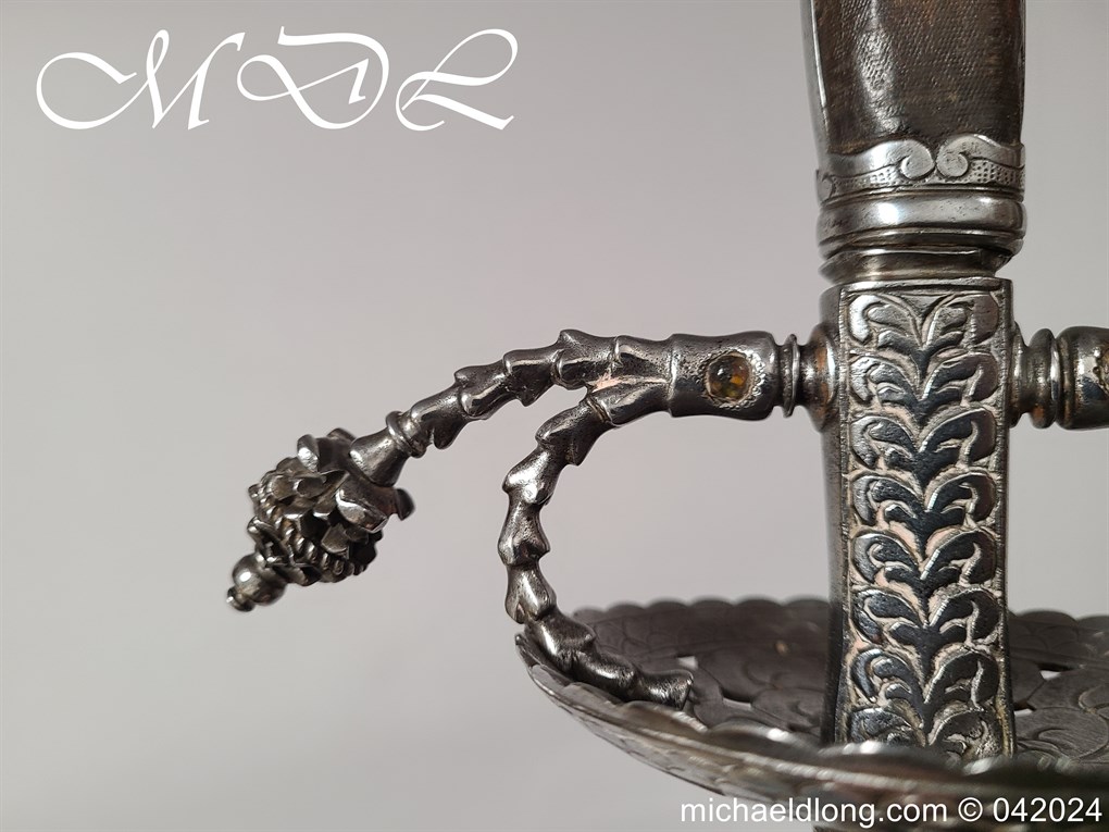 Cup Hilt Rapier c 1620 possibly German or Swiss, highly decorative chiselled pommel. The D guard leading down to form the cross guard which has inset stones, sweeping langets finish with large flower buds and curved sections to support the excellent cup guard with pieced and chiselled designs. The blade double edged with central fuller engraved with imperial orb and maker mark IOHANES WVNDES – Johannes Wundes 1560 – 1620 please note the engraving is worn but letters can be made out. Overall length 102cm the blade 92cm