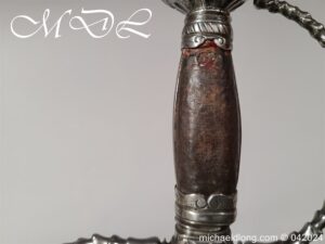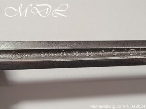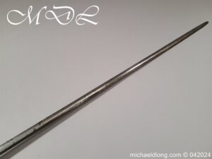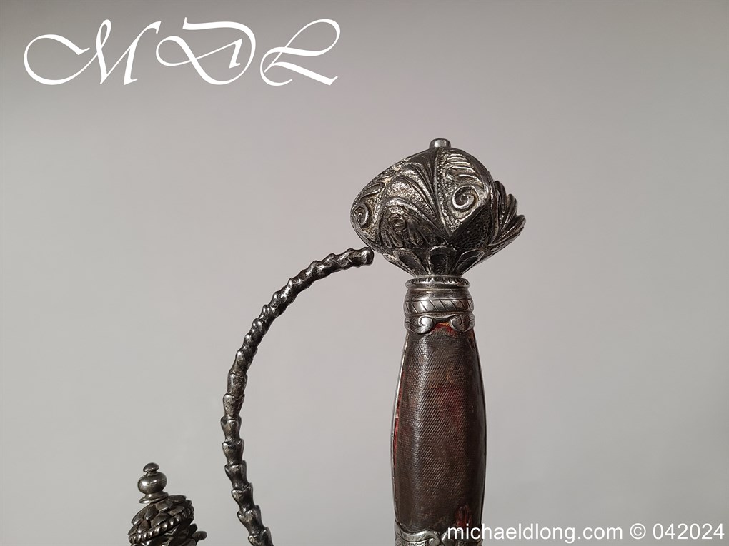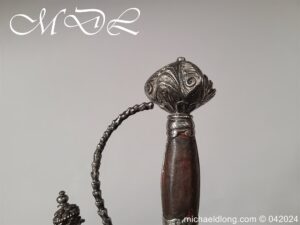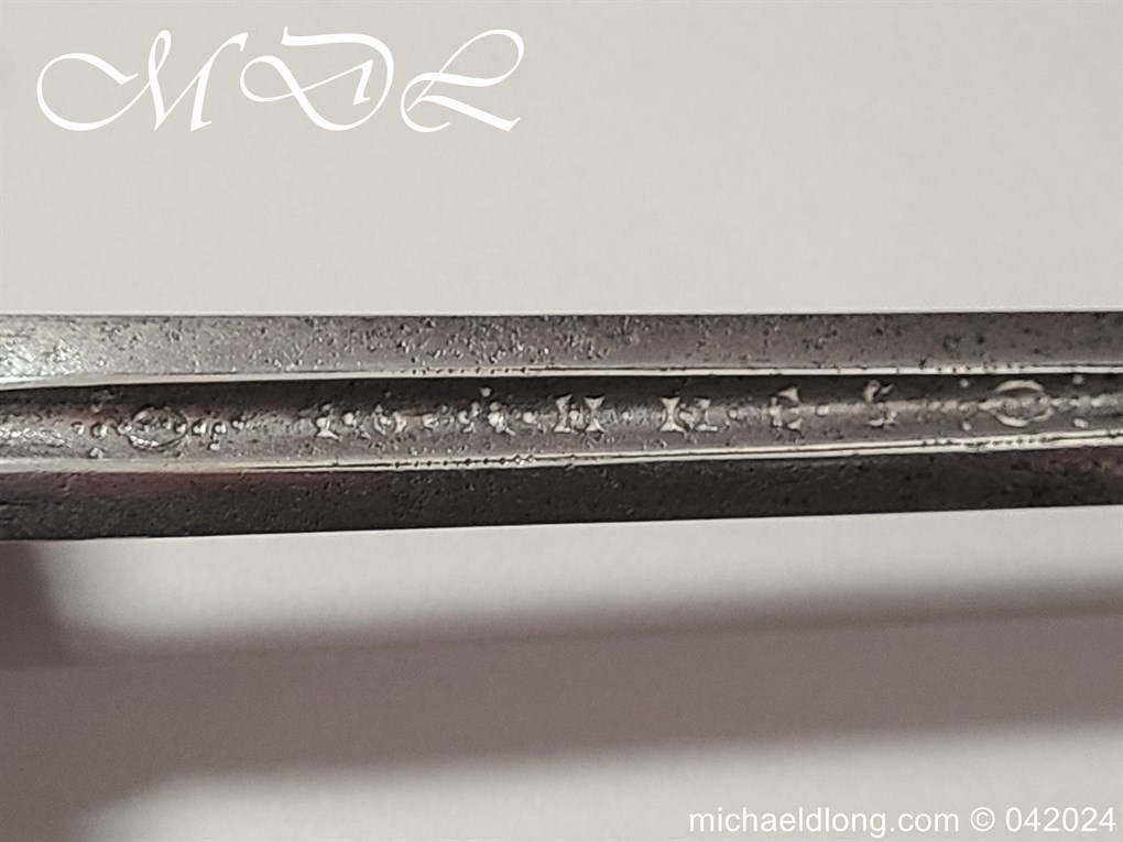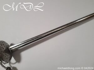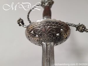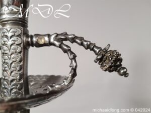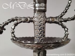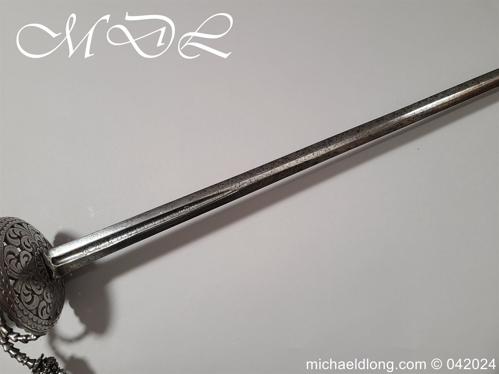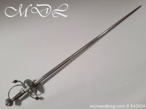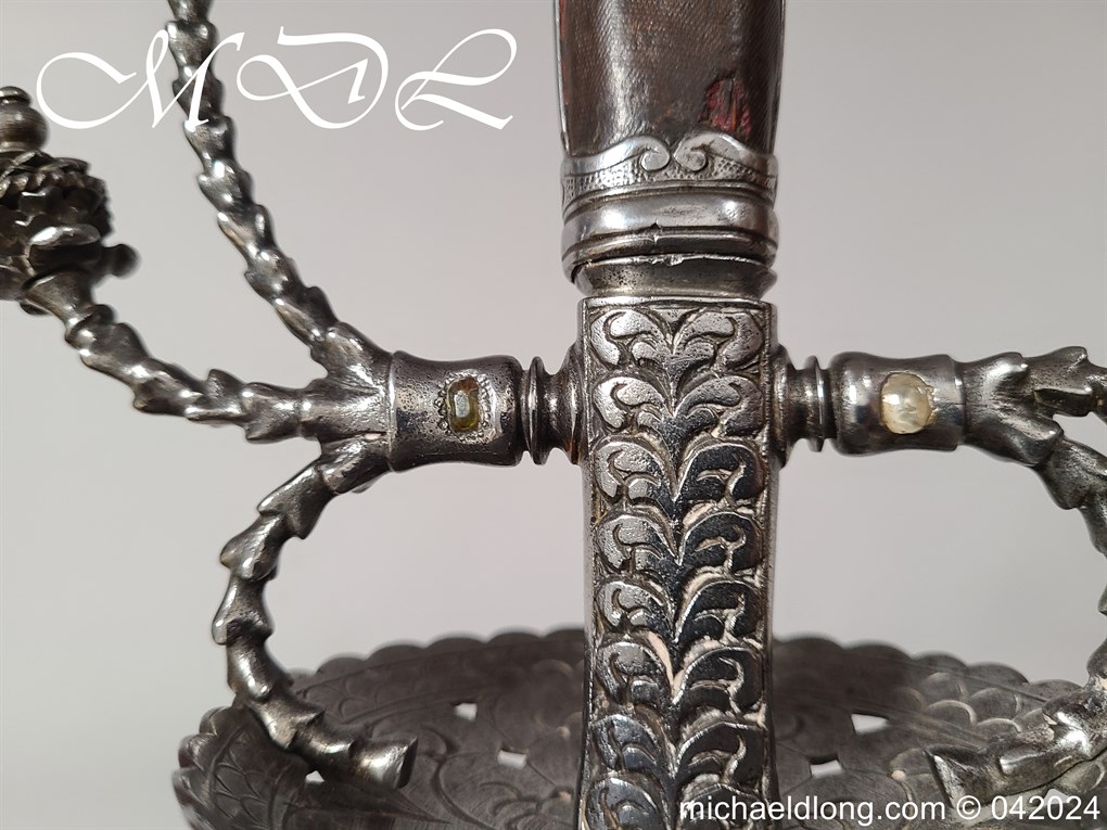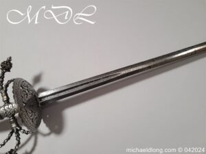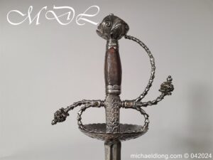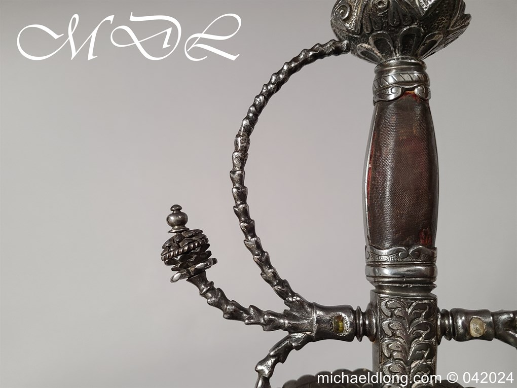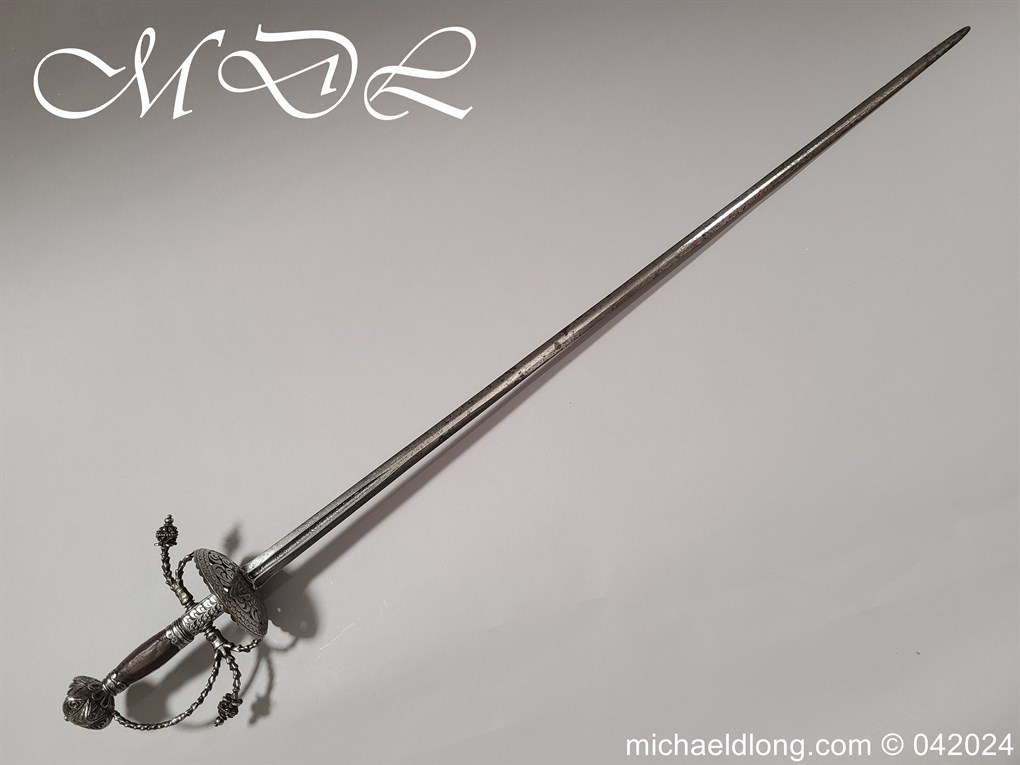 Cup Hilt Rapier c 1620 possibly German or Swiss, highly decorative chiselled pommel. The D guard leading down to form the cross guard which has inset stones, sweeping langets finish with large flower buds and curved sections to support the excellent cup guard with pieced and chiselled designs. The blade double edged with central fuller engraved with imperial orb and maker mark IOHANES WVNDES – Johannes Wundes 1560 – 1620 please note the engraving is worn but letters can be made out. Overall length 102cm the blade 92cm