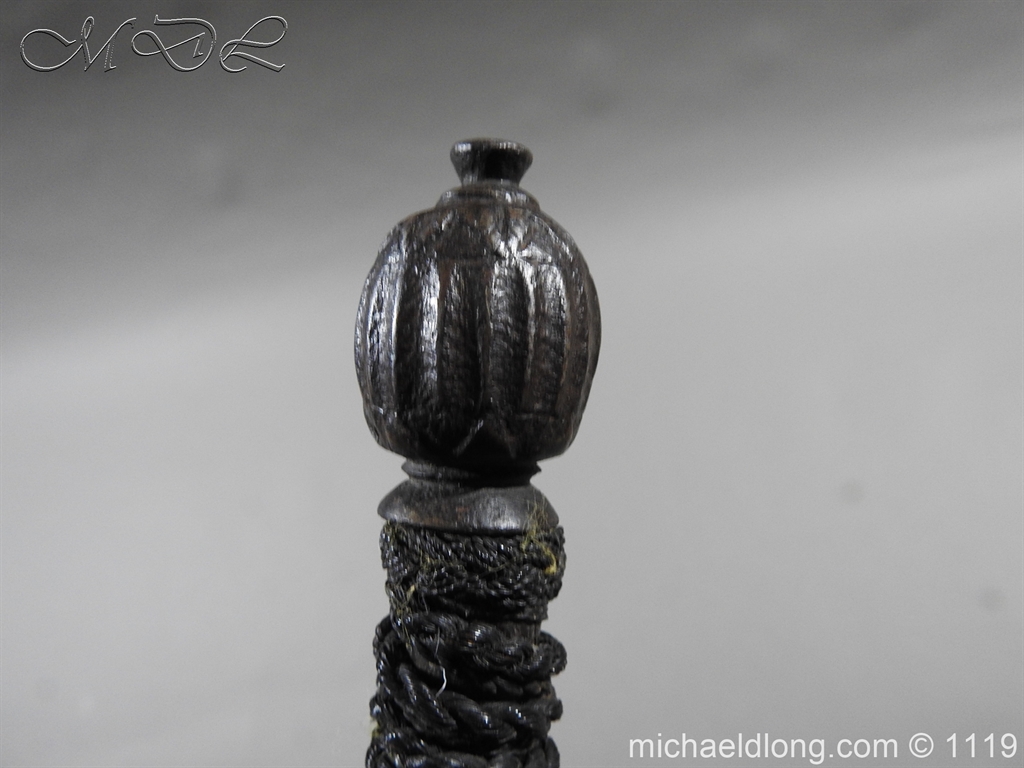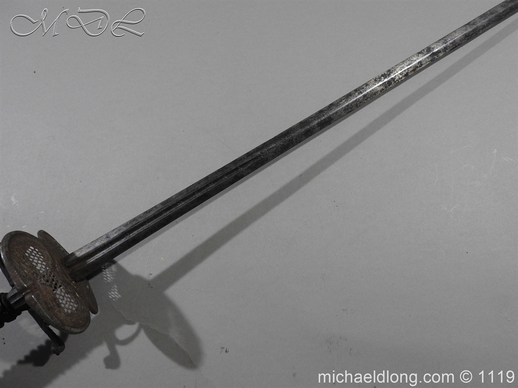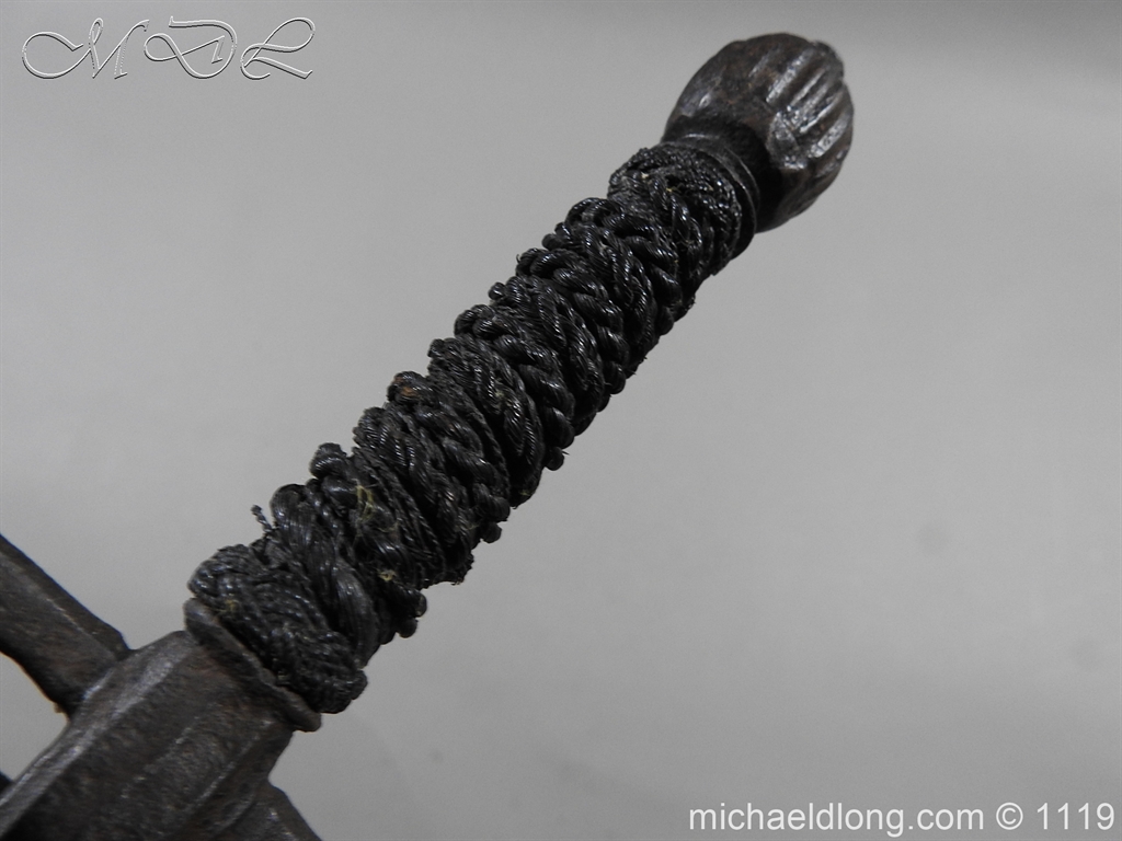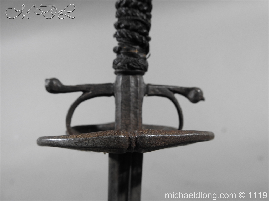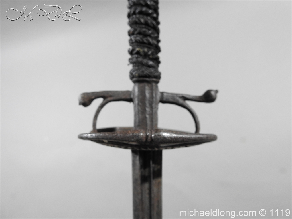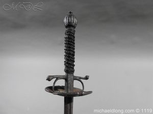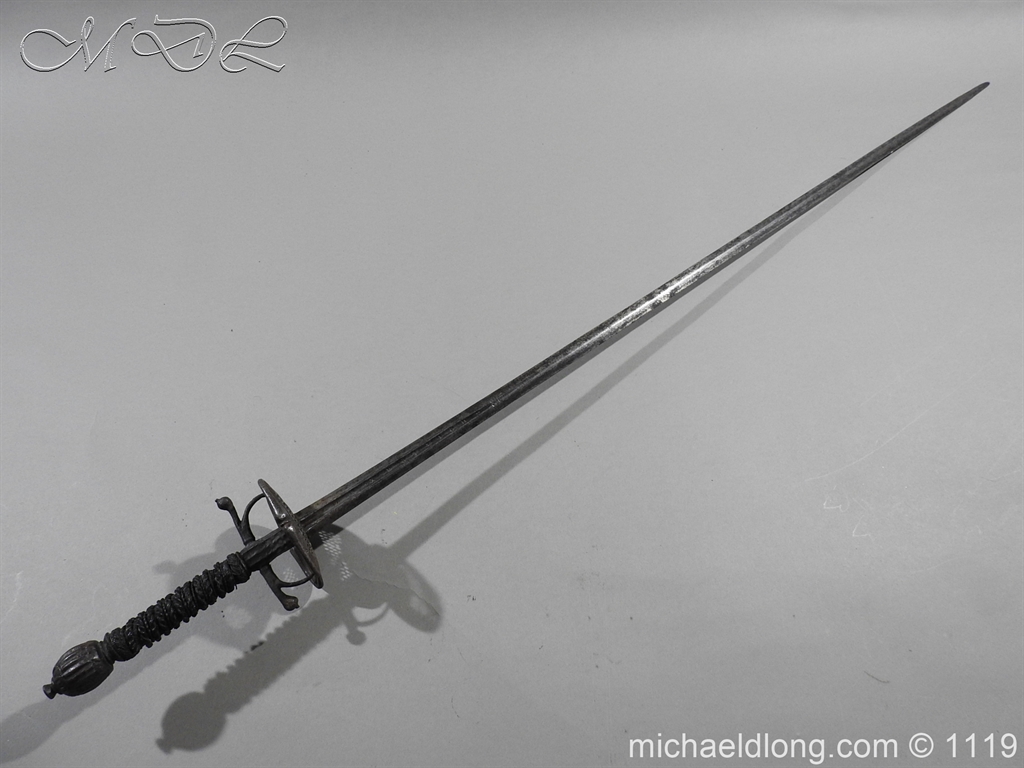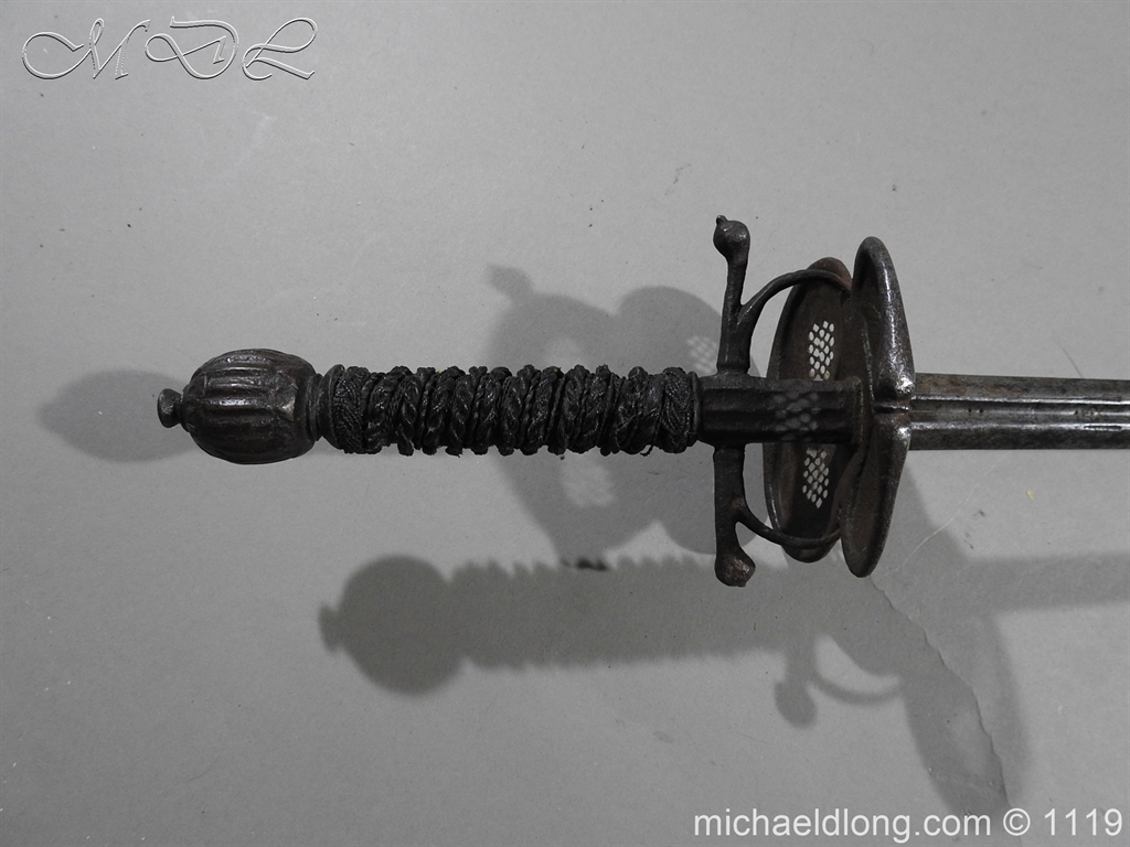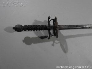 German Duelling Sword c 1675, rustic hilt with pierced shell guards and original profiled wire bound grip. Decorative pommel with short quillons leading down to the shell guards. Straight slender double edged blade with small central fuller which is engraved with makers name and various period marking. Over all length 105cm blade blade 87cm