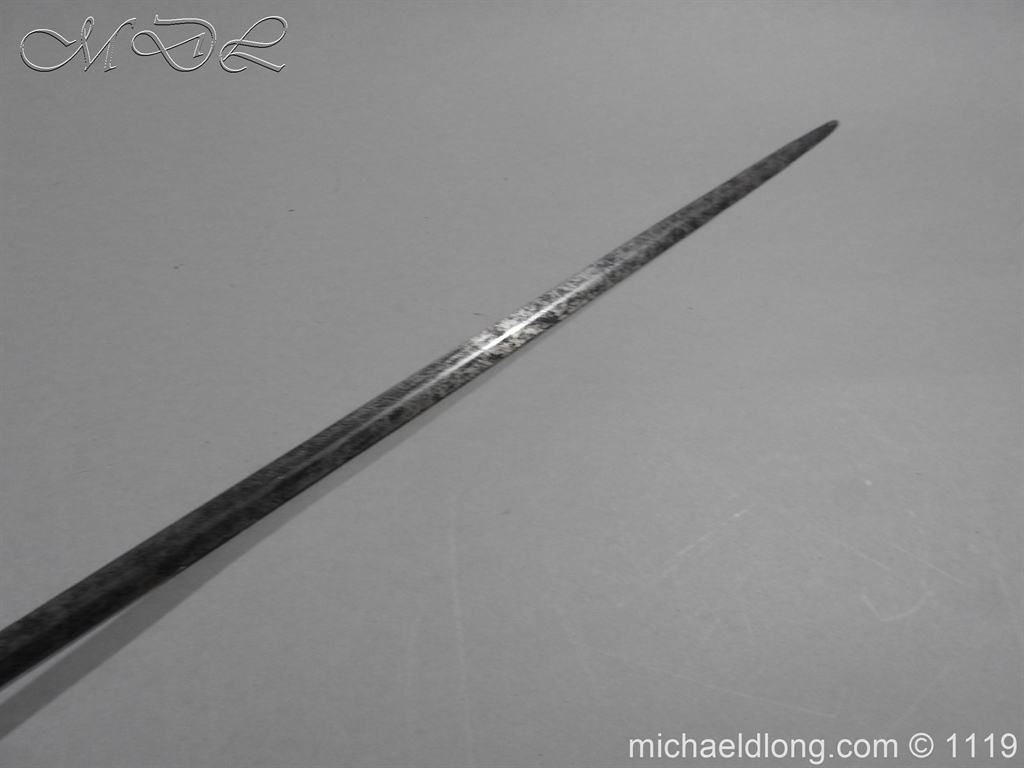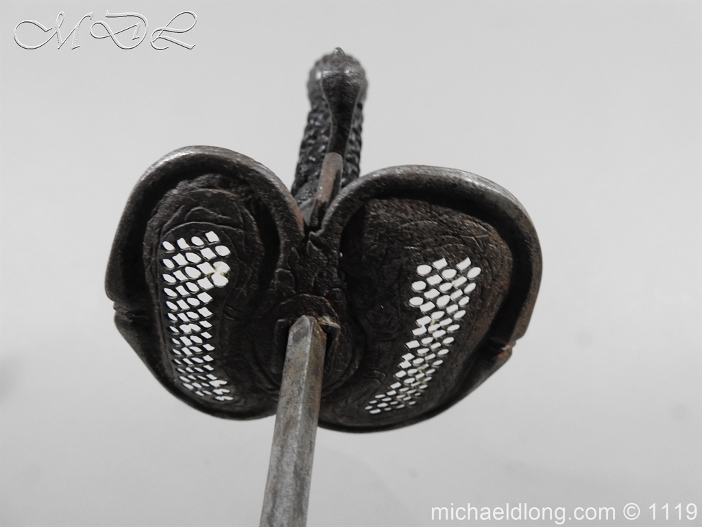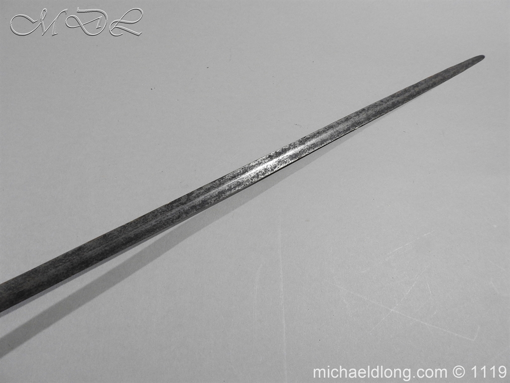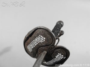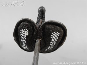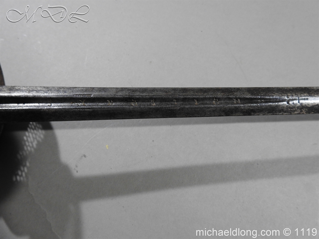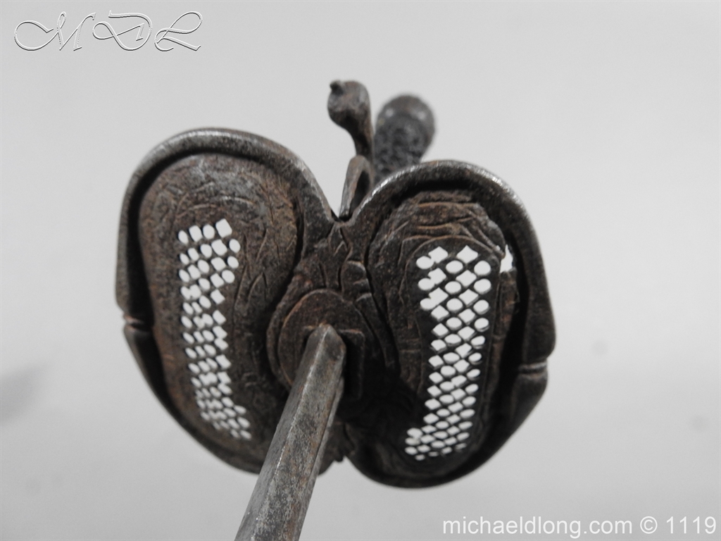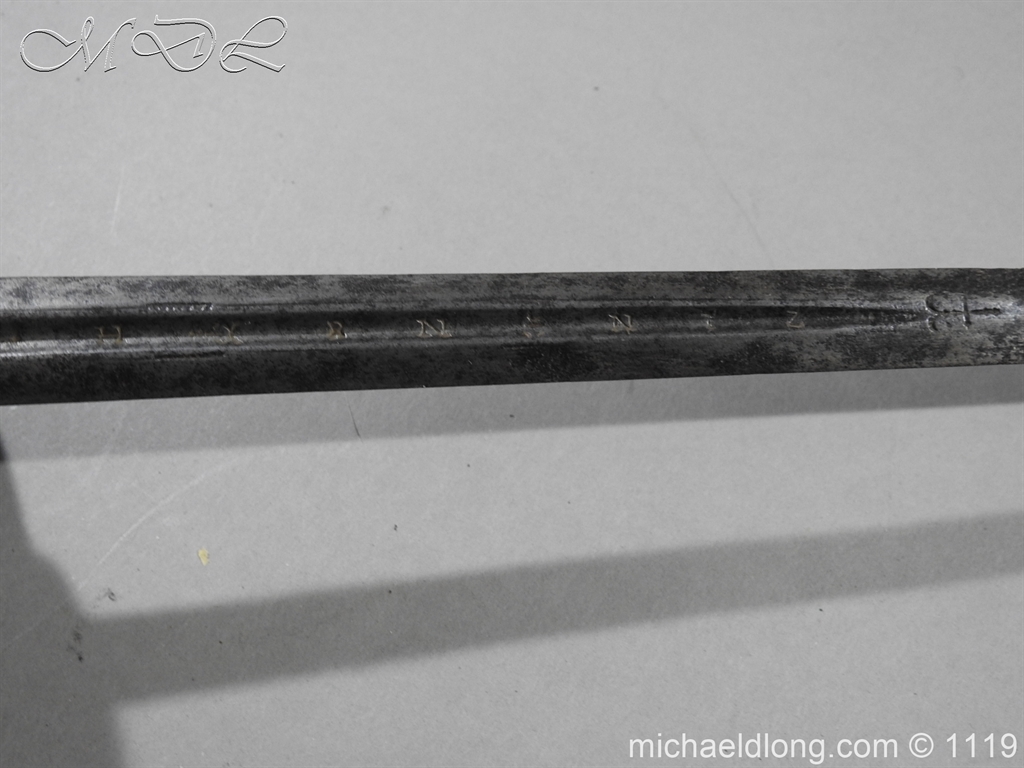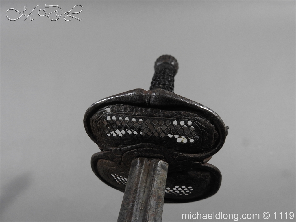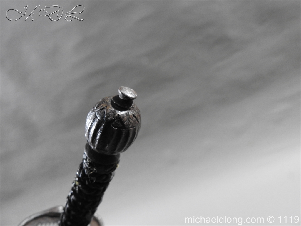German Duelling Sword c 1675, rustic hilt with pierced shell guards and original profiled wire bound grip. Decorative pommel with short quillons leading down to the shell guards. Straight slender double edged blade with small central fuller which is engraved with makers name and various period marking. Over all length 105cm blade blade 87cm