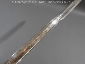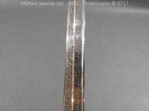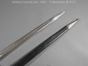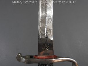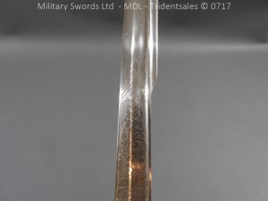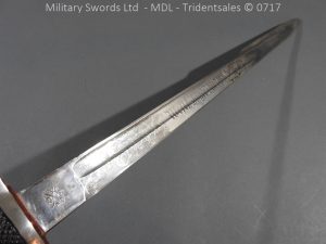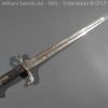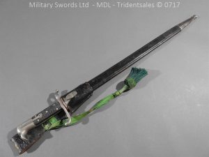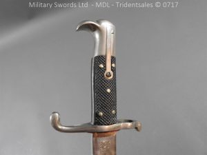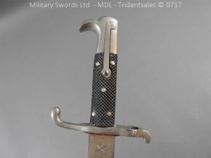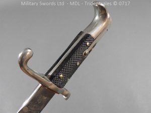 Hf.71 Dress/presentation – Birds head style steel hilt with a ‘T’ slot, a round steel push button with an external leaf spring held by a screw, two piece chequered leather grips with an oil hole held by steel pins, ‘S’ shape steel crossguard with upturned quillion and muzzle ring, rear of the guard unmarked. Single edge pipeback steel blade with square shaped fullers the ricasso marked with Crown C.K.Co & crossed swords, etched and plated with foilage, trophies of arms and a panel Weftf Jäger Bat. No7. Steel mounted black leather scabbard, All metal parts heavily nickel plated. German open leather frog and green Jaeger knot.