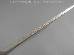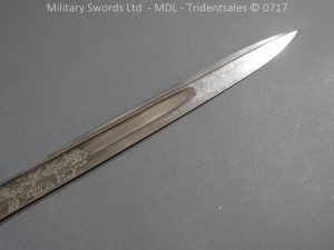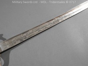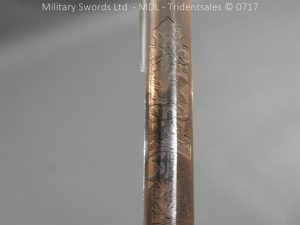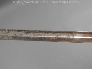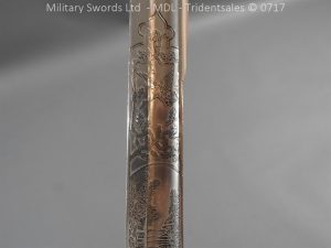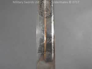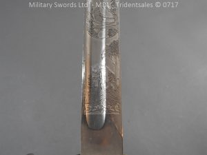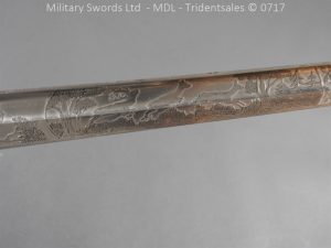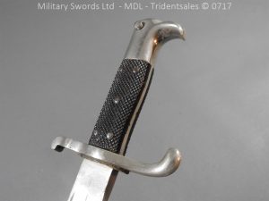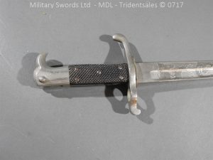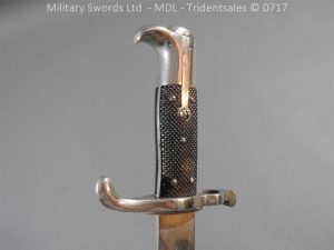 Hf.71 Dress/presentation – Birds head style steel hilt with a T slot, a round steel push button with an external leaf spring held by a screw, two piece chequered leather grips with an oil hole held by steel pins, S shape steel crossguard with upturned quillion and muzzle ring, rear of the guard unmarked. Single edge pipeback steel blade with square shaped fullers the ricasso unmarked and etched and plated with foilage deer and a hunter, all metal parts heavily nickel plated. No scabbard Very Rare