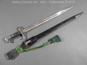 Hf.71 Dress/presentation – Birds head style steel hilt with a ‘T’ slot, a round steel push button with an external leaf spring held by a screw, two piece chequered leather grips with an oil hole held by steel pins, ‘S’ shape steel crossguard with upturned quillion and muzzle ring, rear of the guard unmarked. Single edge pipeback steel blade with square shaped fullers the ricasso marked with Crown C.K.Co & crossed swords, etched and plated with foilage, trophies of arms and a panel Weftf Jäger Bat. No7. Steel mounted black leather scabbard, All metal parts heavily nickel plated. German open leather frog and green Jaeger knot.