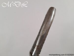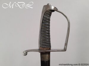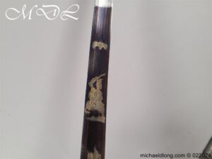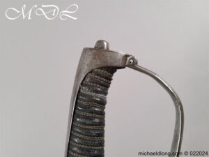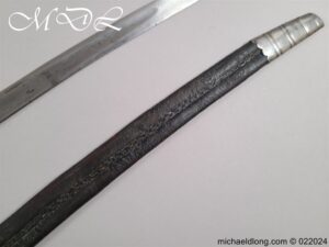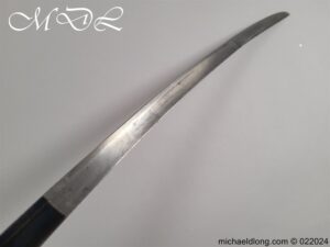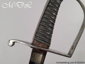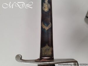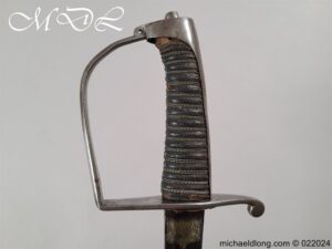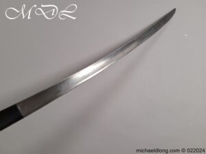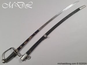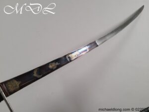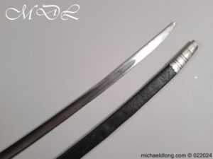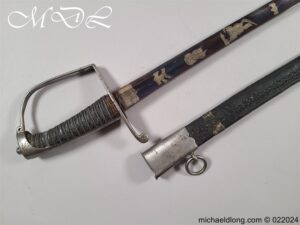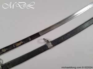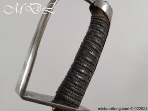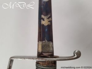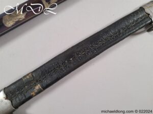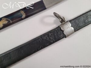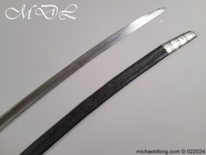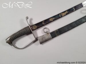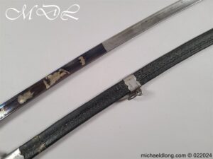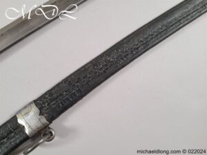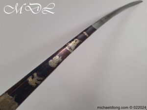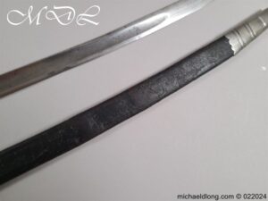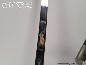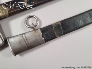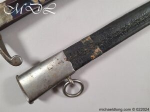 German Infantry Officers Blue and Gilt Sword, all steel hilt with leather grip bound with silver wire please note age wear. The blade slightly curved with good bright blue and gilt decoration. Complete with black leather scabbard with steel mounts, overall length 95.5cm blade 81.5cm