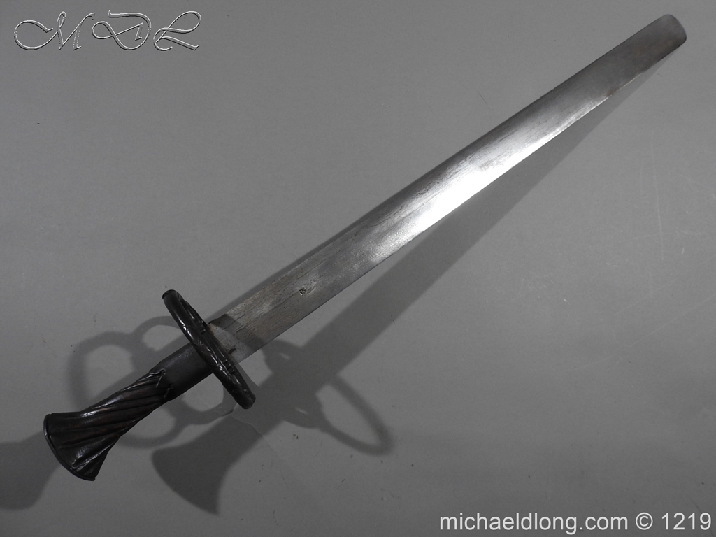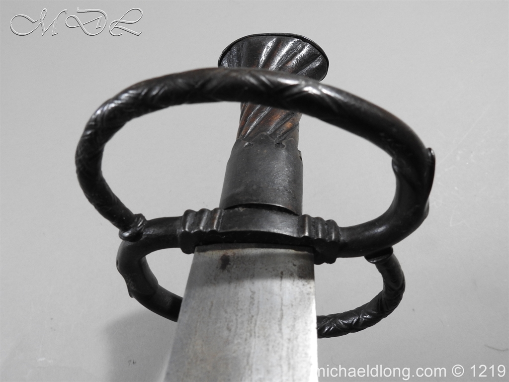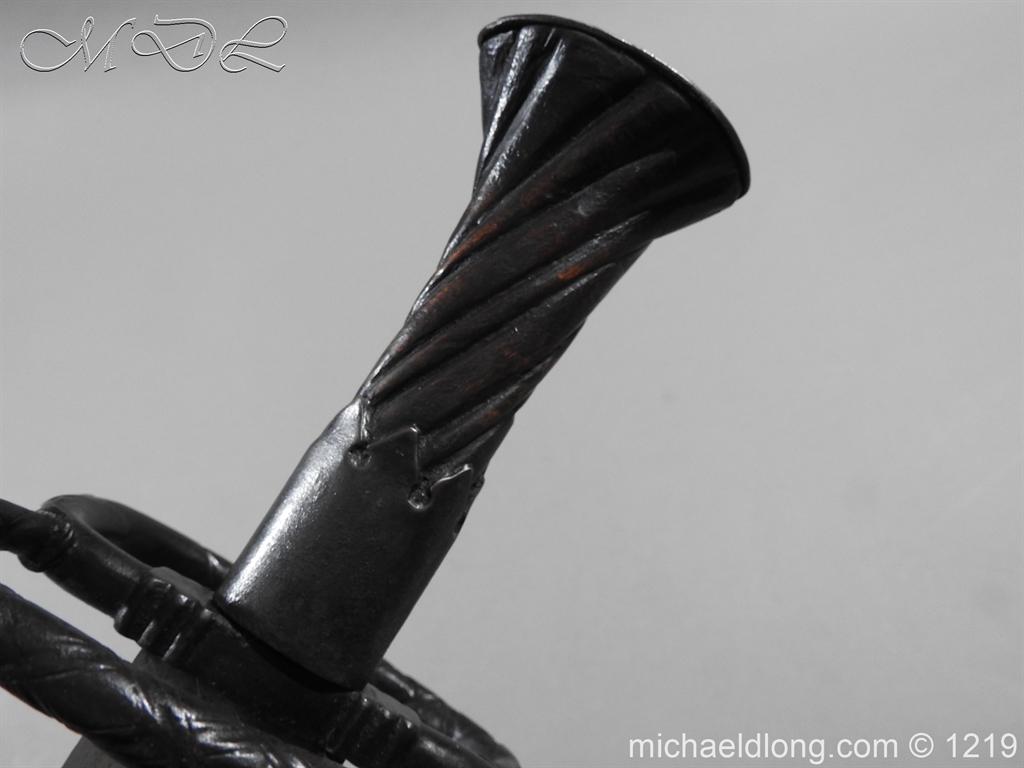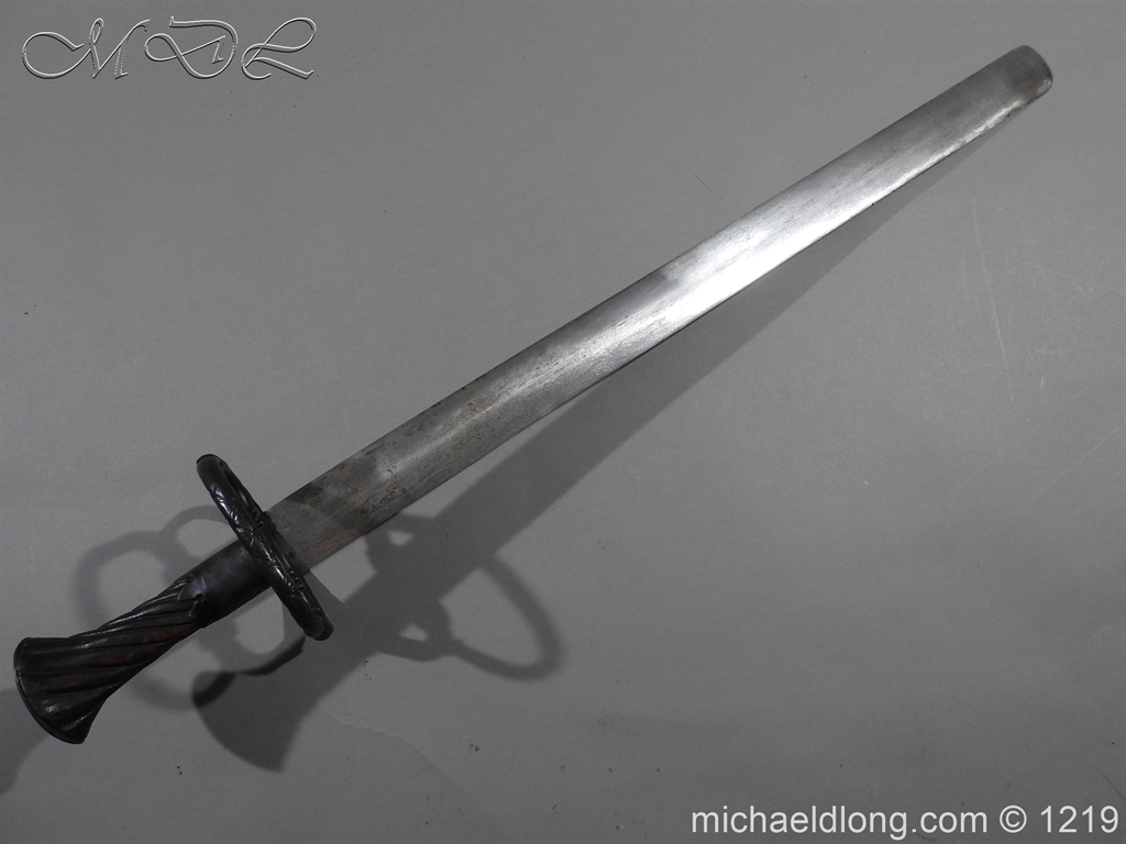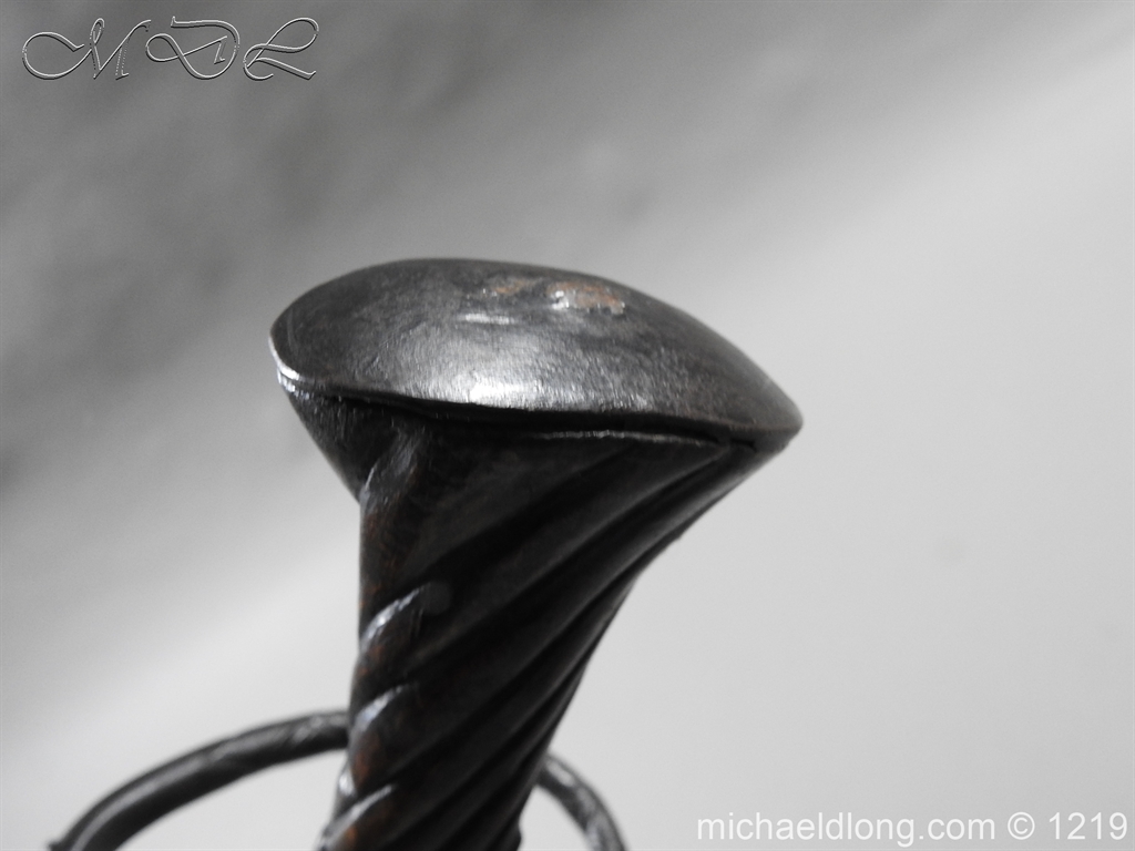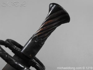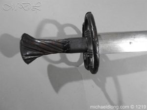 Victorian German Landsknecht Sword with steel hilt with recurved quillons, double edged blade with armour’s mark and flatted point. The wooden curved grip has a flat shaped pommel cap and steel collar base. Excellent sword with good colour overall length 81cm blade 66cm