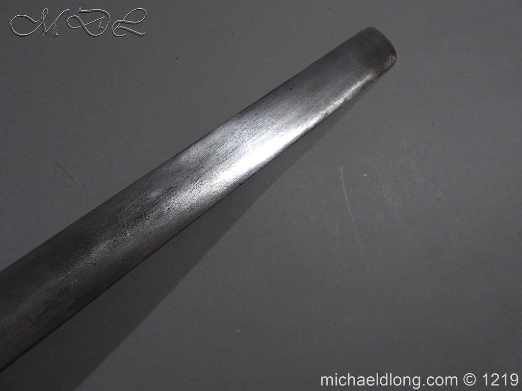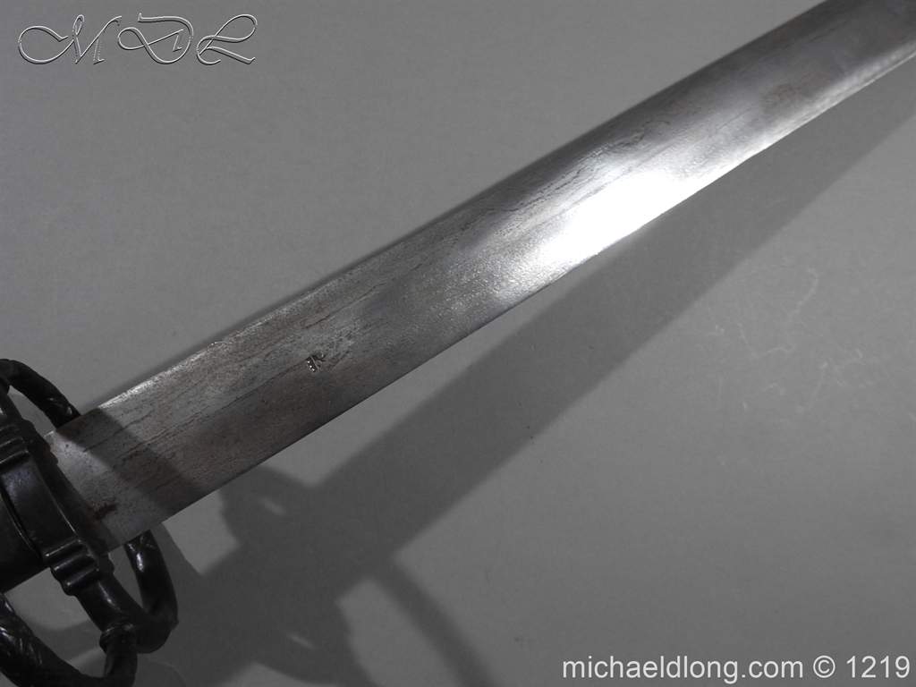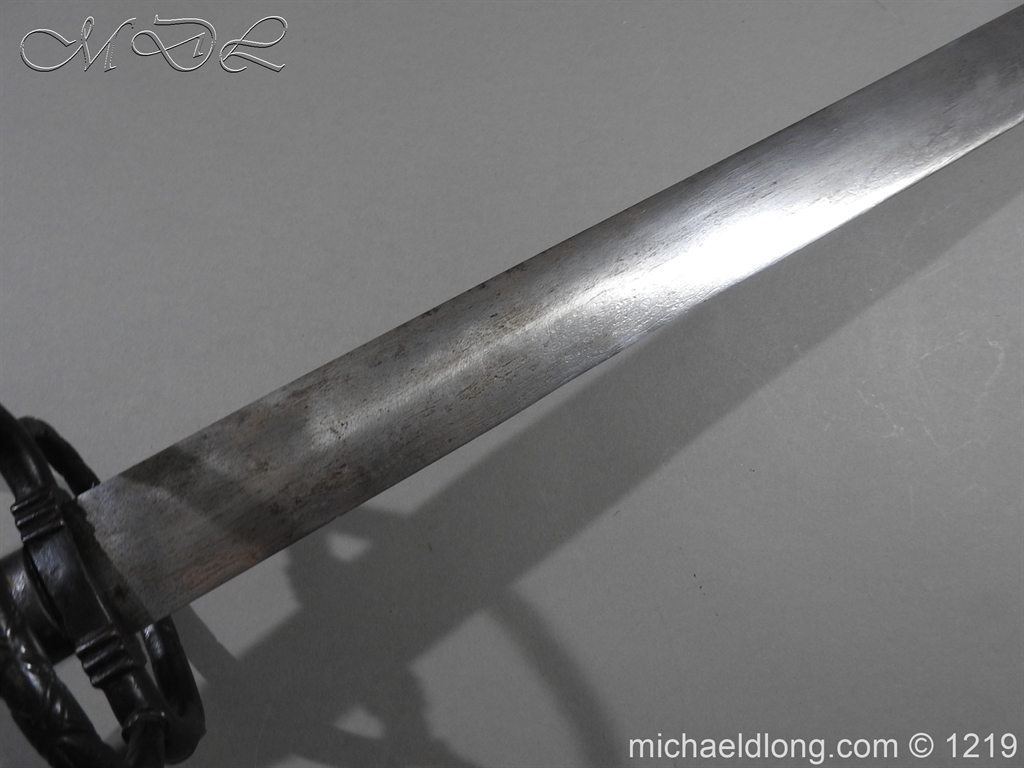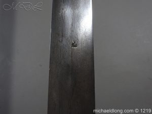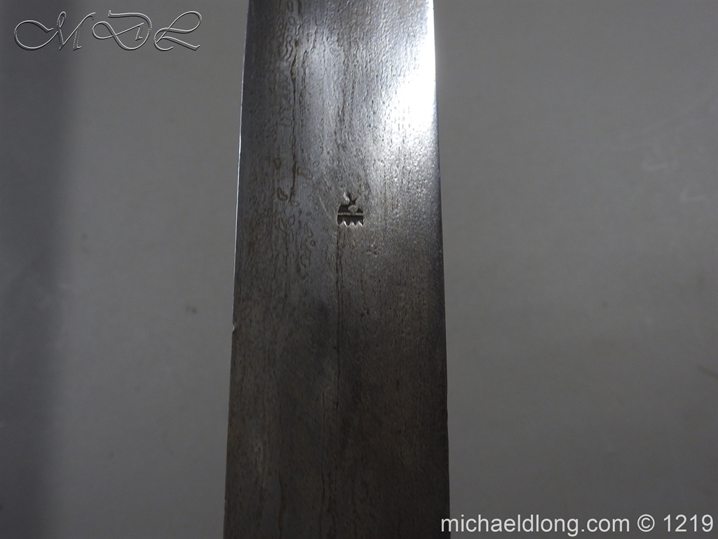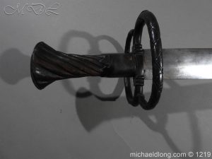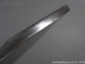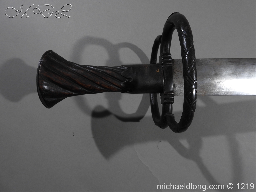 Victorian German Landsknecht Sword with steel hilt with recurved quillons, double edged blade with armour’s mark and flatted point. The wooden curved grip has a flat shaped pommel cap and steel collar base. Excellent sword with good colour overall length 81cm blade 66cm