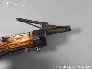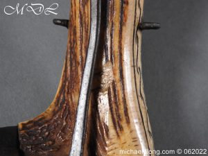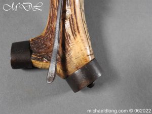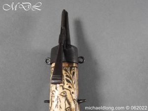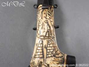 German Powder-Flask 16th Century With forked body of natural staghorn, the front polished and engraved with a female figure, the engraving picked-out in black pigment, iron mounts the top one with spring mechanism tapering nozzle with sprung tap, sprung cut-off lever, slender belt hook with makers mark stamped into the bone behind and possibly identified as “Barrelsmith” Saxon c 1620, complete with four rings for suspension