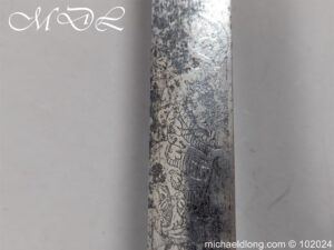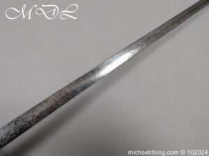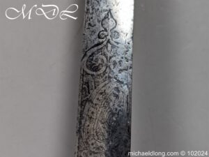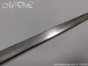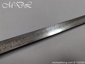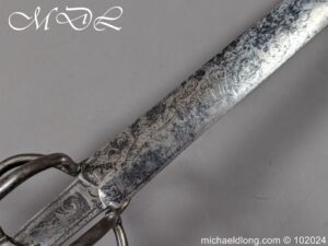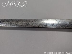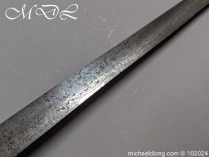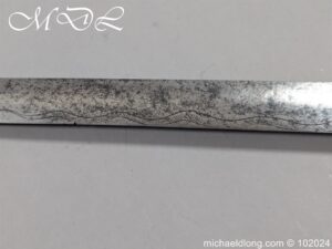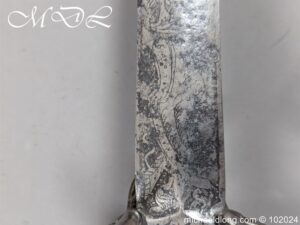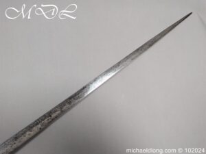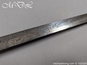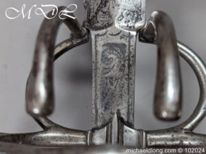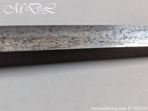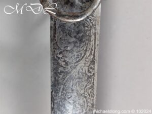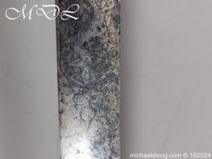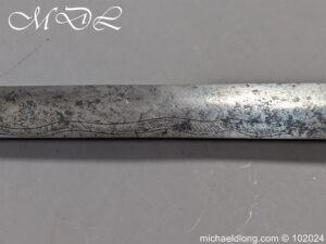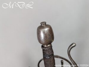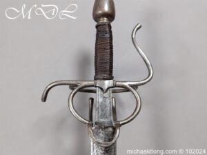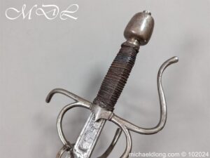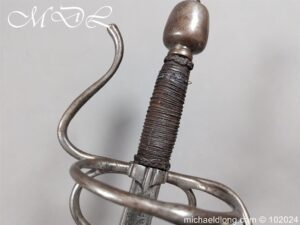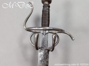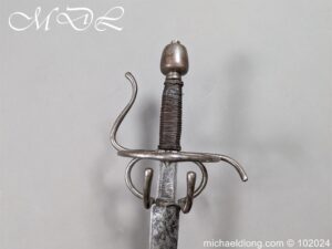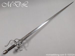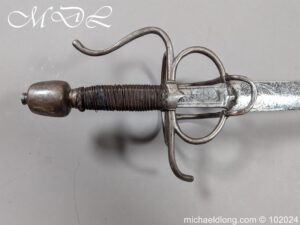 German Saxony Rapier early 17th Century the guard of traditional design with sweeping quillons forming the rear and front guards and single ring. The grip wire bound and does show age wear with round cylindrical pommel. The flattened blade is engraved for the first 22cm and then further with snakes or serpents please see images. The ricasso stamped with swordsmith mark for Tesche Clemens Solingen c 1580 – 1590