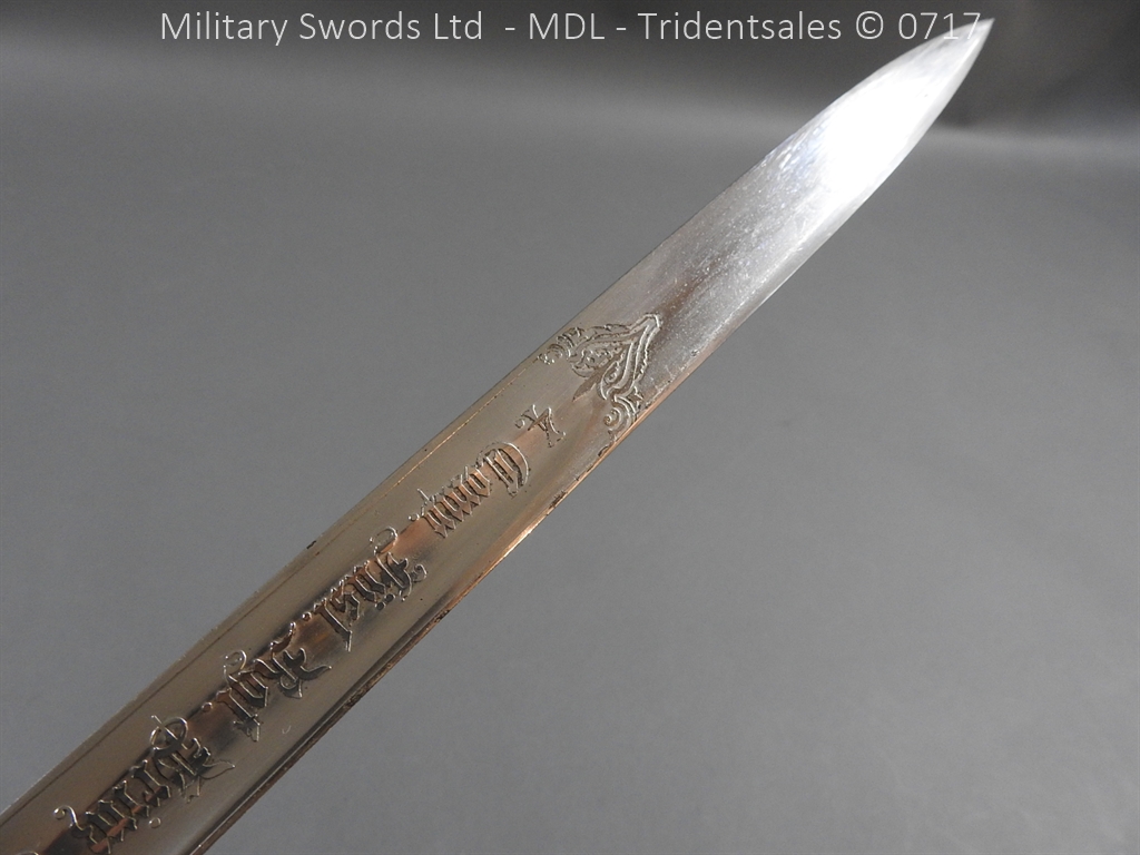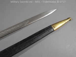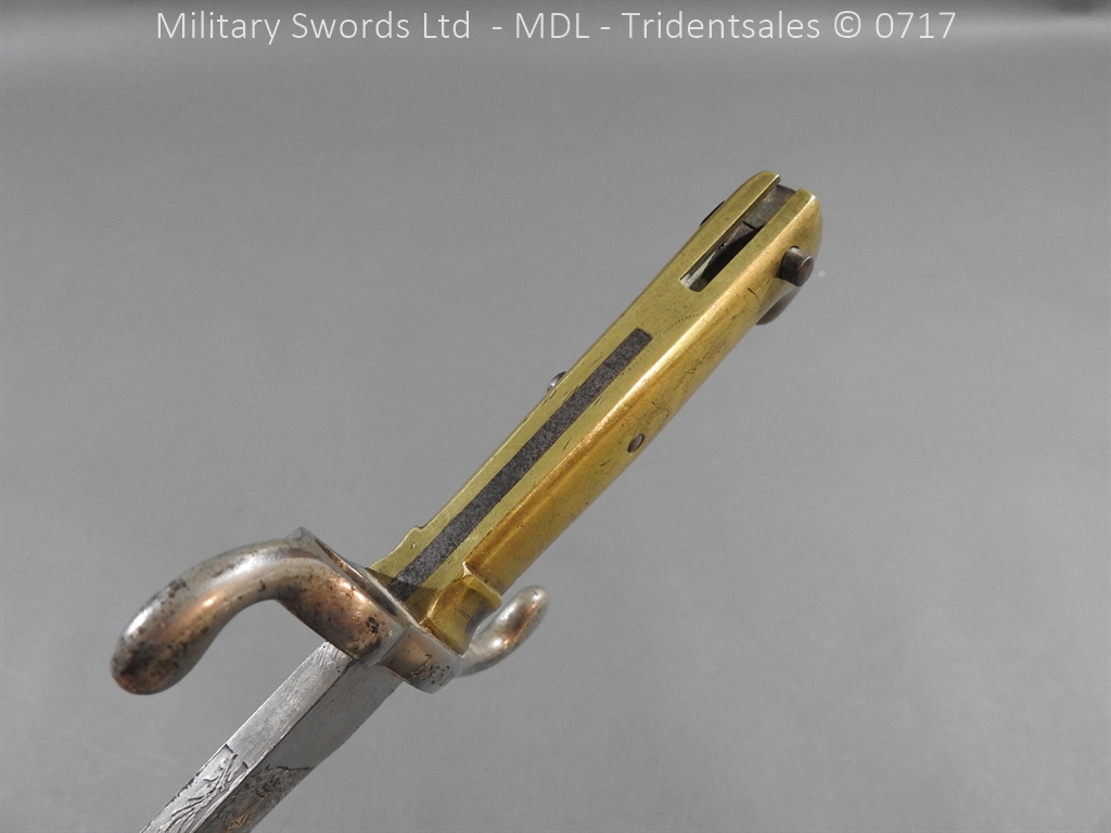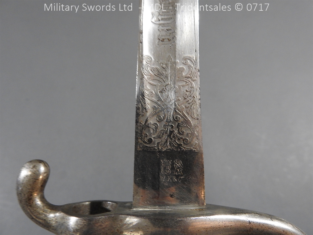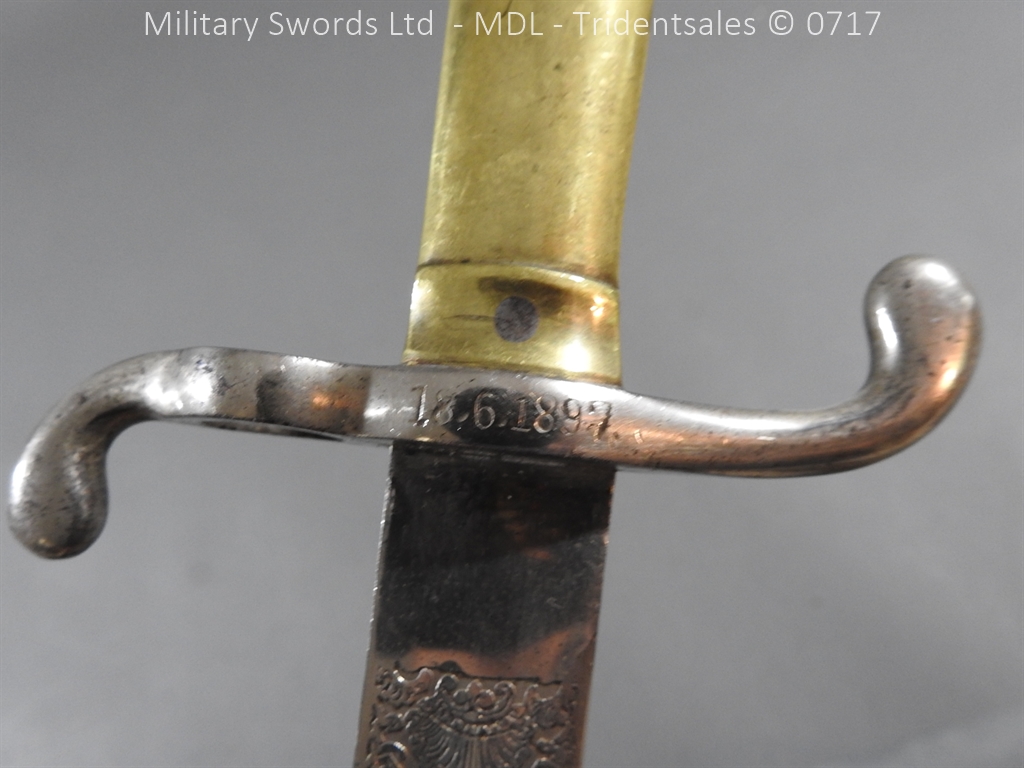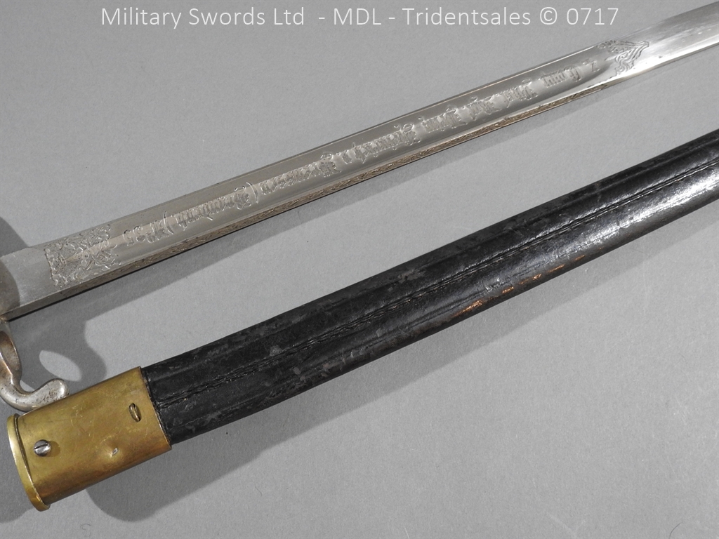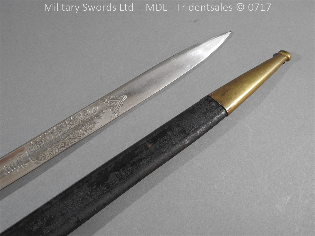 M/71 Cadet slim type – Lined brass hilt with a T slot, a round steel push button with an external leaf spring held by a screw, S shape steel crossguard with upturned quillion and muzzle ring, rear of the guard unmarked. Single edge flat steel sawback blade without fullers stamped King & Knights Head above WK&C. with trophies of arms and floral pattern etched in a panel, the back edge of the blade etched with the retailer/owner J. Thonnes Koblenz. Brass mounted black leather scabbard
