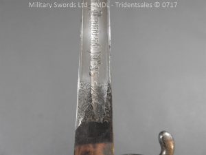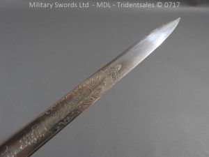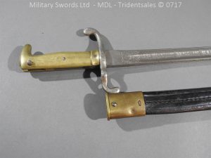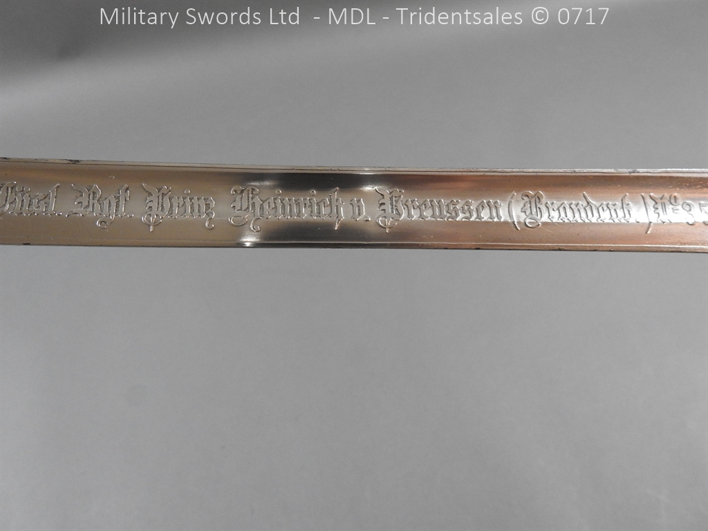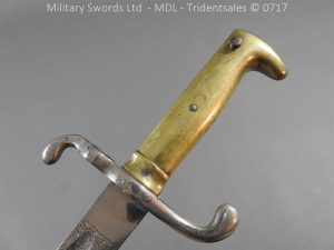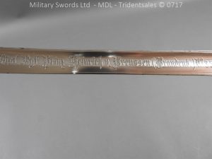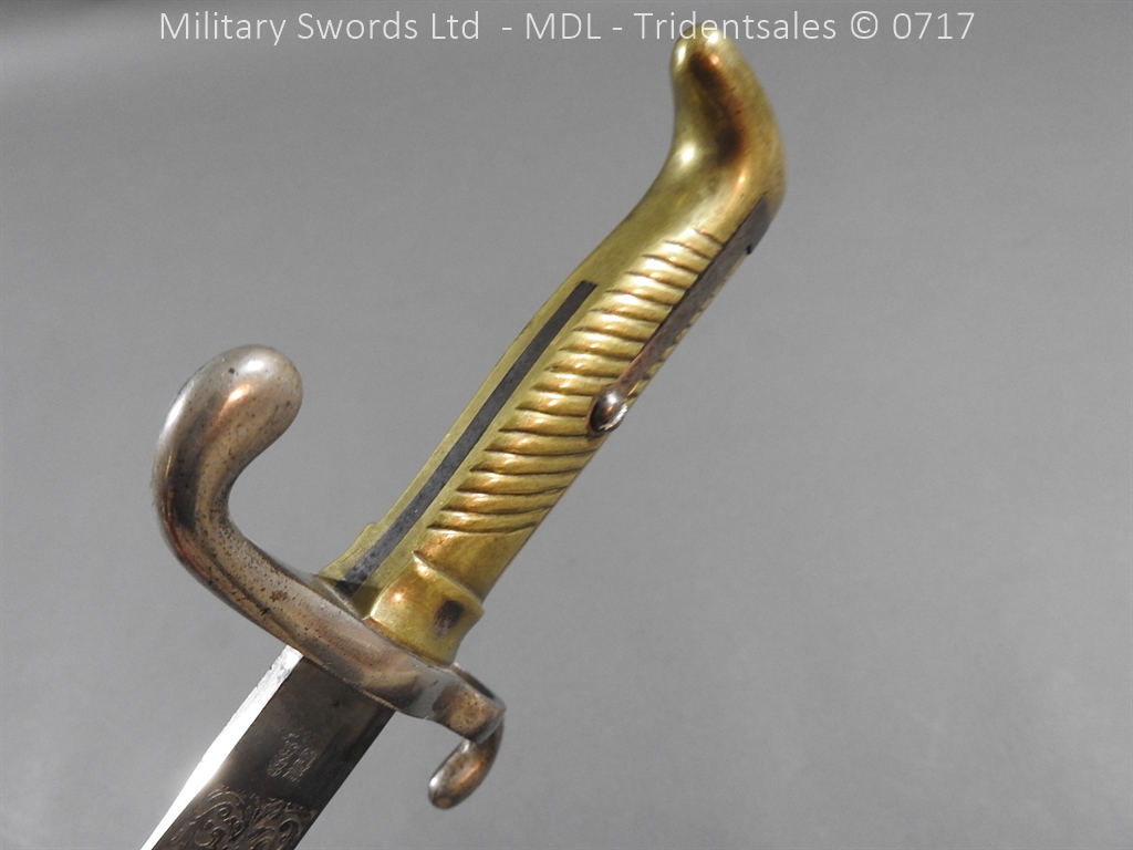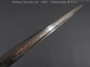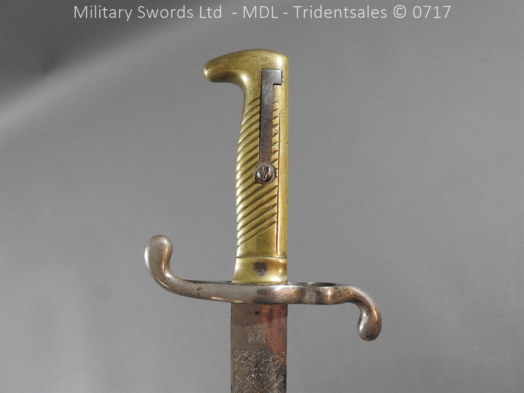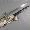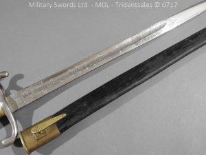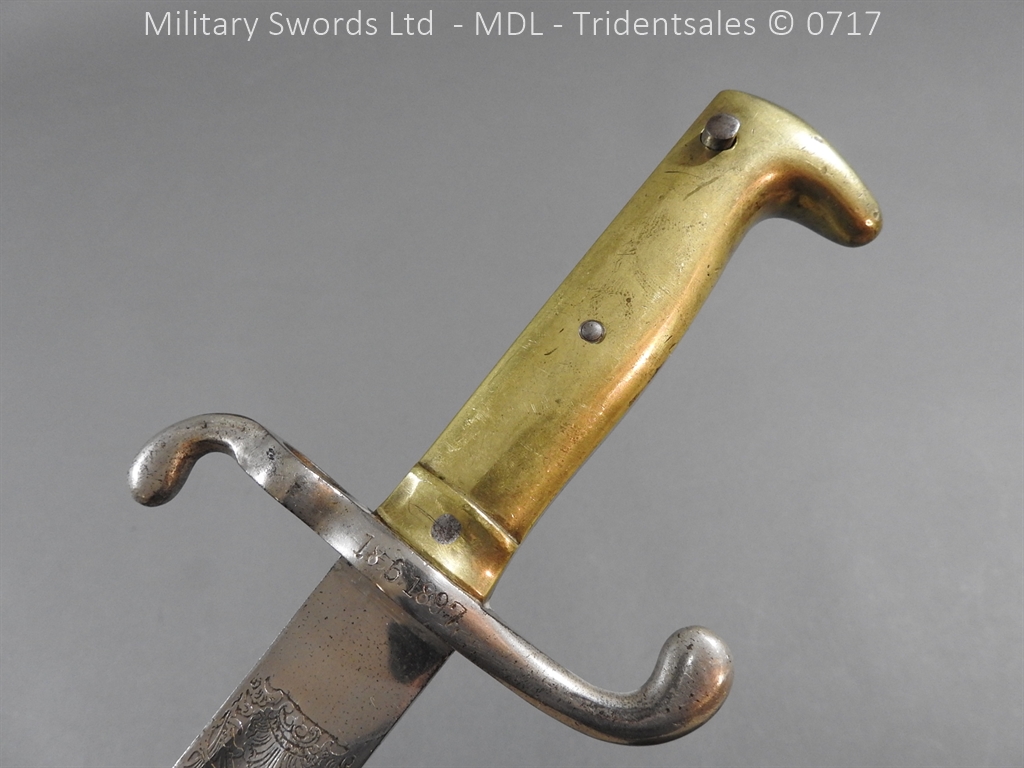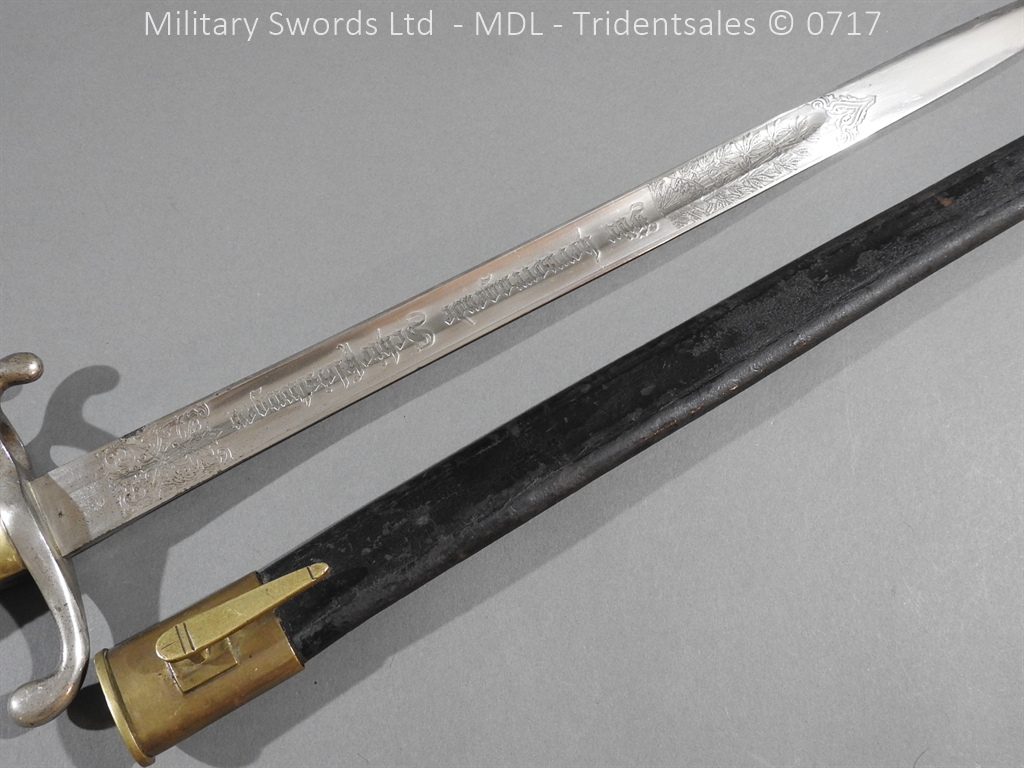 M/71 Cadet slim type – Lined brass hilt with a T slot, a round steel push button with an external leaf spring held by a screw, S shape steel crossguard with upturned quillion and muzzle ring, rear of the guard unmarked. Single edge flat steel sawback blade without fullers stamped King & Knights Head above WK&C. with trophies of arms and floral pattern etched in a panel, the back edge of the blade etched with the retailer/owner J. Thonnes Koblenz. Brass mounted black leather scabbard