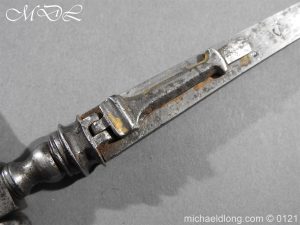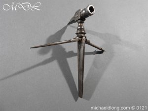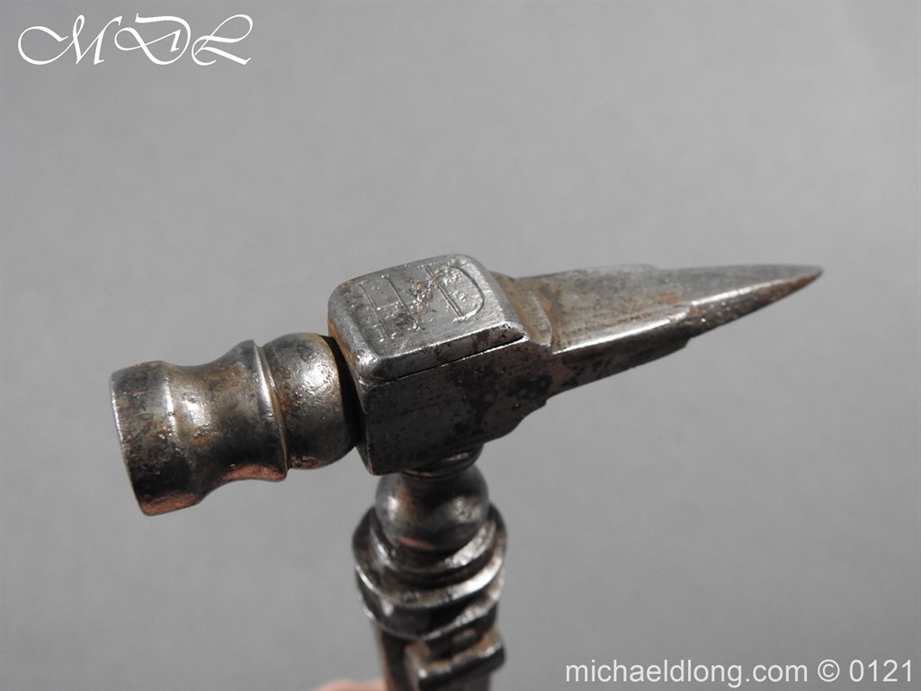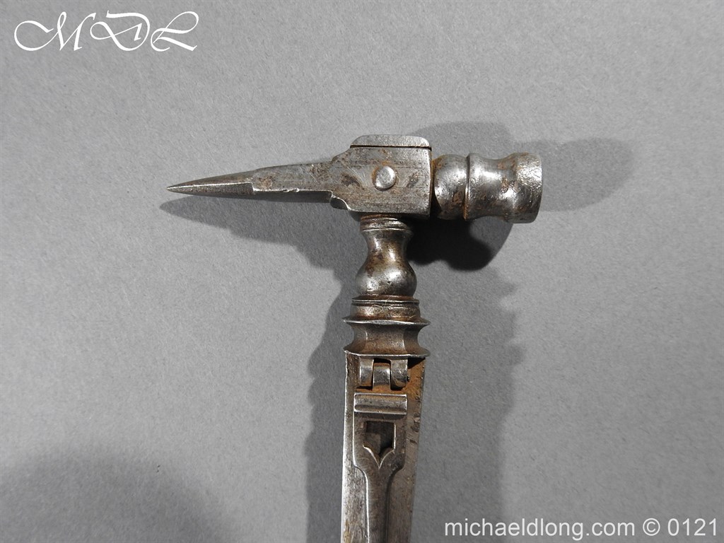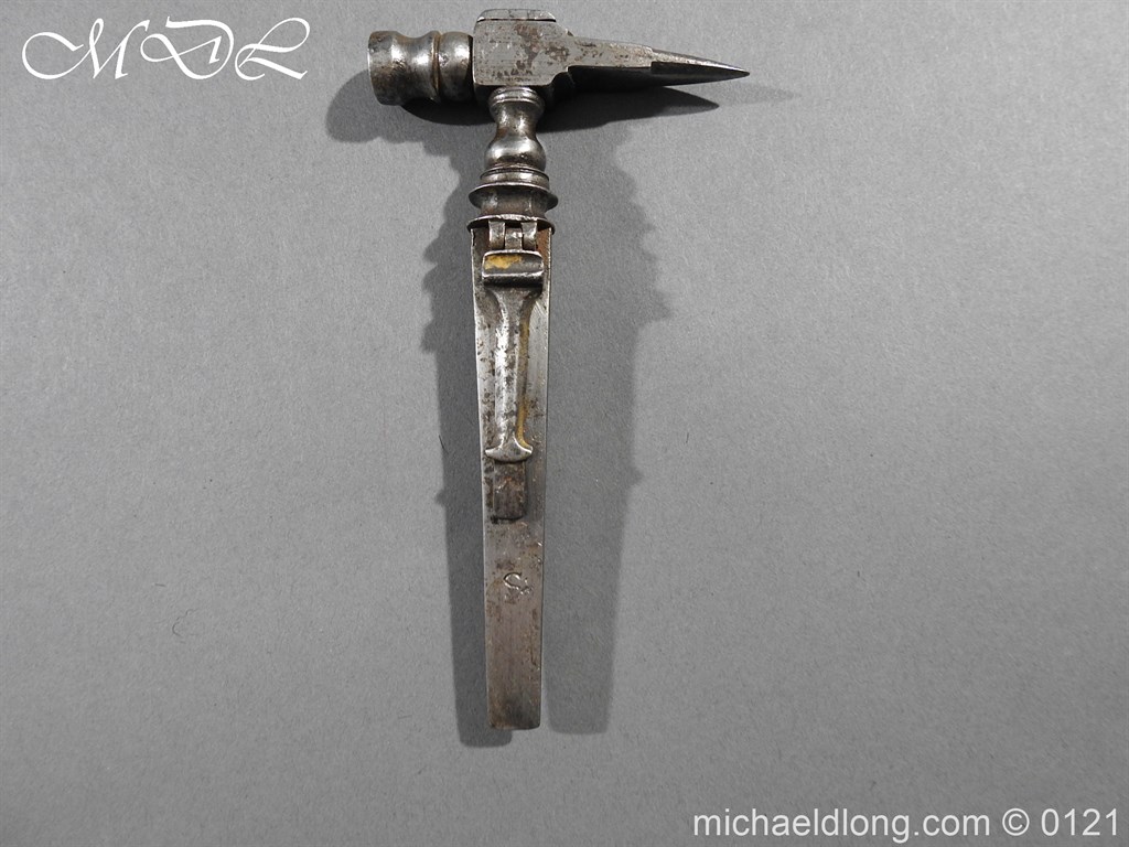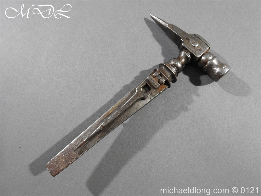 German Wheellock Combination Tool the main head seems to have been based on war hammer judging from the design. The hammer head with spanner and to the rear a spike. Turned shaft leading to a large flattened screwdriver with a fold out small screwdriver and spike one to each side which lay flat when not being used. Overall length 15cm