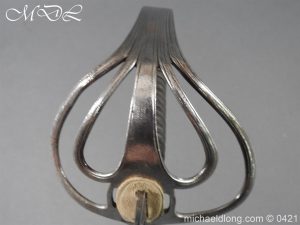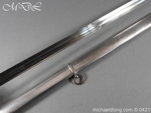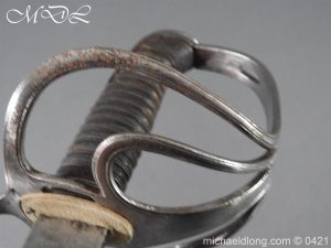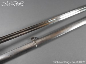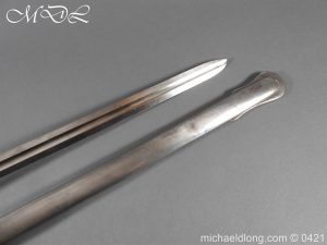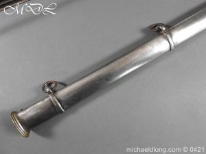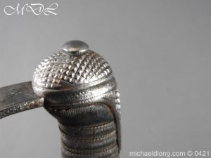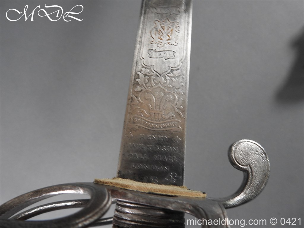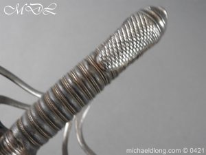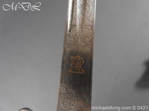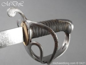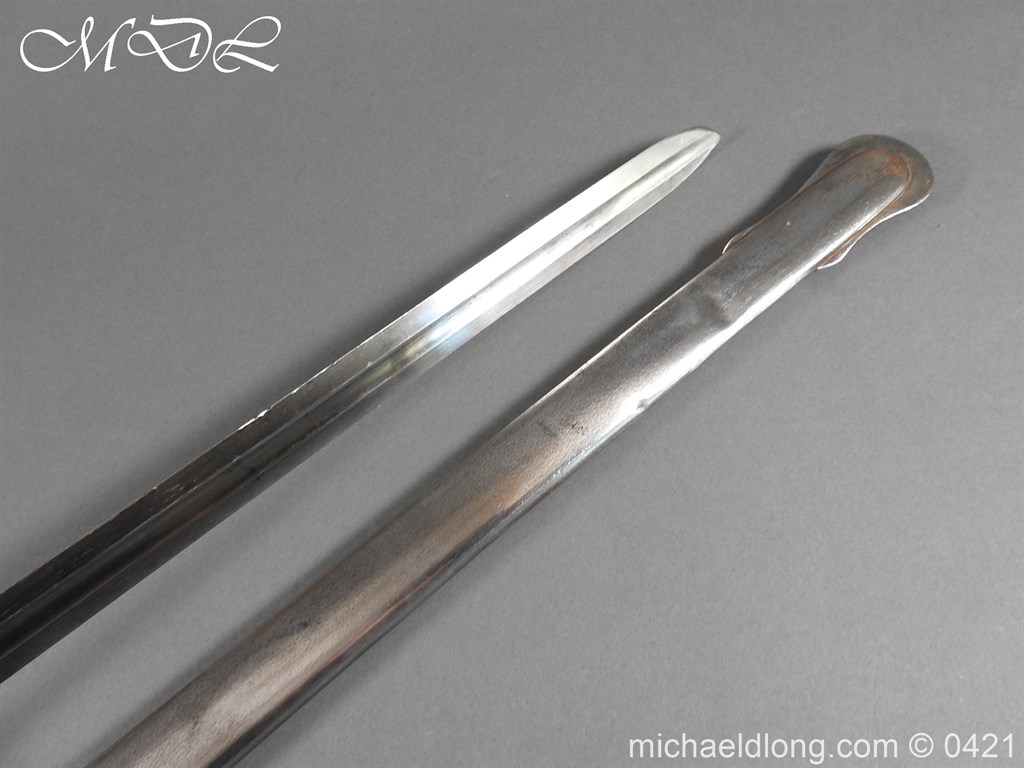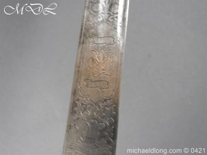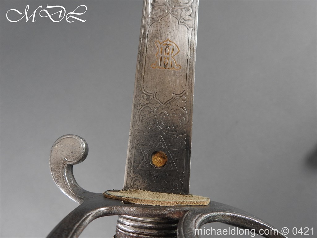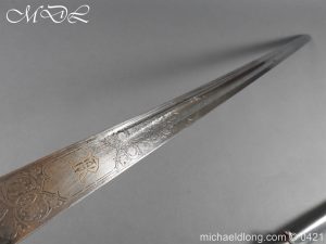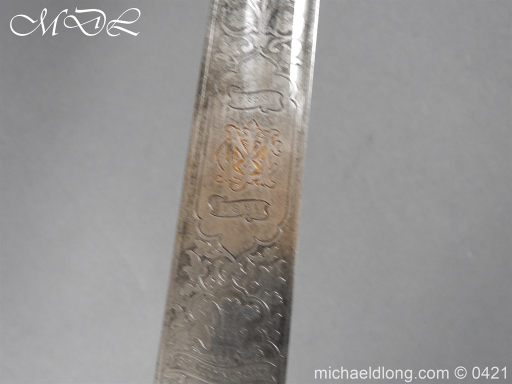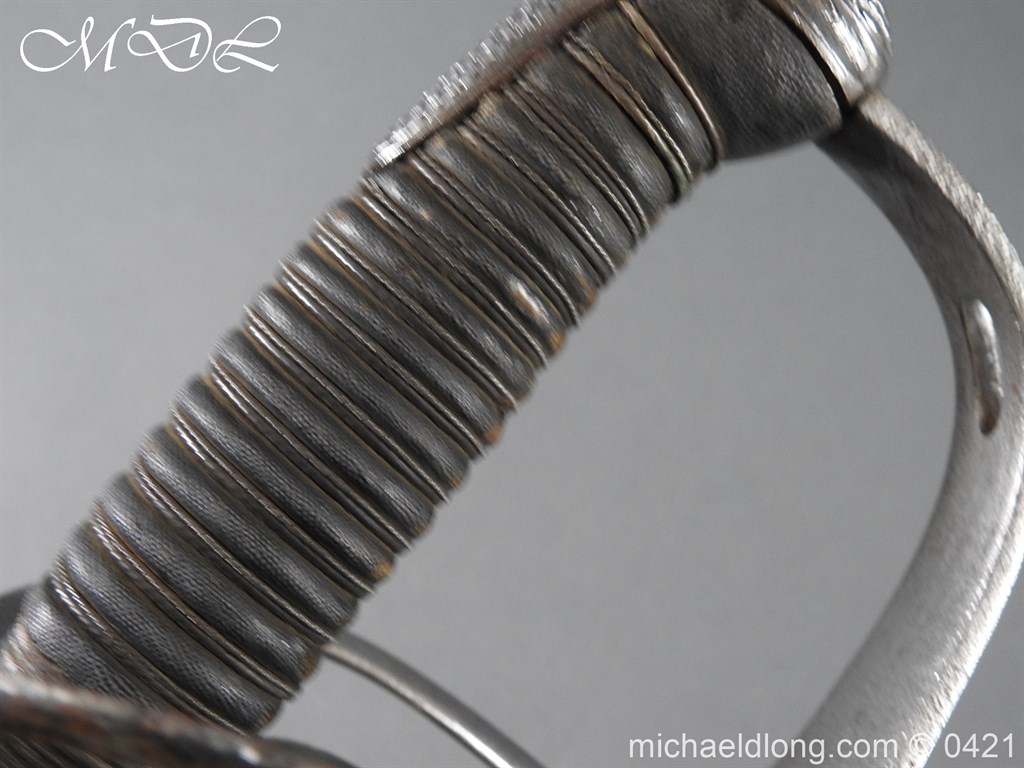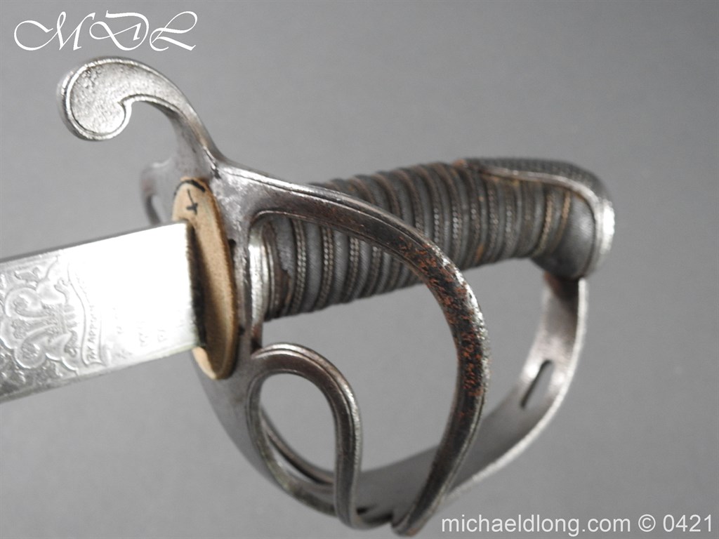 Gloucestershire Hussars Yeomanry Cavalry Officer’s Sword. The hilt with two bard each side, French style chequered domed pommel with fish skin grip secured by silver wire. The straight spear point blade with narrow top fuller and centre fuller to point. The blade is engraved with the monogram which seems to be HR and the reverse with FROM MJC 1881