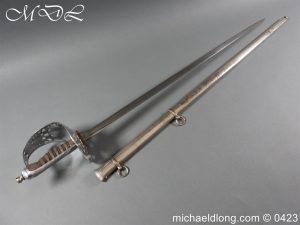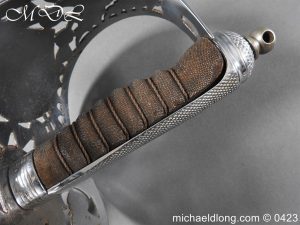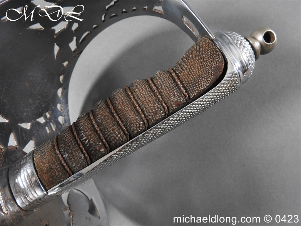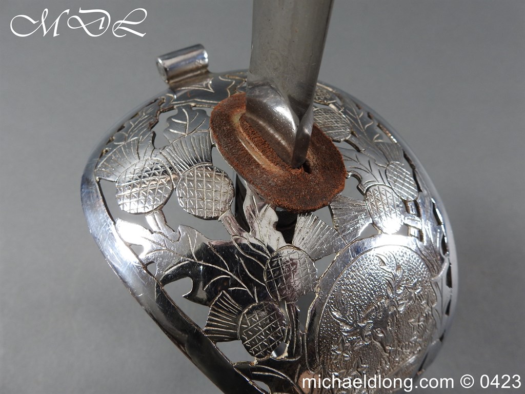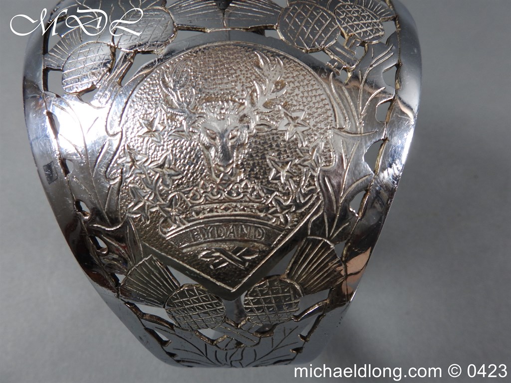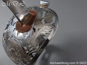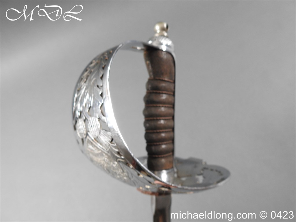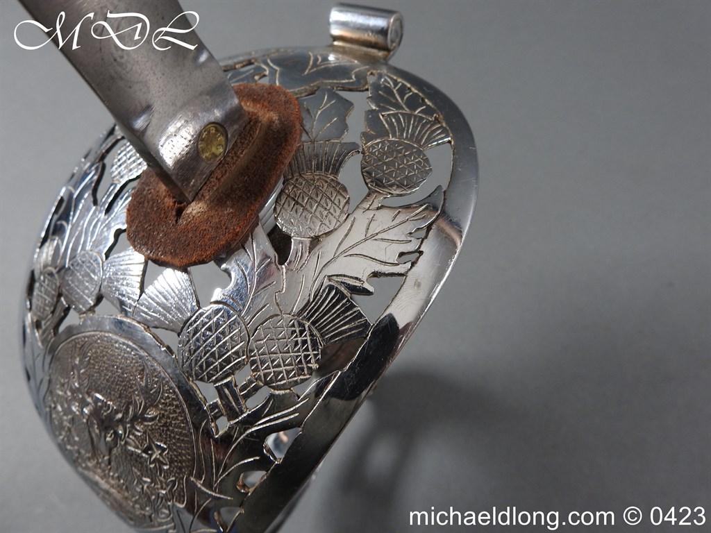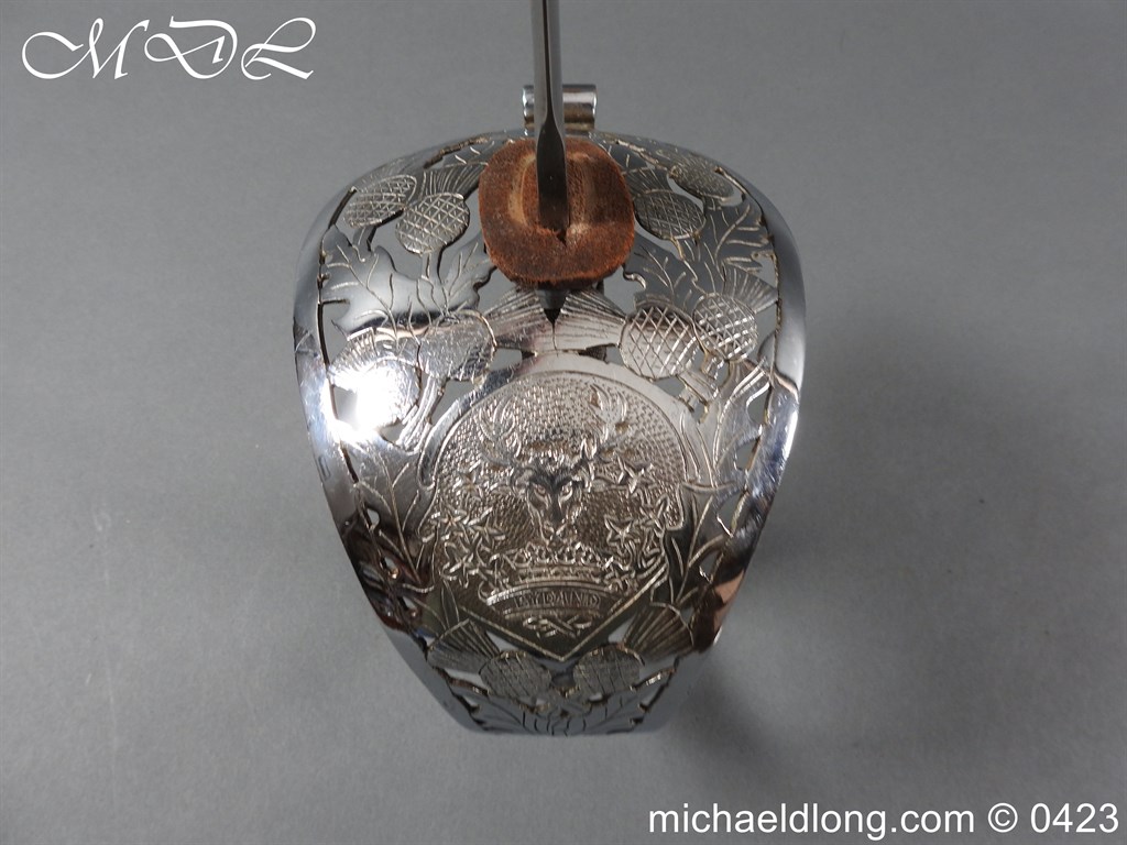 Gordon Highlanders Field Officer’s Sword the removable steel basket pierced with thistle design and regimental badge and complete with fish skin covered grip with chequered pommel. The broadsword blade is pain the with traces of etched at the hilt and complete with correct steel scabbard overall length 358 inch the blade 31 inch. Note this patten of sword is also carried by The Royal Scots Fusiliers, kings Own Scottish Borderers and the Highland Light Infantry each having there own regimental device on the hilt