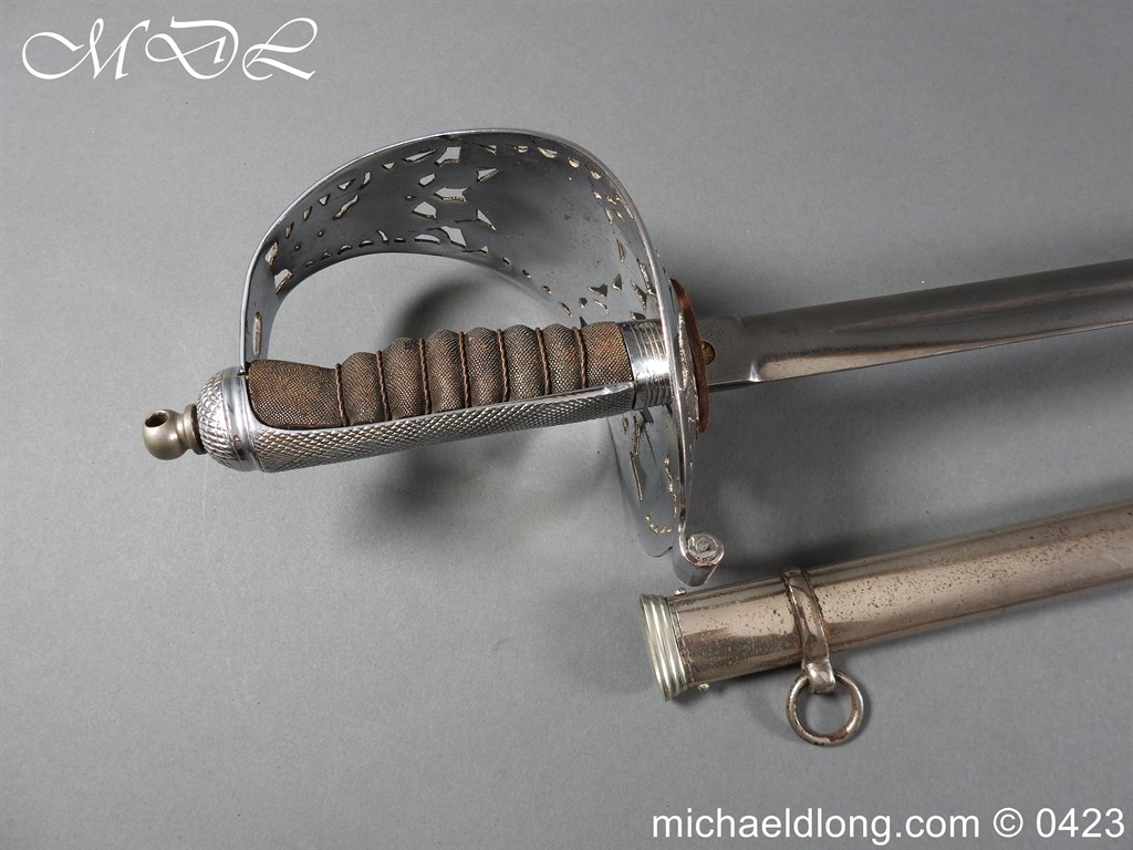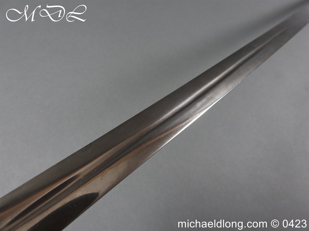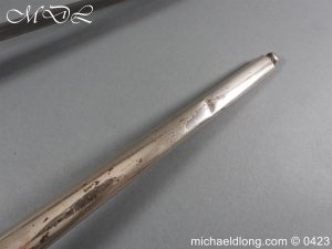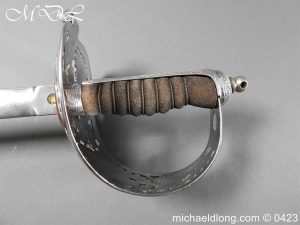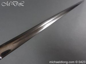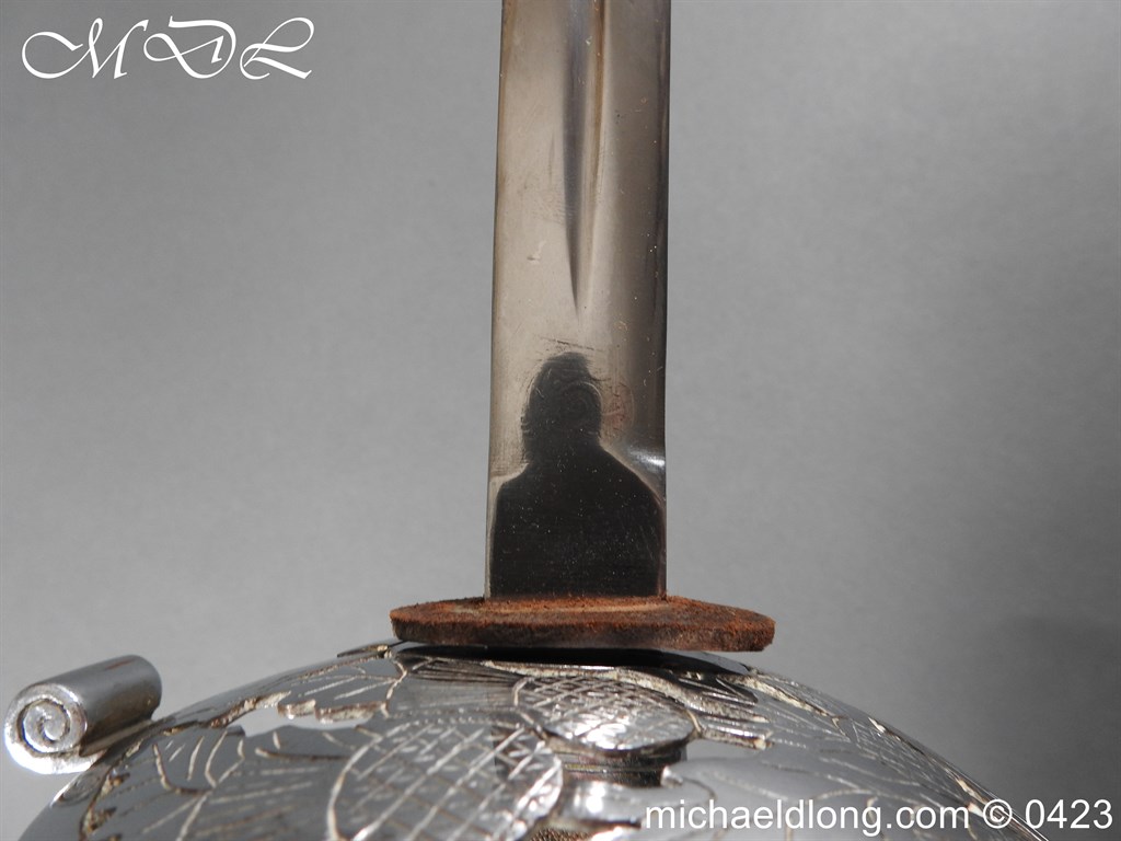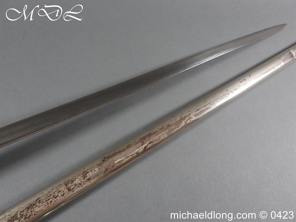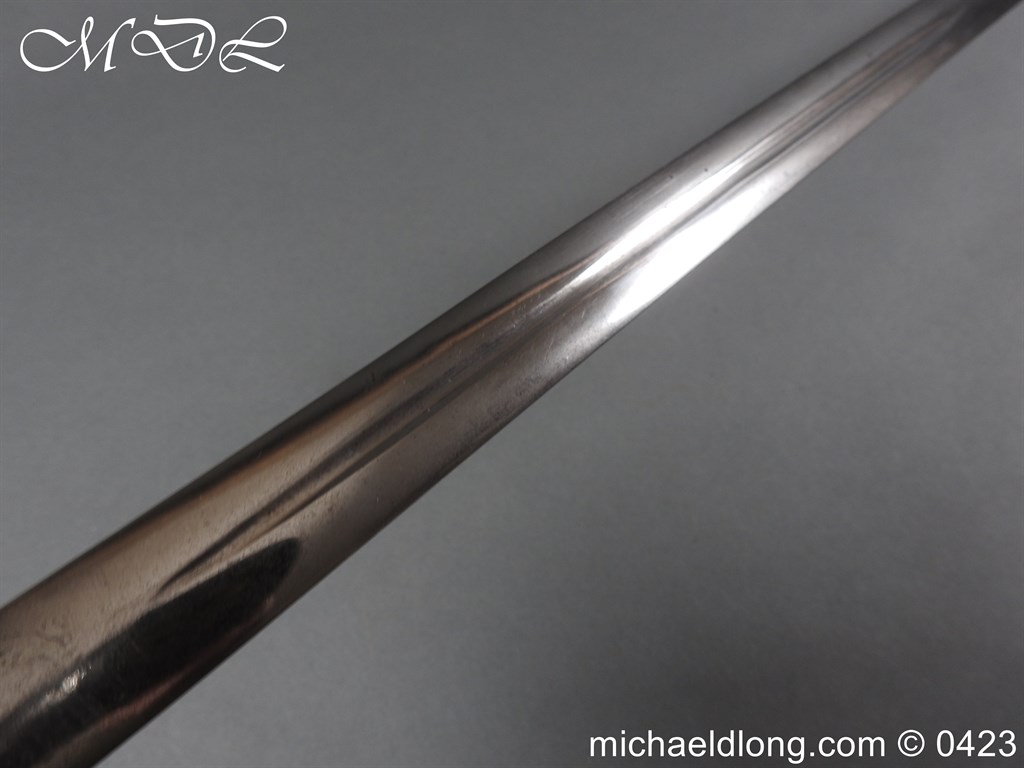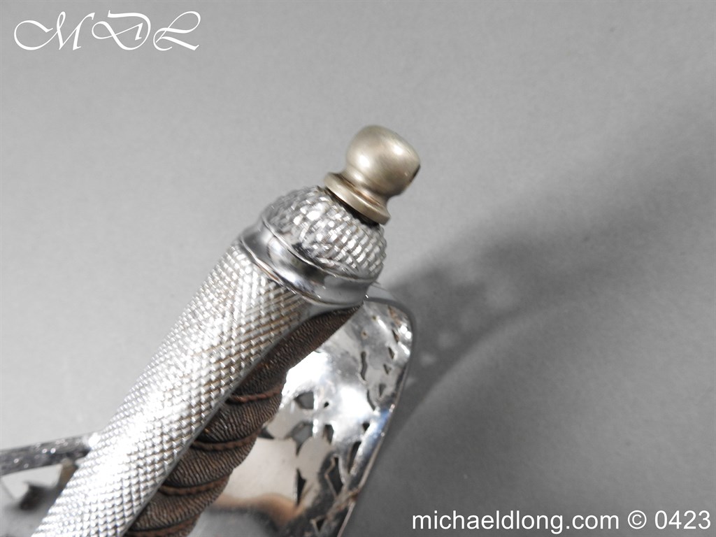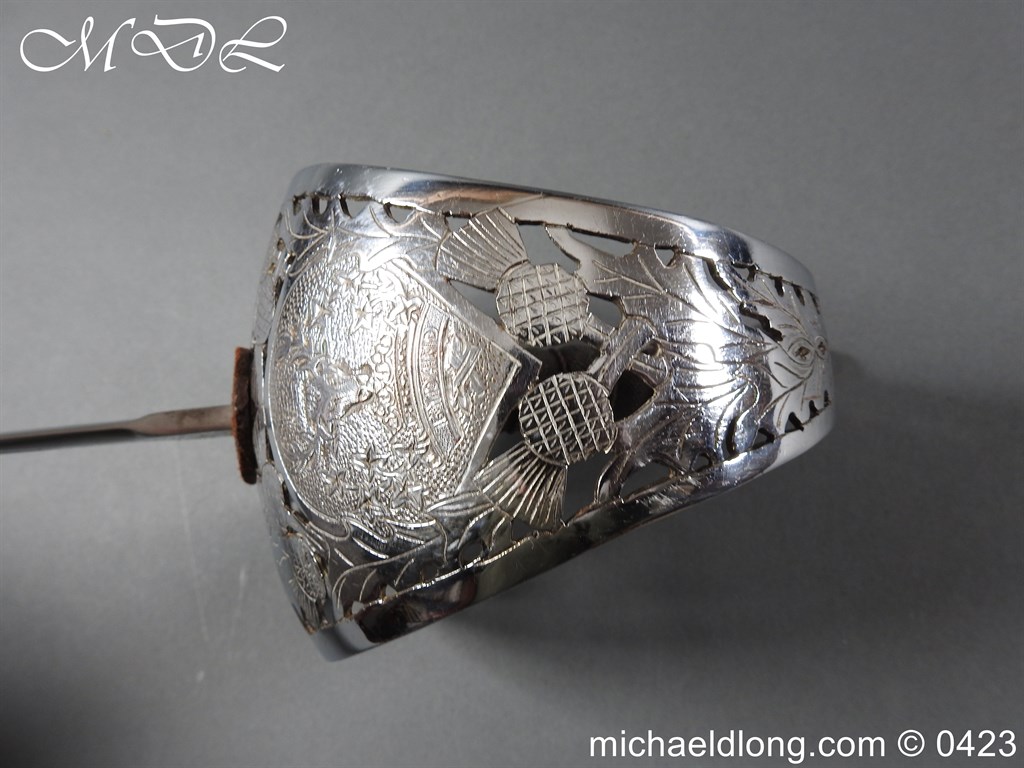 Gordon Highlanders Field Officer’s Sword the removable steel basket pierced with thistle design and regimental badge and complete with fish skin covered grip with chequered pommel. The broadsword blade is pain the with traces of etched at the hilt and complete with correct steel scabbard overall length 358 inch the blade 31 inch. Note this patten of sword is also carried by The Royal Scots Fusiliers, kings Own Scottish Borderers and the Highland Light Infantry each having there own regimental device on the hilt