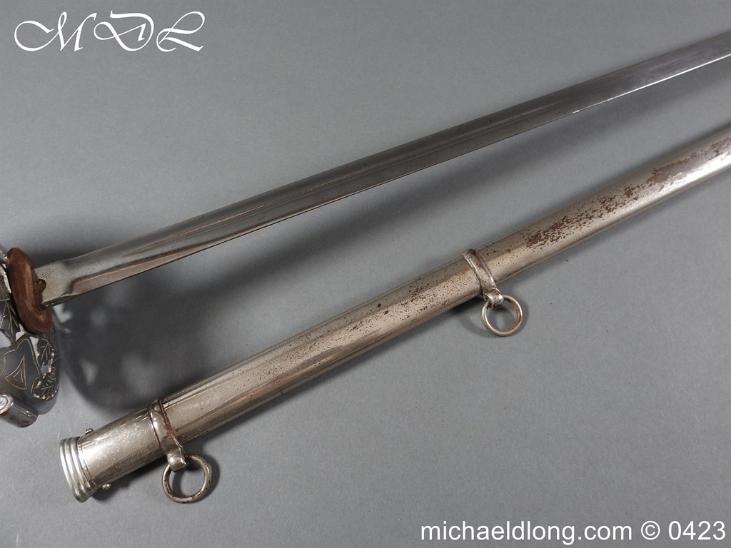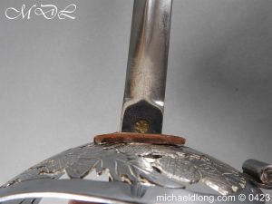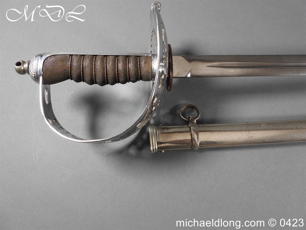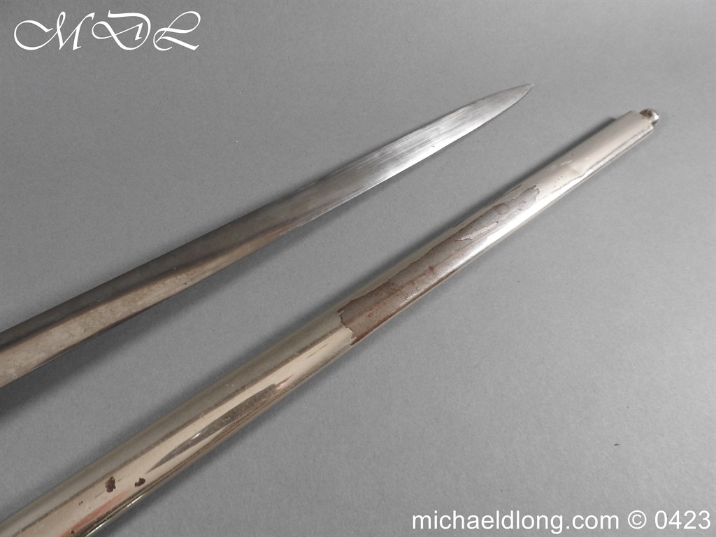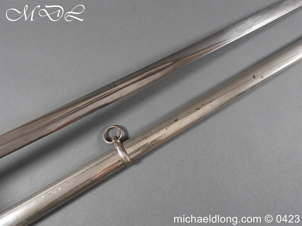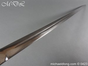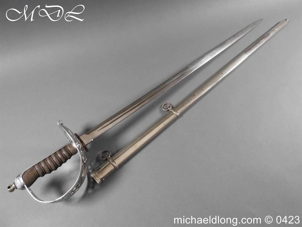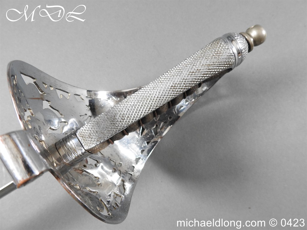 Gordon Highlanders Field Officer’s Sword the removable steel basket pierced with thistle design and regimental badge and complete with fish skin covered grip with chequered pommel. The broadsword blade is pain the with traces of etched at the hilt and complete with correct steel scabbard overall length 358 inch the blade 31 inch. Note this patten of sword is also carried by The Royal Scots Fusiliers, kings Own Scottish Borderers and the Highland Light Infantry each having there own regimental device on the hilt