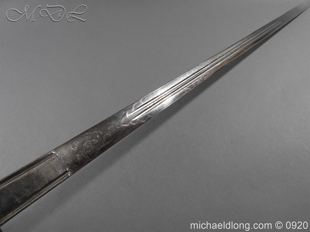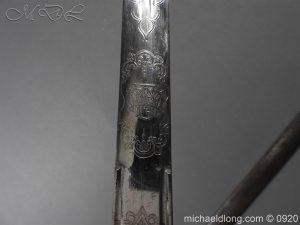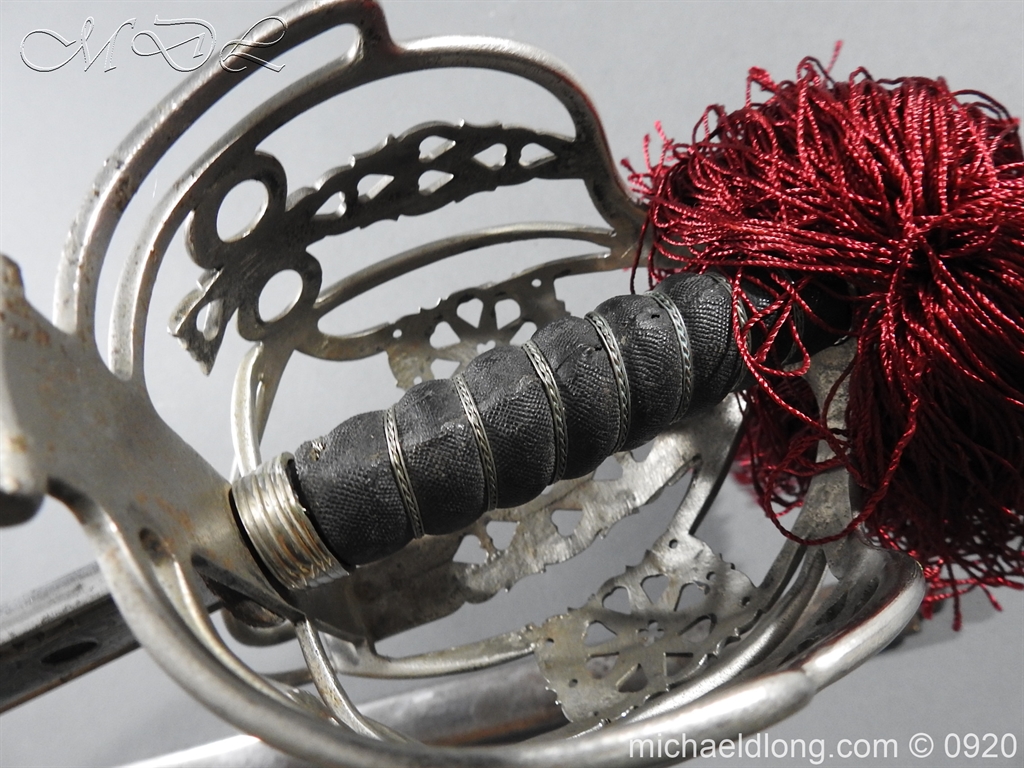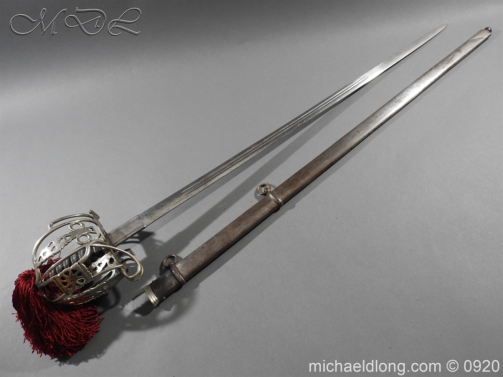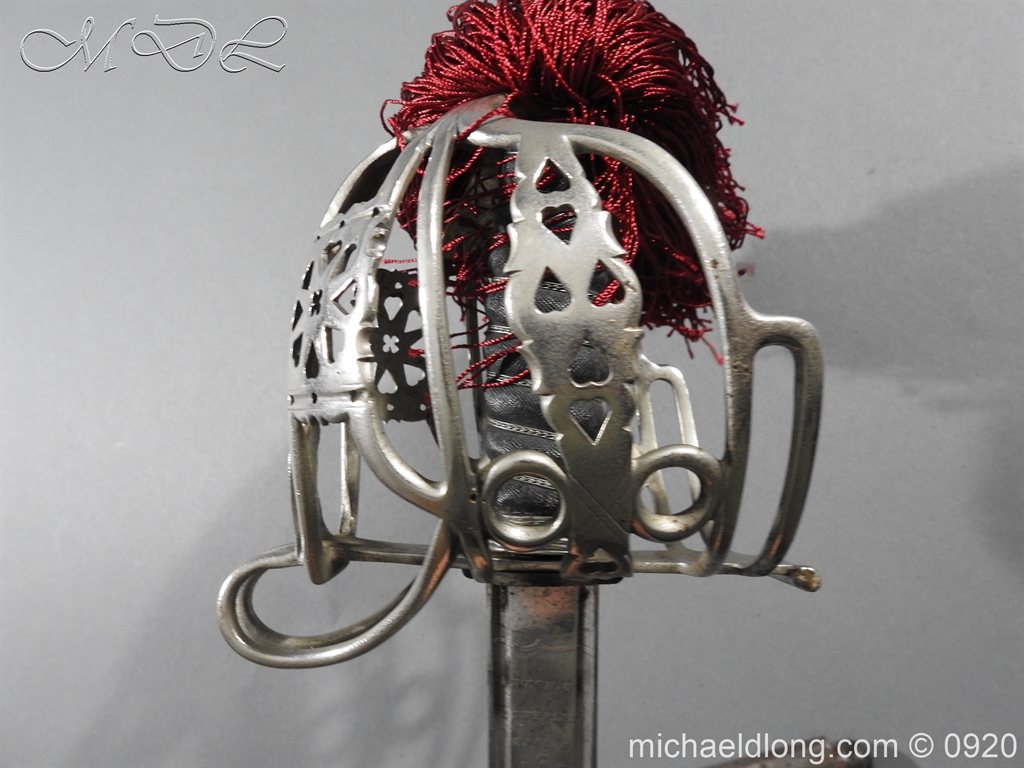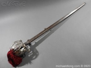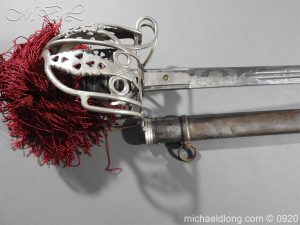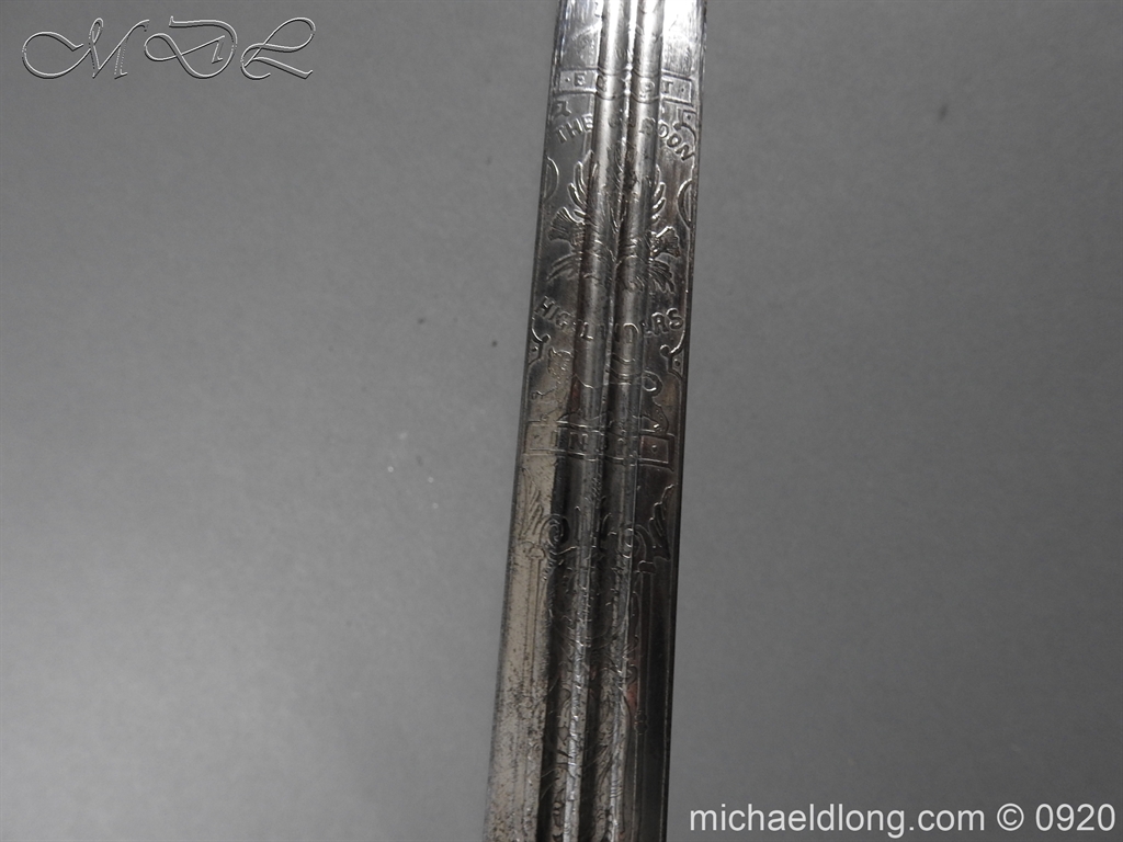 Scottish Gordon Highlanders Officer’s Sword Victorian nice regulation basket with fish skin grip and fringe. The board sword blade well etched with VR and crown the reverse with regimental badge and owners initials in the form of a monagram so very hard to read all surrounded by floral decoration. Retailed by Marshall and Aitkens Edinburgh and complete with steel scabbard overall length 40 inches blade 33 inches Although the monagram is hard to read and made ip of 4 initials some research has been done and it is possible the sword belonged to BAIRD, ALEXANDER WALTER FREDERIC – BAIRD, ALEXANDER WALTER FREDERIC, Lieutenant, was born 2 October 1876, son of Sir Alexander Baird, Baronet, and the Honourable Annette Palk, daughter of the 1st Baron Haldon. He was educated at Eton (Cricket Eleven, 1894, 1895), and New College, Oxford, and joined the Army 15 May 1897, as a Second Lieutenant in the Gordon Highlanders; was