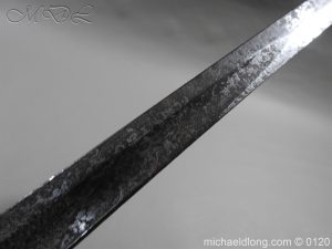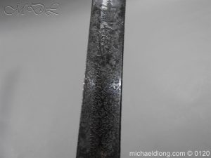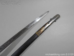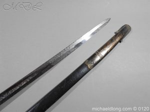 Very interesting sword pre regulation 1854 pattern although produced by Wilkinson Sword in 1854 number 5313. The sword is a pattern 1822 with folding guard however has a Wilkinson solid steel gilt and patent tang with oringal leather liner. The slightly curved blade etched with VR Crown flaming grenade and owners crest and motto plus Henry Wilkinson Pal Mall London Patent Solid Hilt the spin numbered 5313. It is complete with black leather scabbard with gilt mounts. Arthur Edward Valette Ponsonby was born on 4 December 1827 in Malta, the son of Major-General Frederick Ponsonby and a nephew of the 4th Earl of Bessborough. In 1850 he was commissioned into the Grenadier Guards and stayed with them until 21 April 1863 when he transferred to the Suffolk Regiment to take command of their 2nd Battalion, then serving in Dublin. He was an unconventional soldier, full of enterprise and ideas. One of his first innovations was a battalion journal, the East Suffolk Gazette, believed to be the first such publication in the Army. His father Major General Hon. Sir Frederick Cavendish Ponsonby GCMG KCB KCH was at Waterloo Campaign, the 12th Light Dragoons were attached to Sir John Ormsby Vandeleur’s light cavalry brigade. At the Battle of Waterloo, the 12th and 16th Light Dragoons were told to charge down the slope, but no further, to support the withdrawal of the Union Brigade of heavy cavalry. But, like the Union Brigade (led by his second cousin, William Ponsonby), the light horse charged (as he later admitted) too far.
