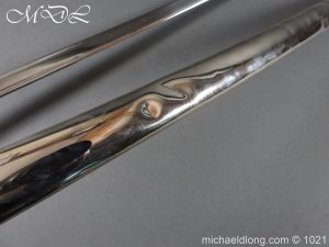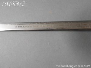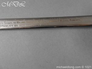 Grenadier Guards Officer’s Sword by Wilkinson Sword London number 6767 special order with scroll hilt, chequered back strap and pommel cap. The Toledo blade in super condition engraved with Victorian crown flaming grenade with owner initials and crest the reverse with single battle honour SEVASTOPOL. The top edge of the sword dated May 1856 and number 6767 the bottom edge Henry Wilkinson Pall Mall London complete with parade scabbard. Presentation panel towards tip reads as follows: This sword belonged to Colonel The Hon BLE John Constantine Stanley Grenadier Guards whilst serving from 1857 to 1862 as ADC to Earl Canning Viceroy of India. It was given by Colonel Stanley on leaving the Viceroy’s staff to Major Roberts V C ( afterwards F M Earl Roberts) who returned it to Mrs Stanley on her husbands death. Lieutenant-Colonel Stanley also served in the Crimea and was entitled to the Medal and Sebastopol clasp along with the Turkish Medal