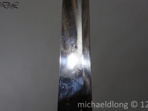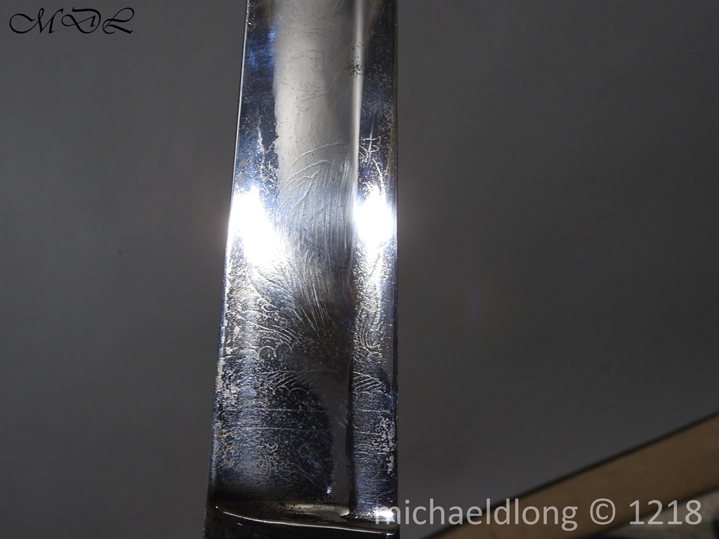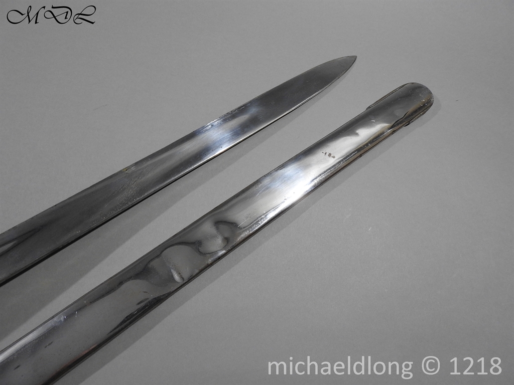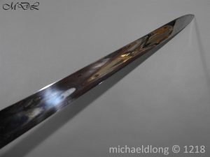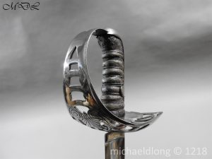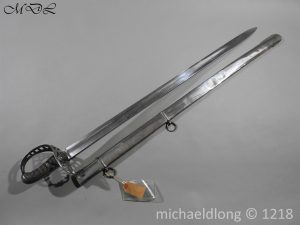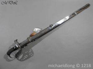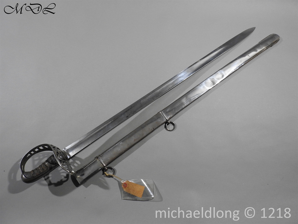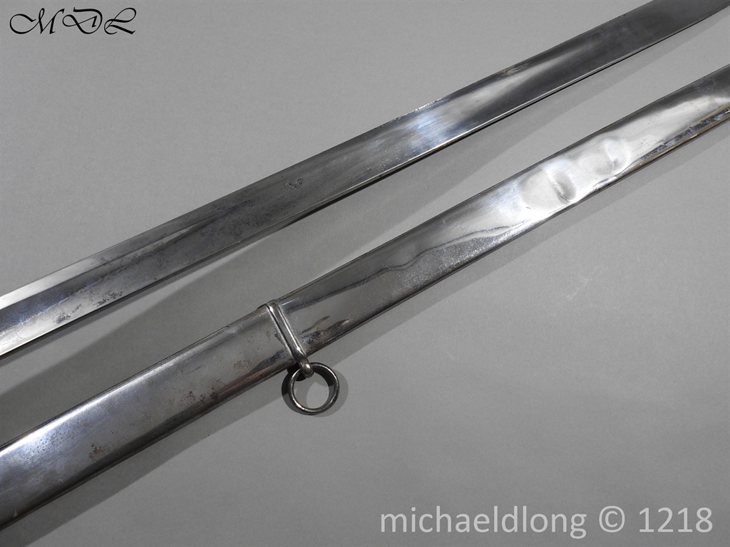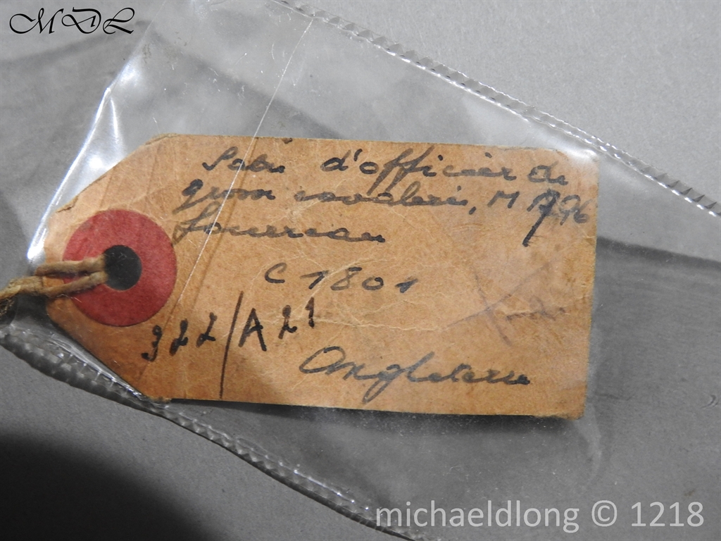 Heavy Cavalry Officer’s Undress 1796 Sword with regulation steel backet guard and wire bound leather grip please note age wear. Straight heavy cavalry blade which has been plated but the engraving is still visible including GR crown mounted officer and royal Coat of arms. Complete with correct scabbard which has a French muesum lable attached stating the pattern of sword and a date of c1804