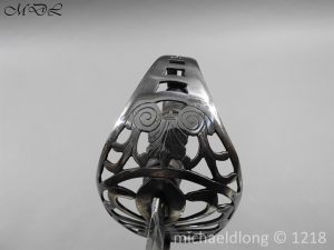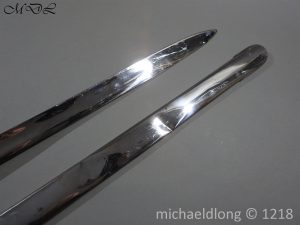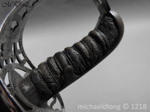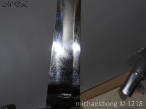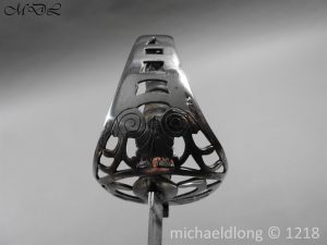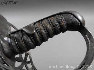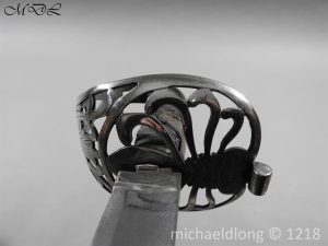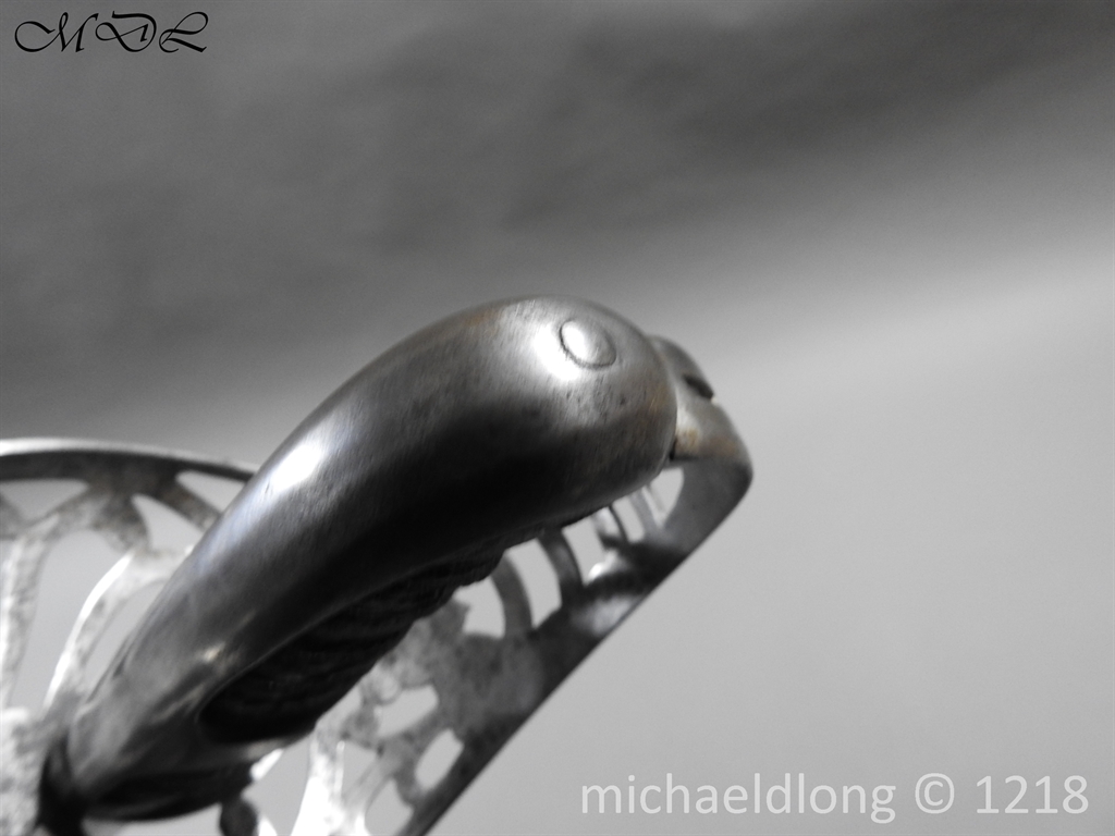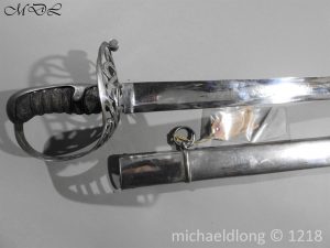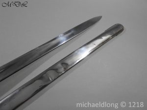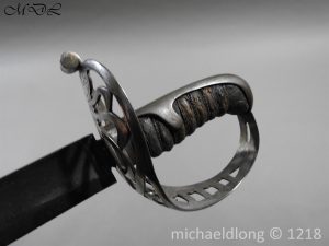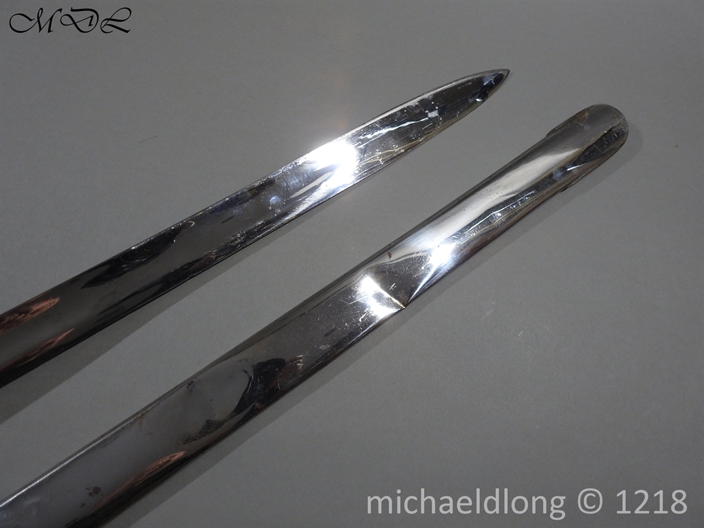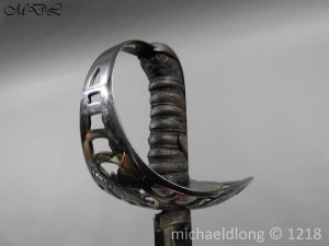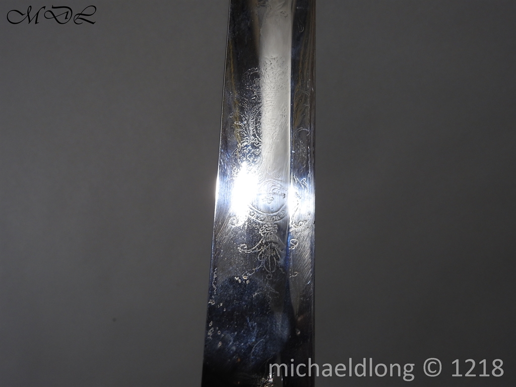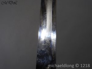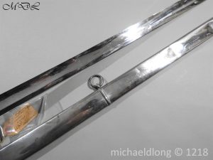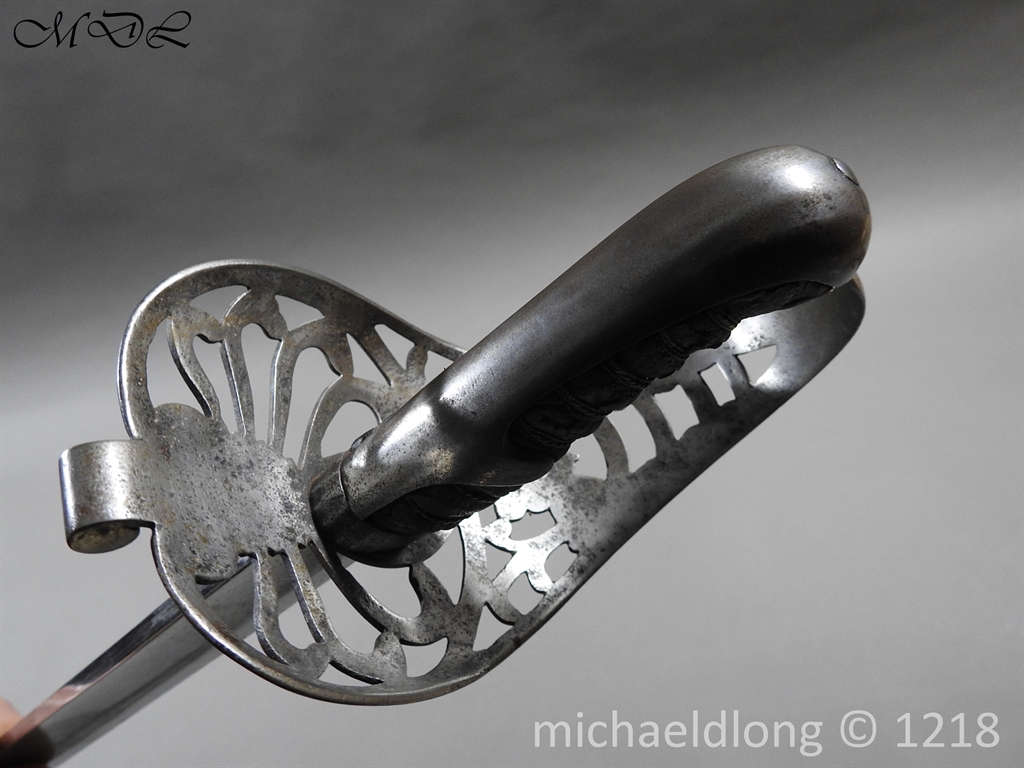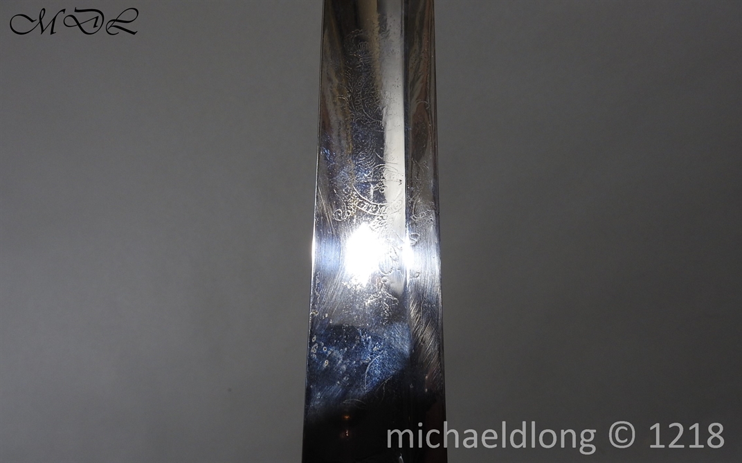 Heavy Cavalry Officer’s Undress 1796 Sword with regulation steel backet guard and wire bound leather grip please note age wear. Straight heavy cavalry blade which has been plated but the engraving is still visible including GR crown mounted officer and royal Coat of arms. Complete with correct scabbard which has a French muesum lable attached stating the pattern of sword and a date of c1804