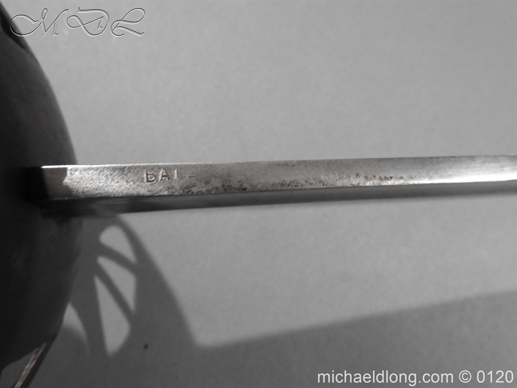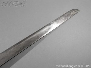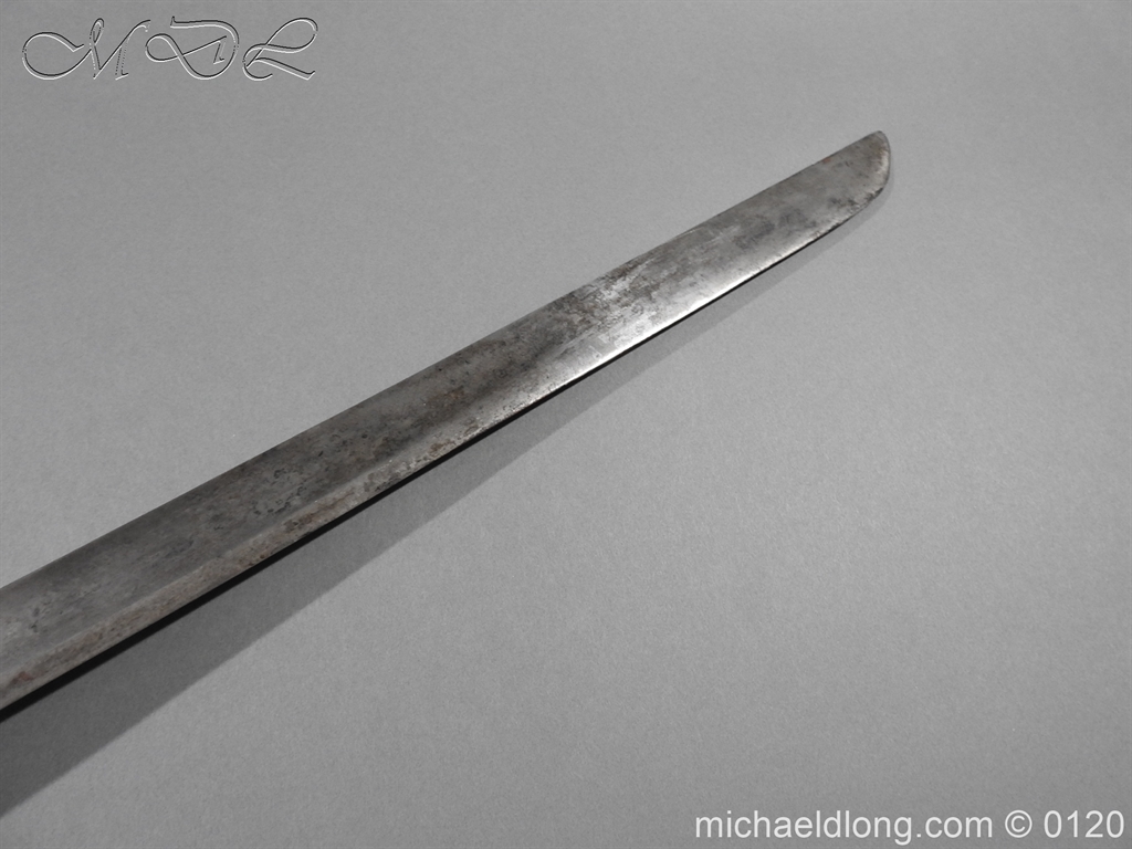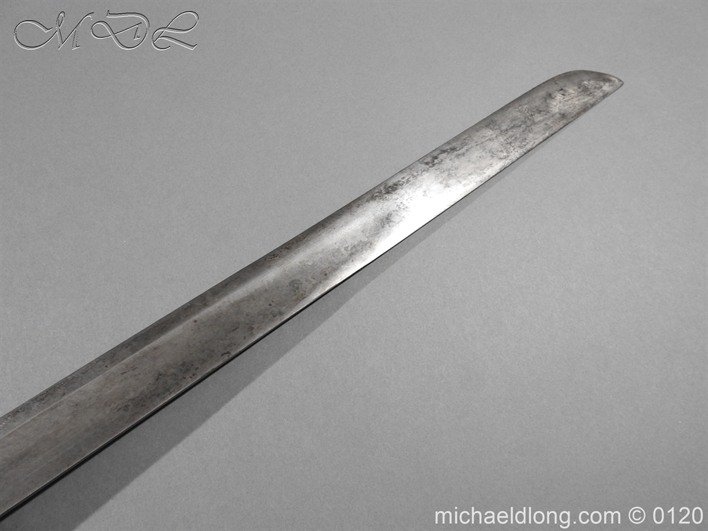 The straight blade is 89cm long 35 inches and identical to the 1796 heavy cavalry. Steel hilt which has blacked with ears secured through the tang and leather bound grip. Overall length 107cm 42 inches the spine of the bladed stamped Bate no scabbard
