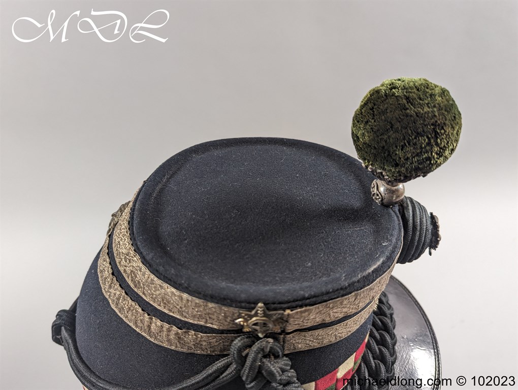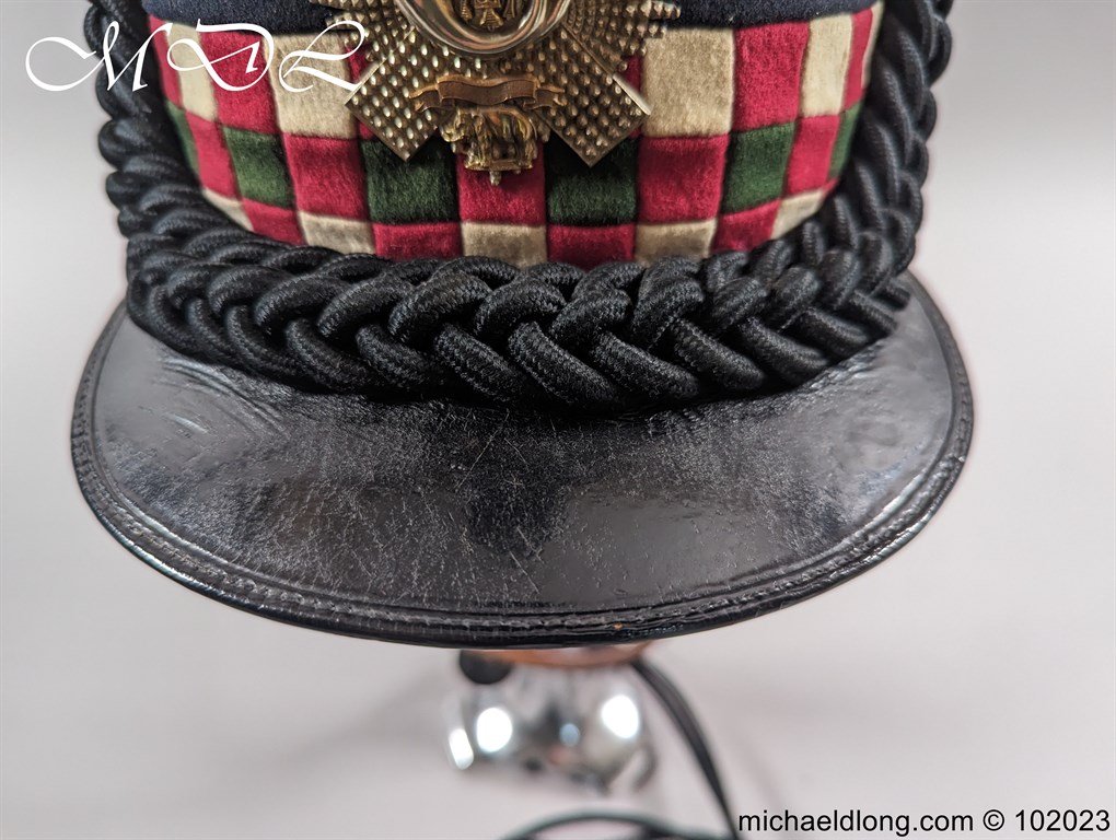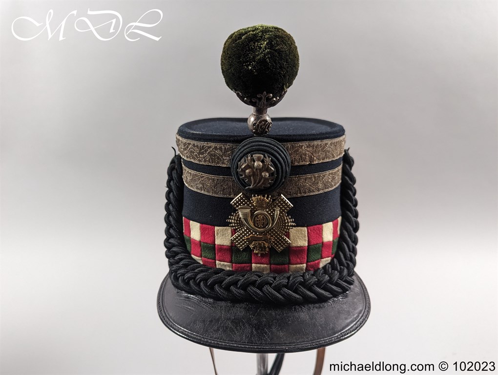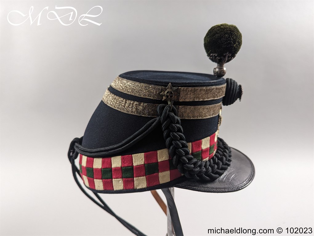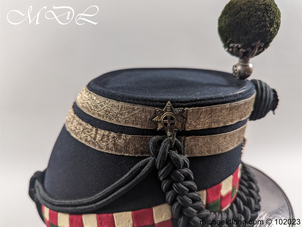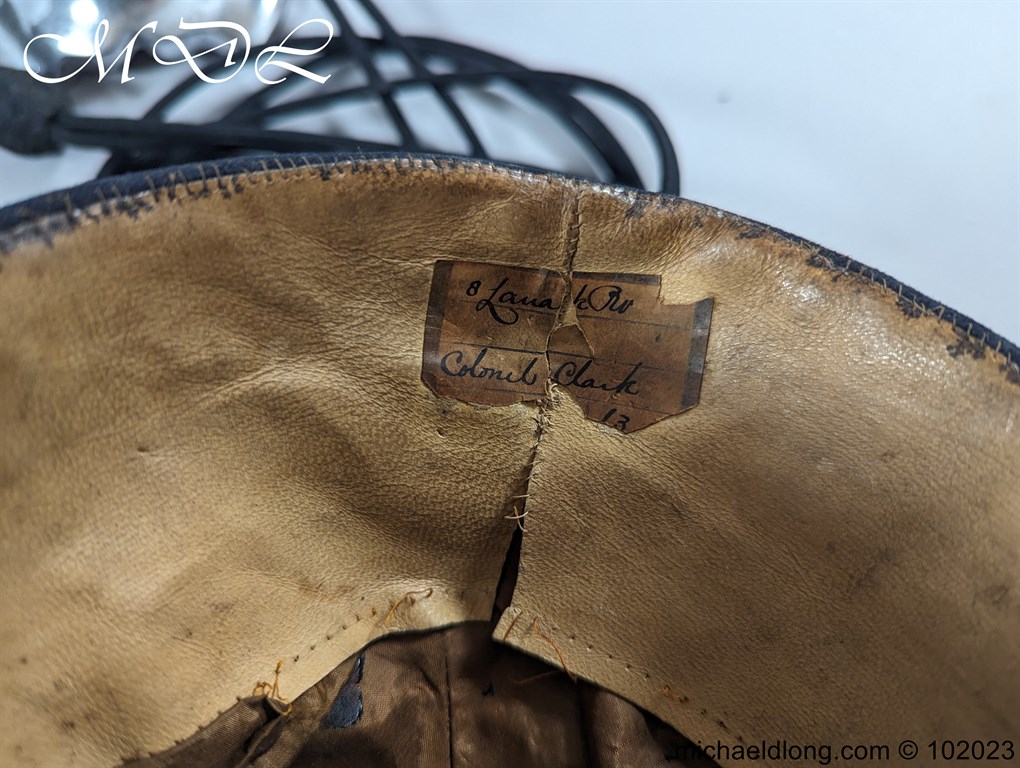 Highland Light Infantry Field Officer’s Shako named to Colonel Clark. A super quality example with dark blue body with diced band red-white-red and red-green-red plus two lines of silver lace to the top edge. To the front, a Kings crown regimental shako badge and black silk rosette mounted with a silver thistle device complete with plaited cap lines and black patent leather peak and chin strap. Complete with green pompom mounted on silver mounting with G R The interior is with leather sweatband and silk liner which is maker marked Herbert and Co London plus named label to rear, complete with storage tin